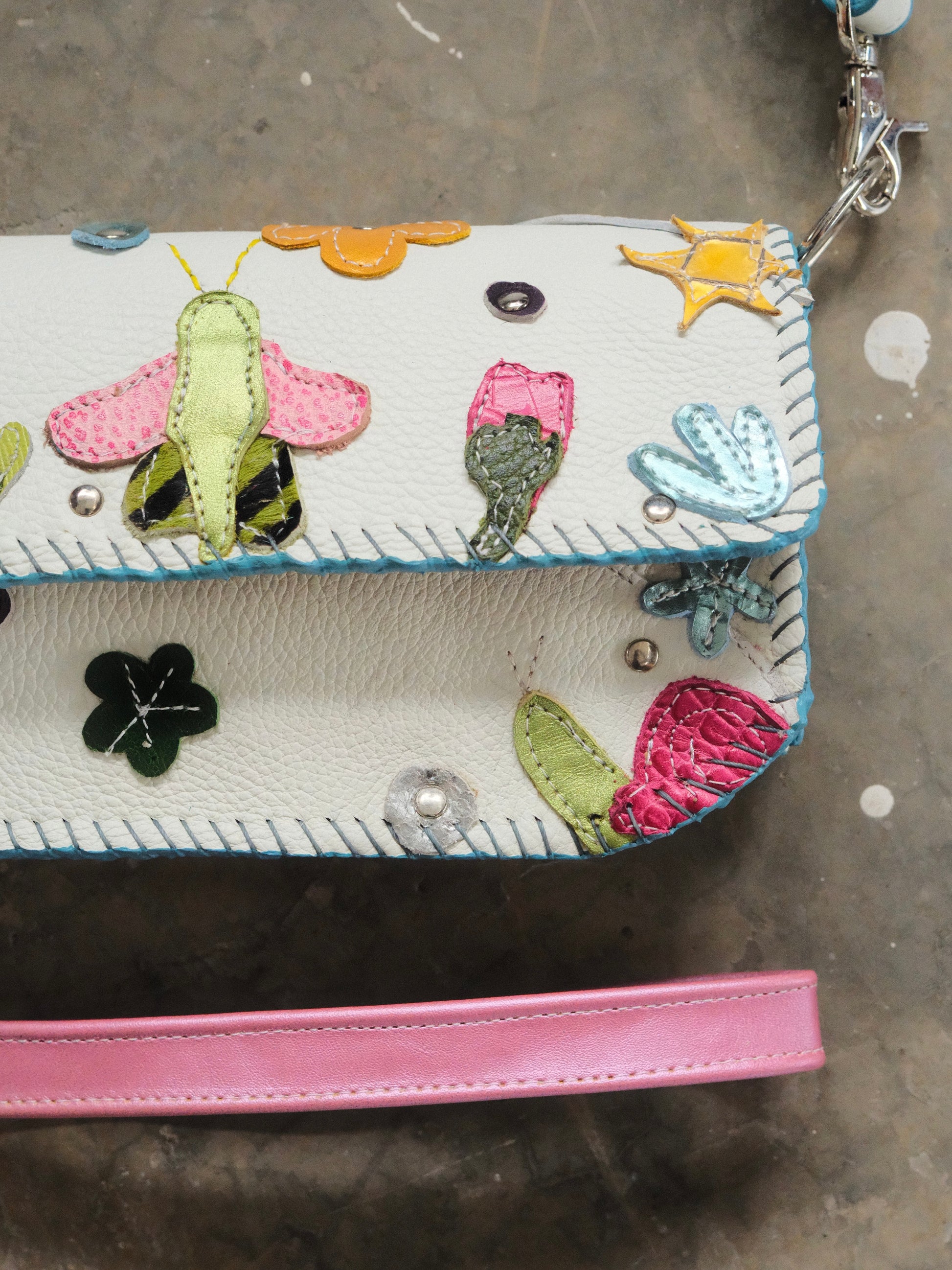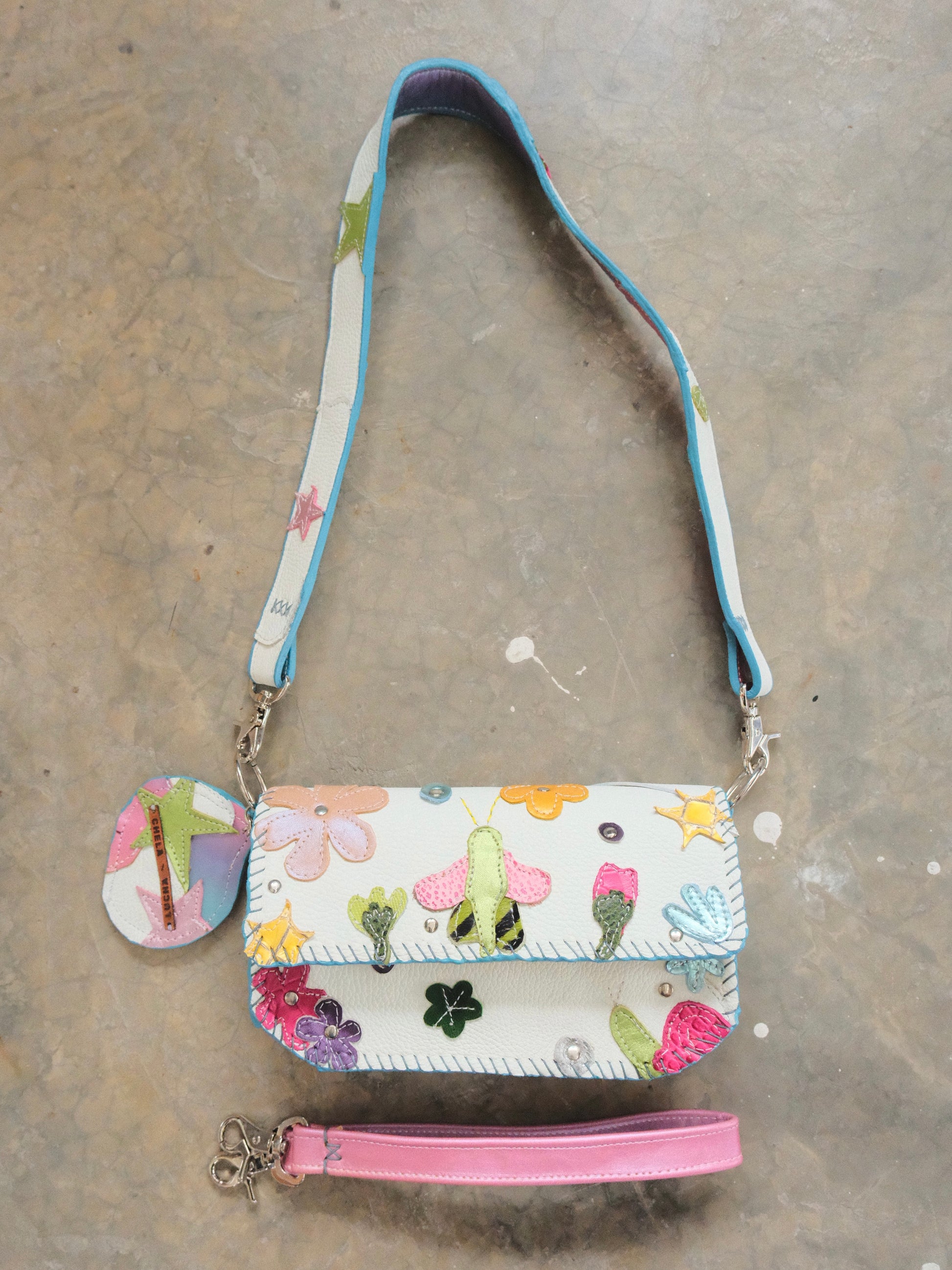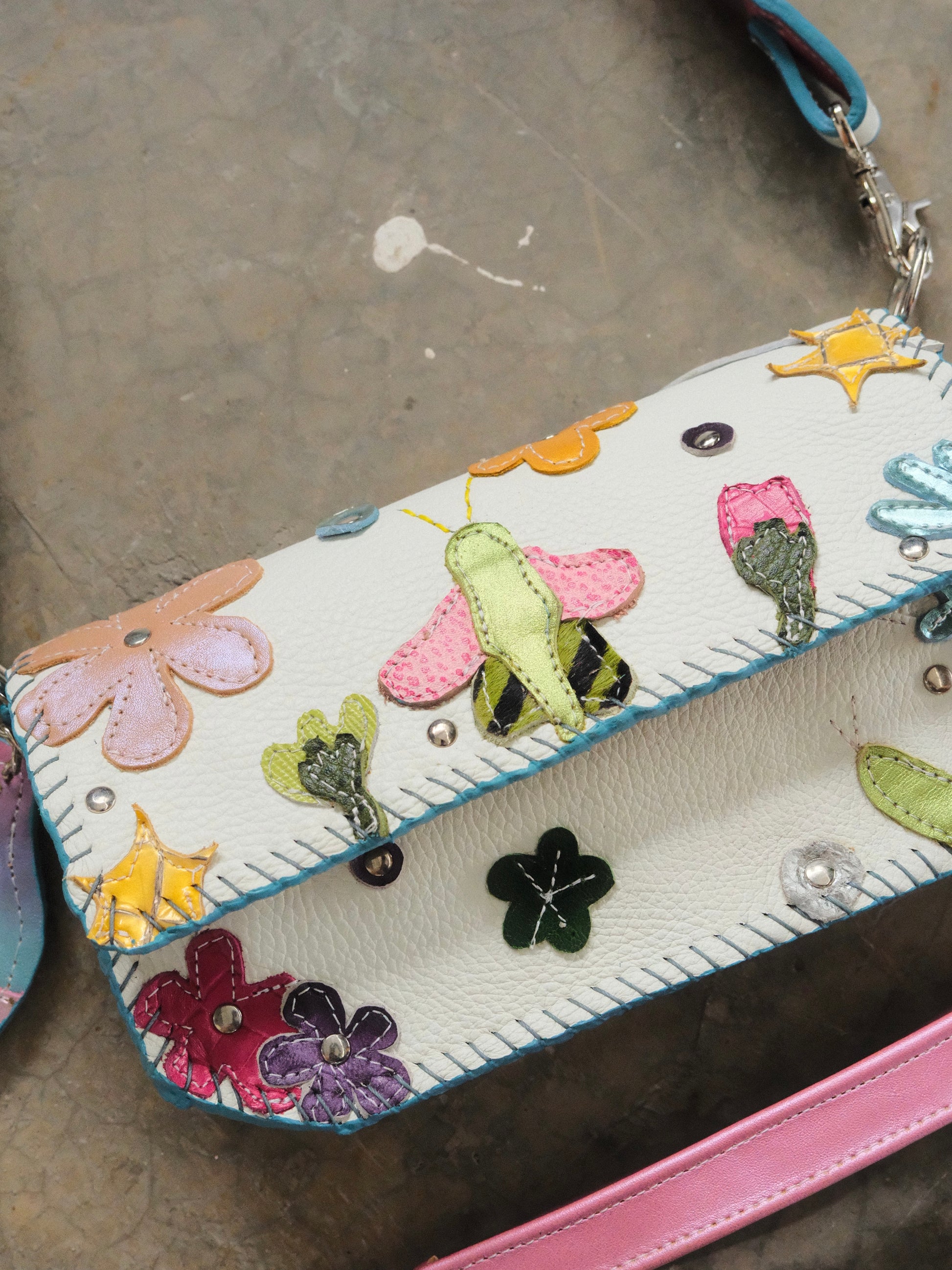 Bolsa LUPE hecha con pedacera de piel en tonos variados.