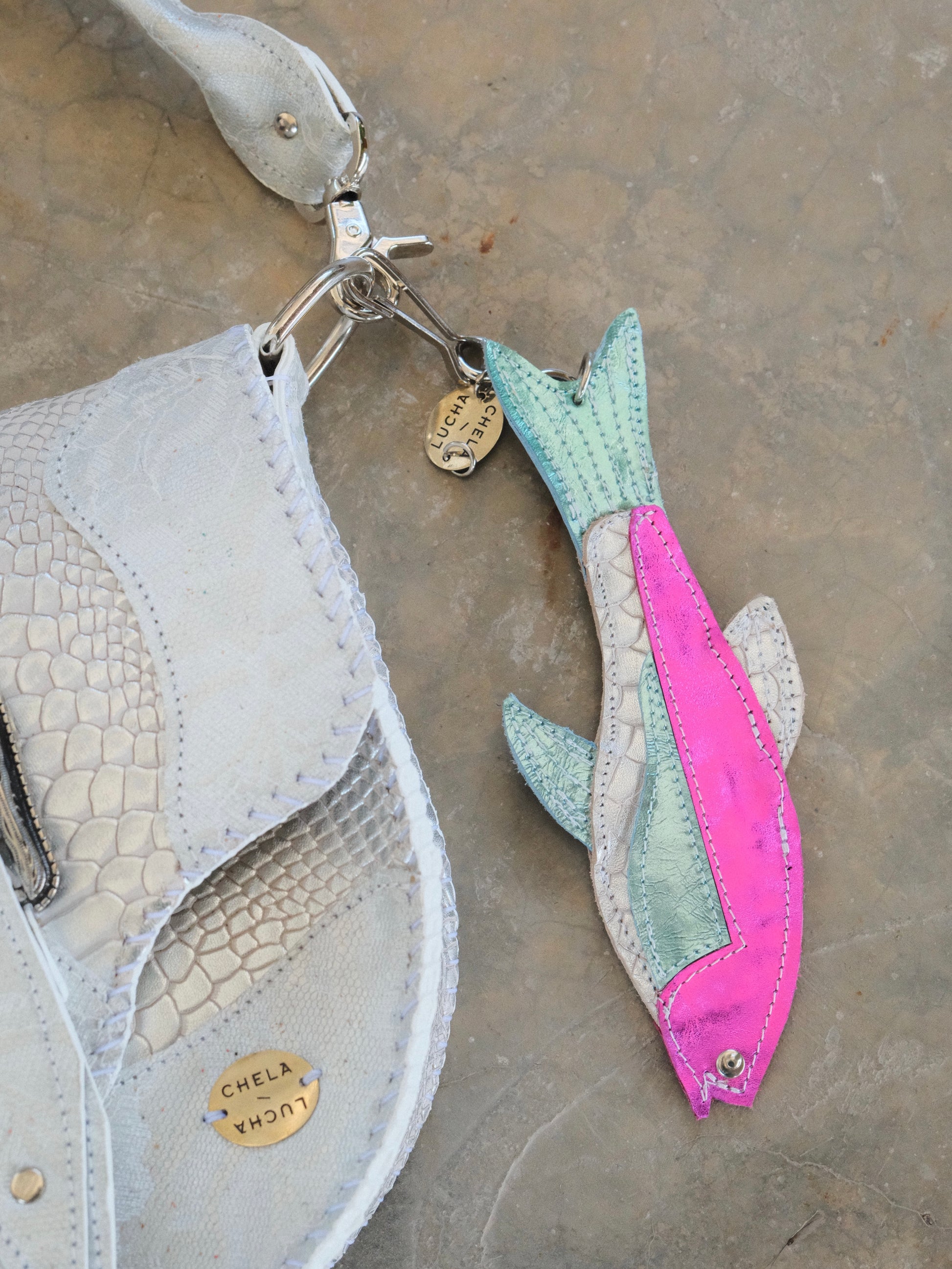 Llavero hecho con pedacera de piel en tonos variados.