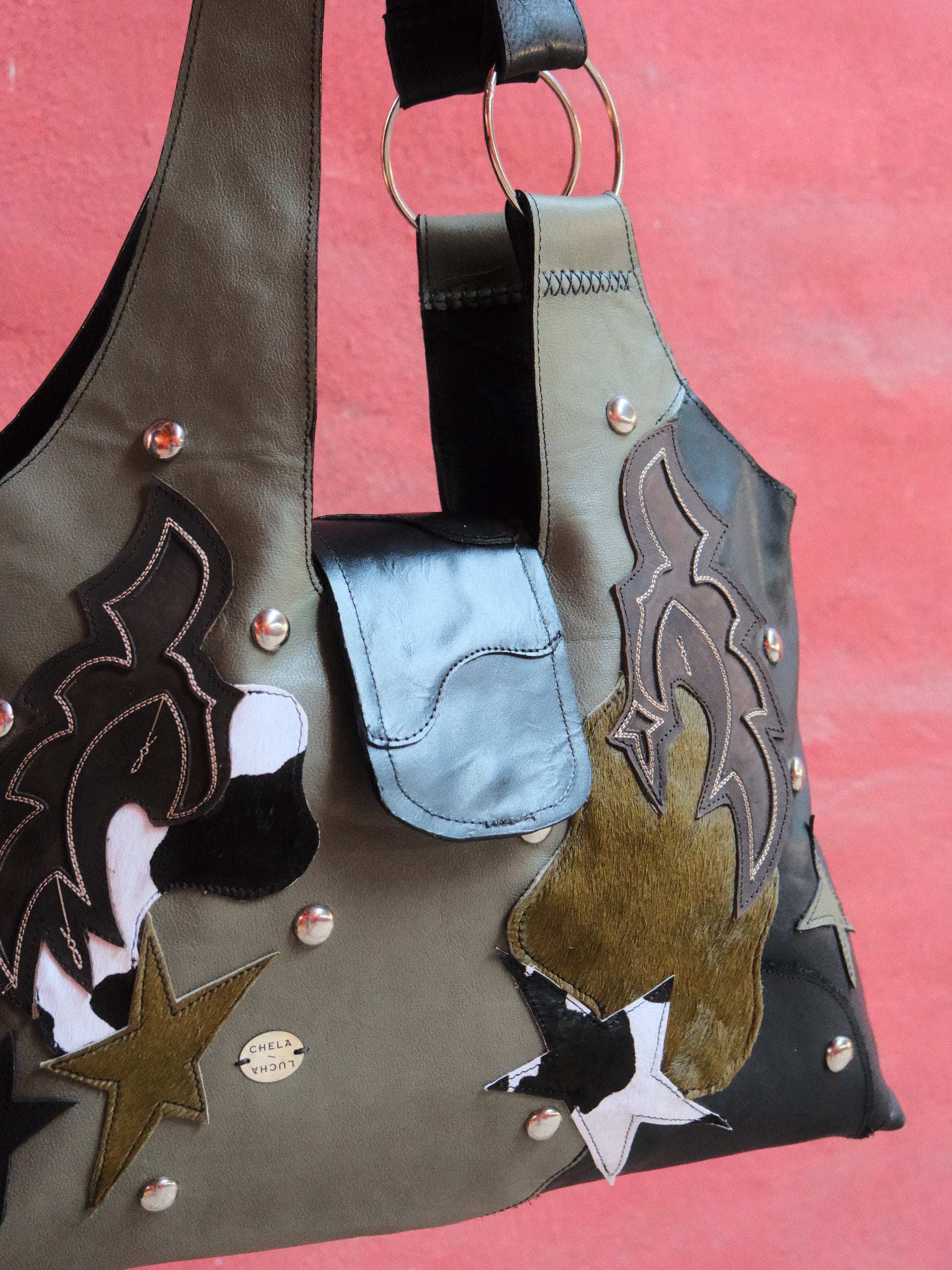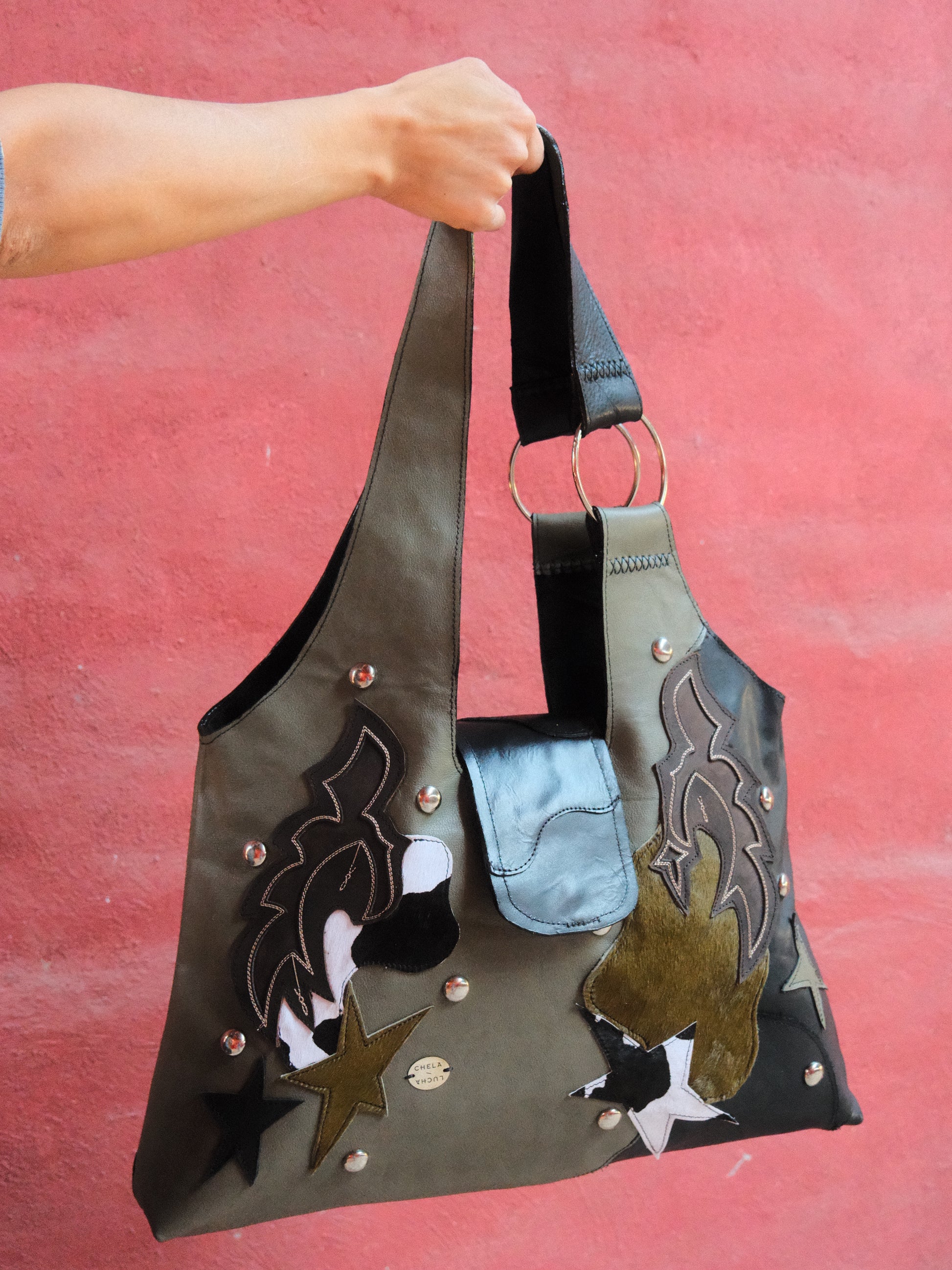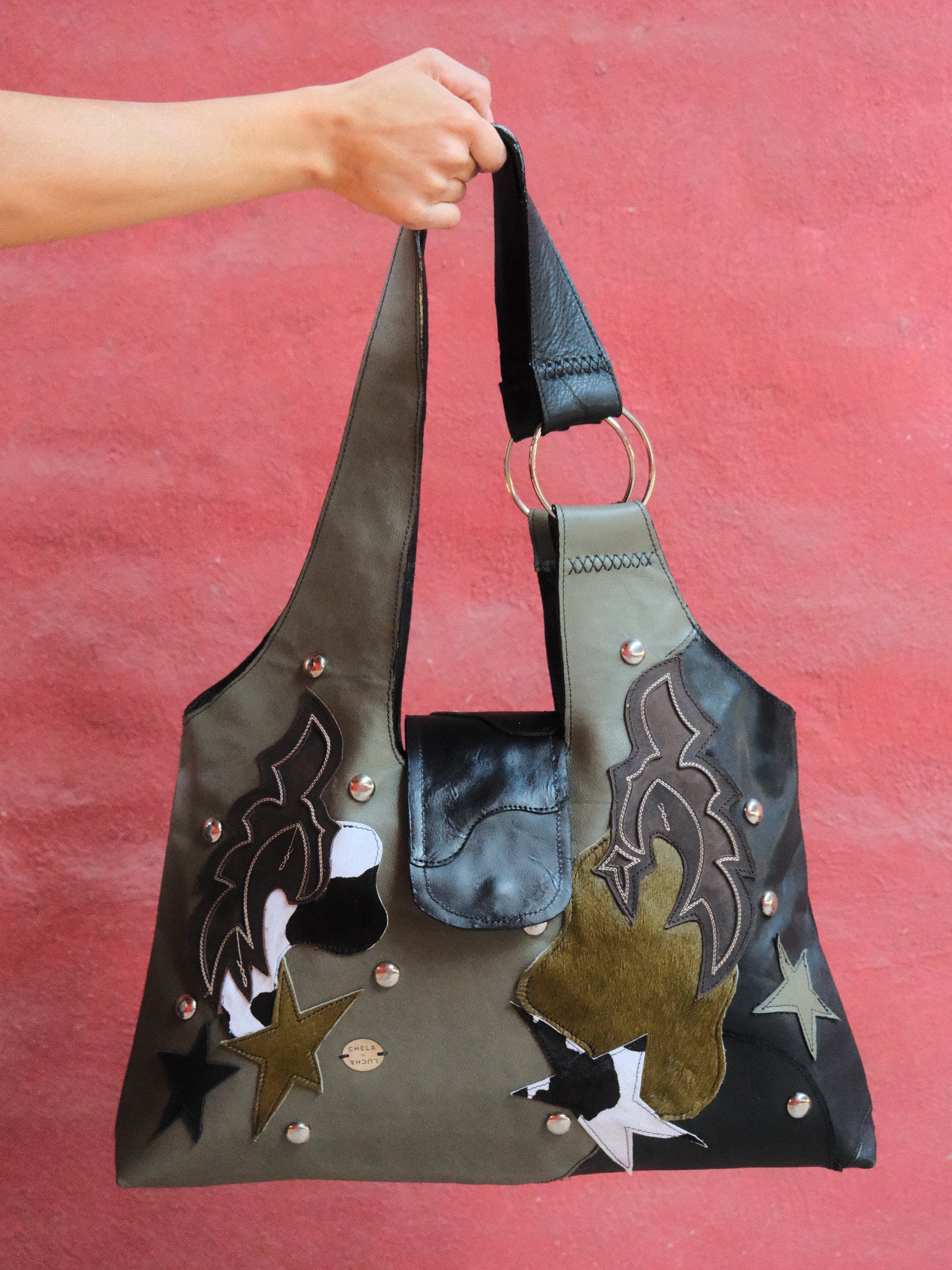 Bolsa PINA hecha con pedacera de piel en tonos verde y negro.