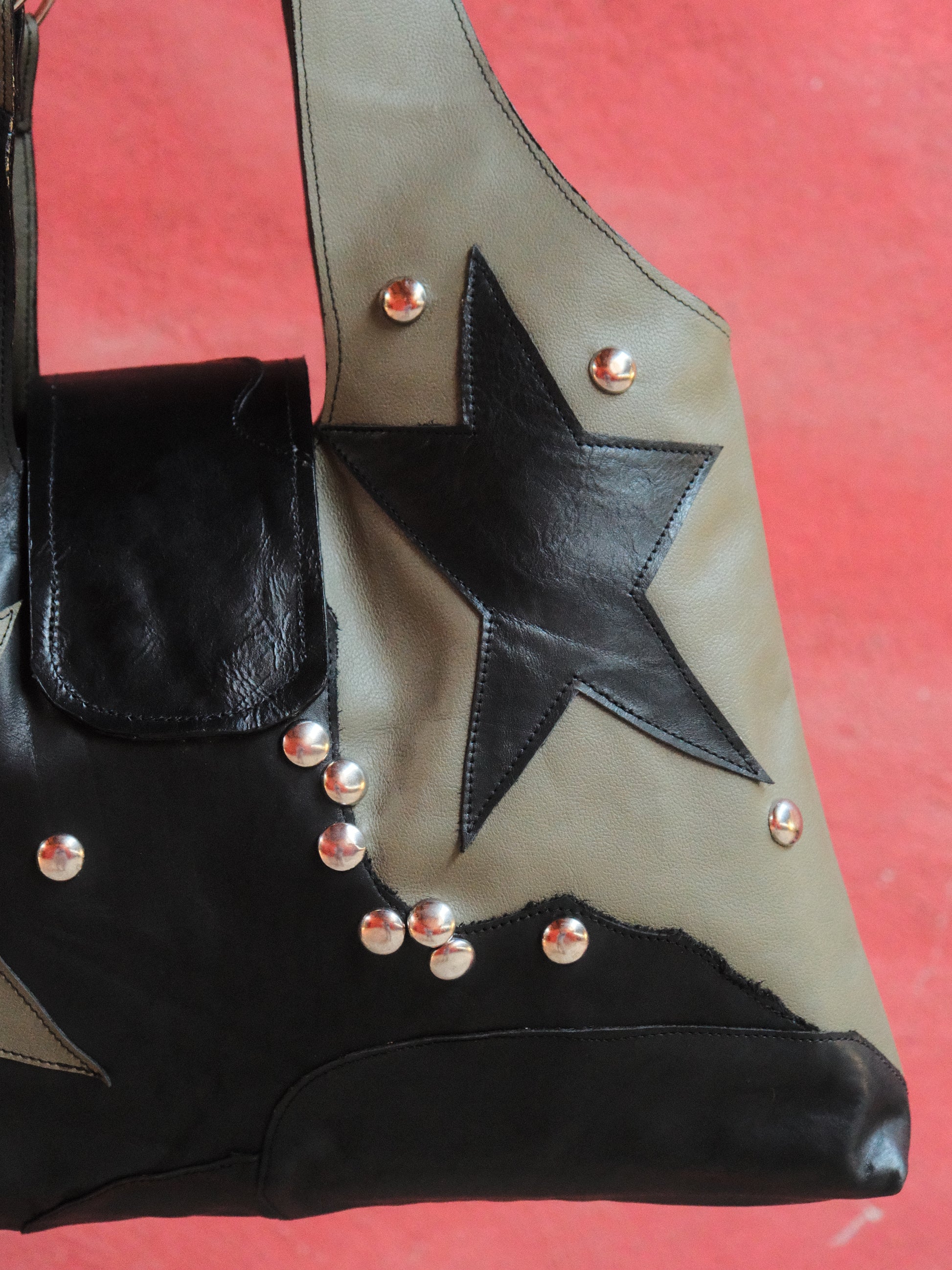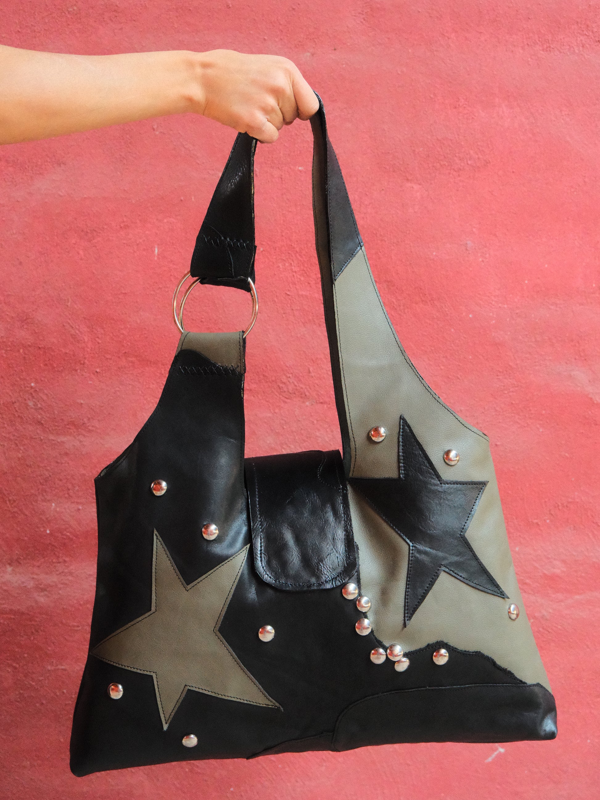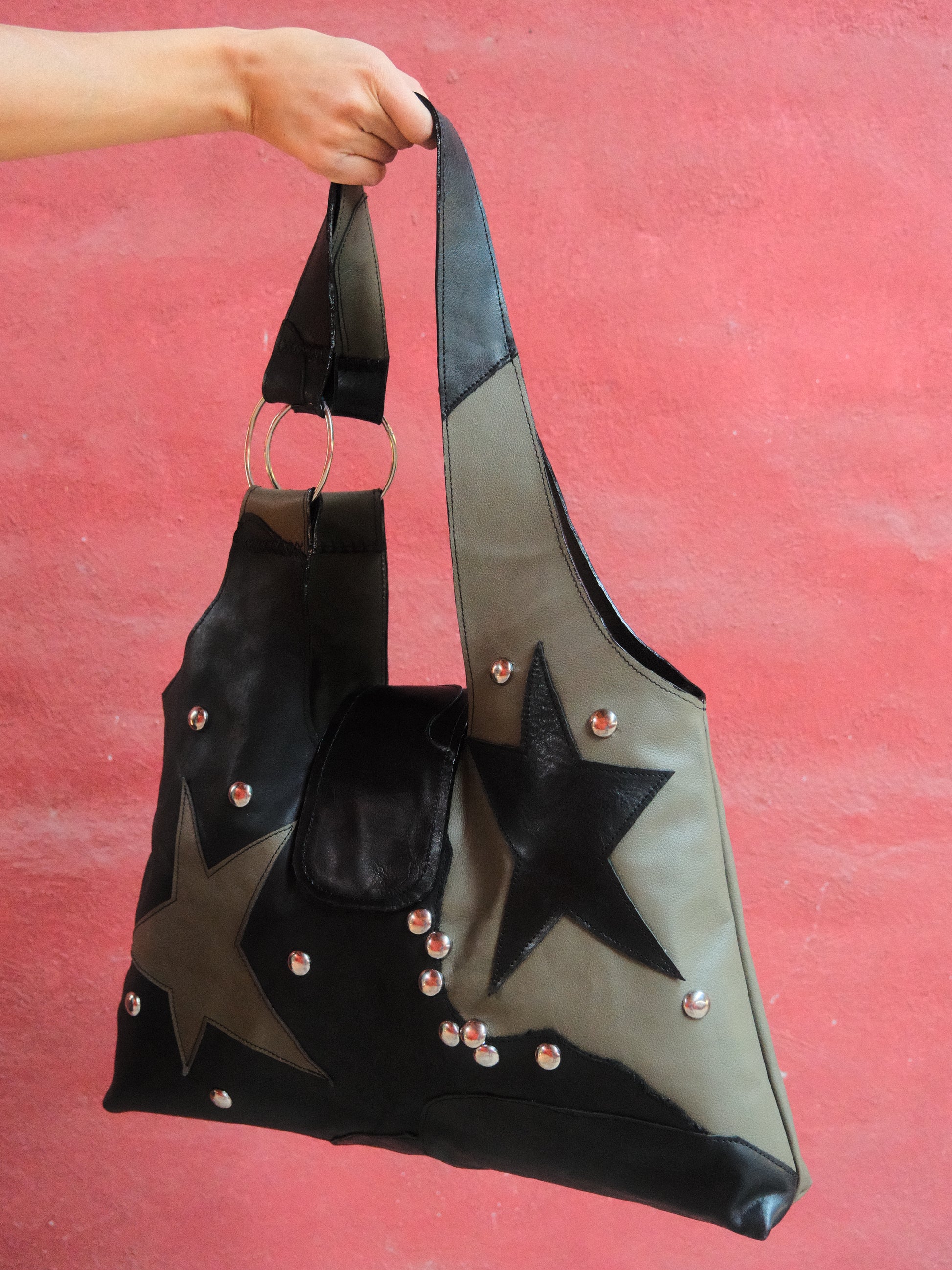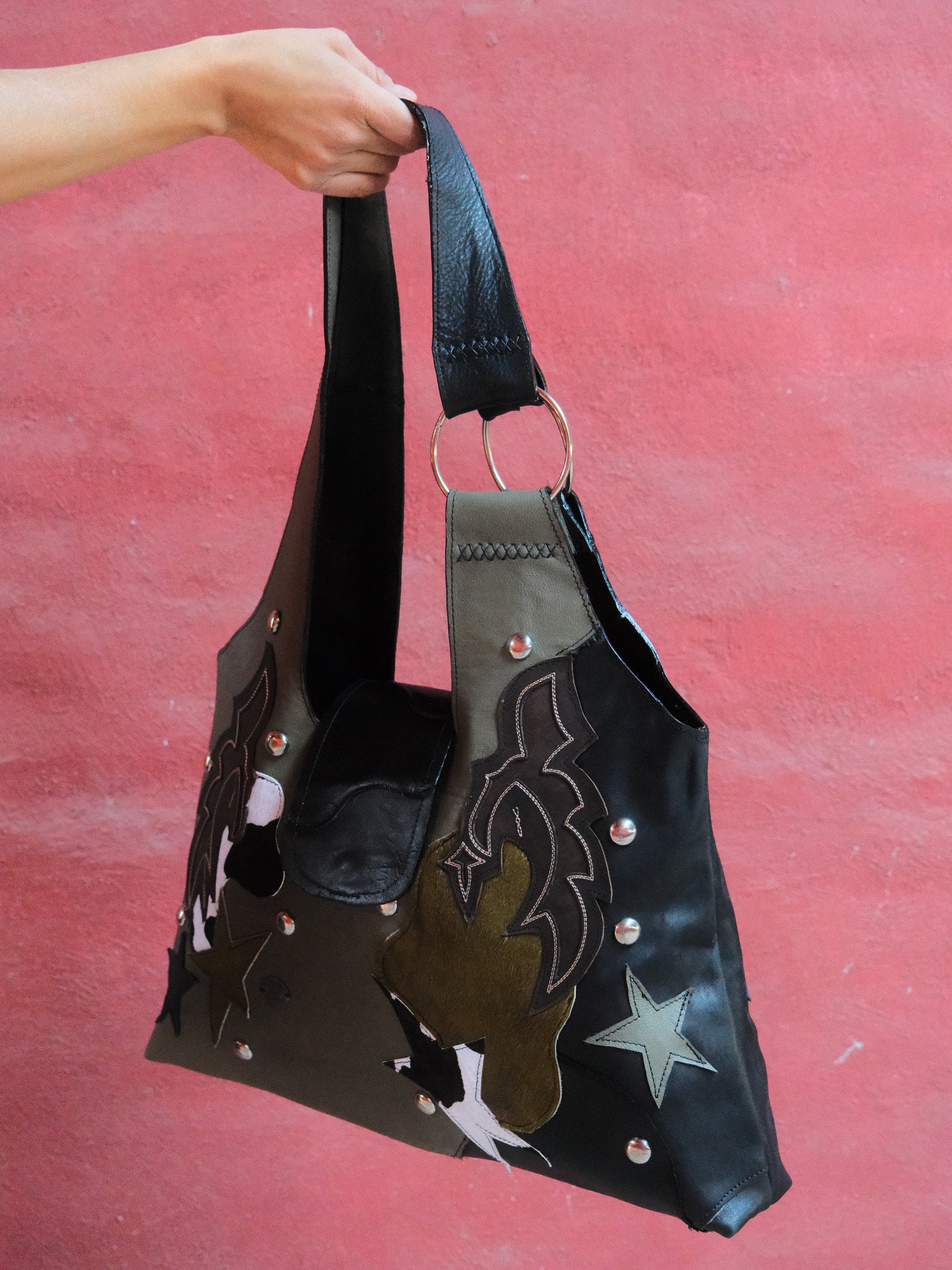 Bolsa PINA hecha con pedacera de piel en tonos verde y negro.