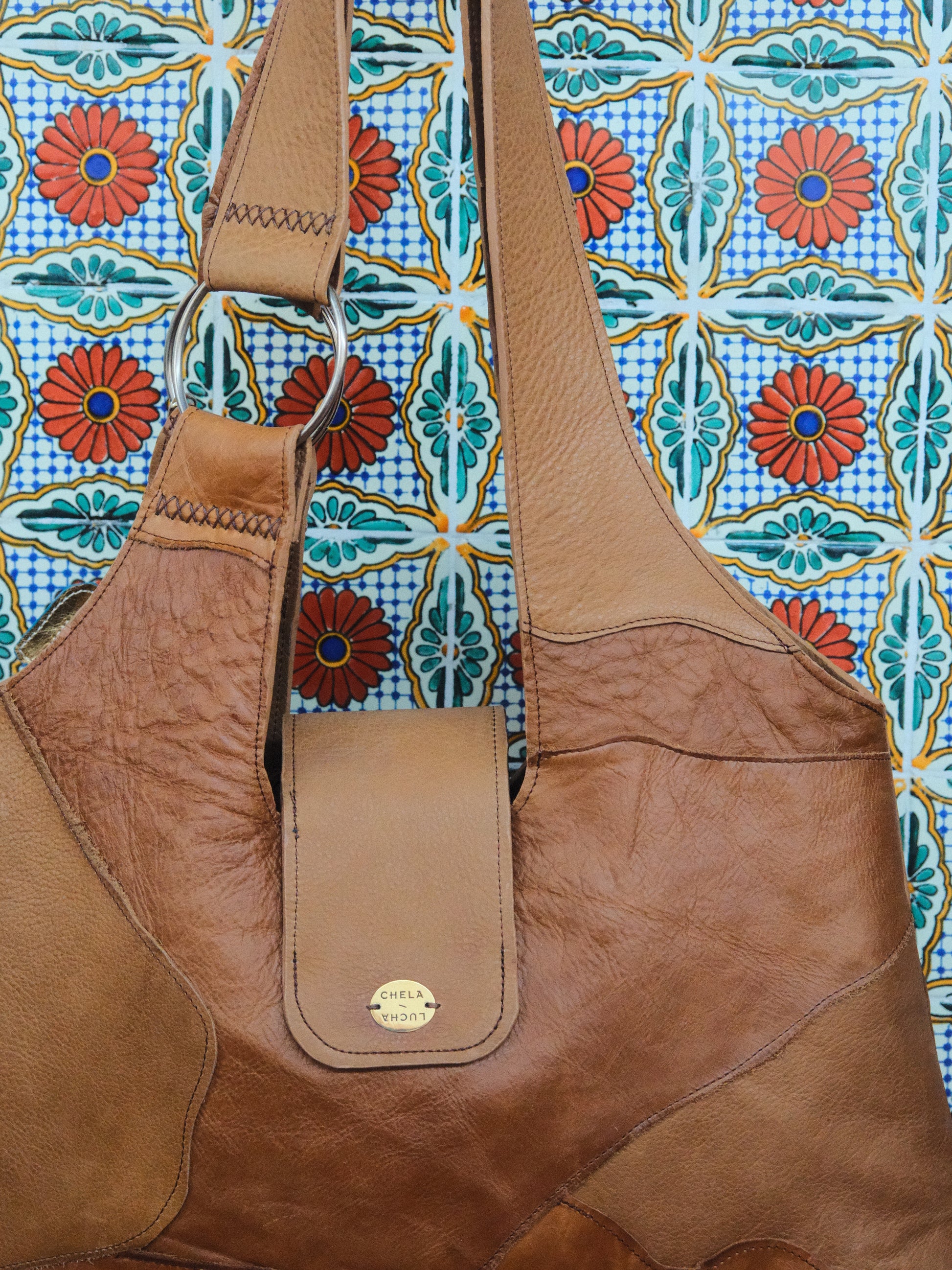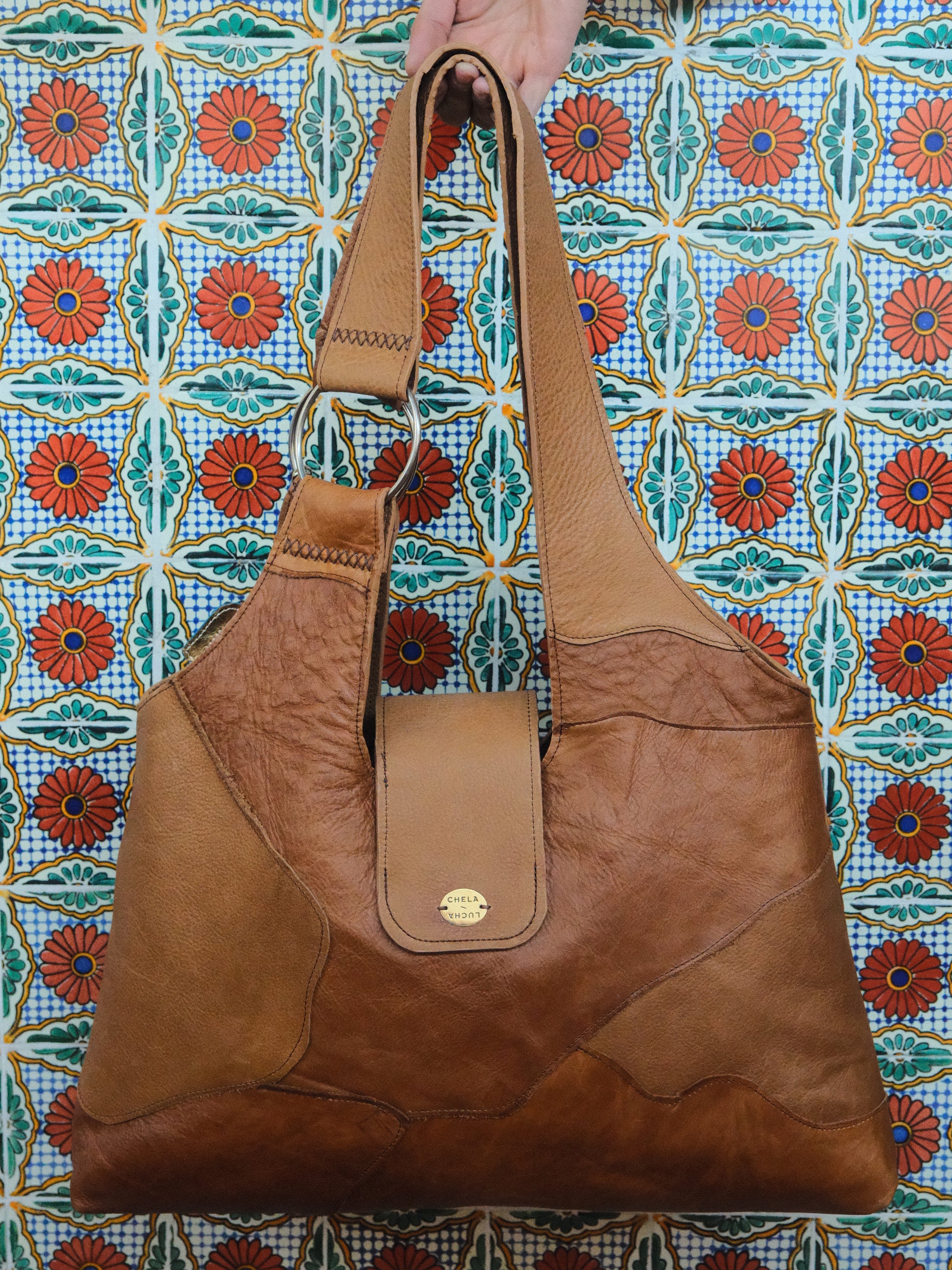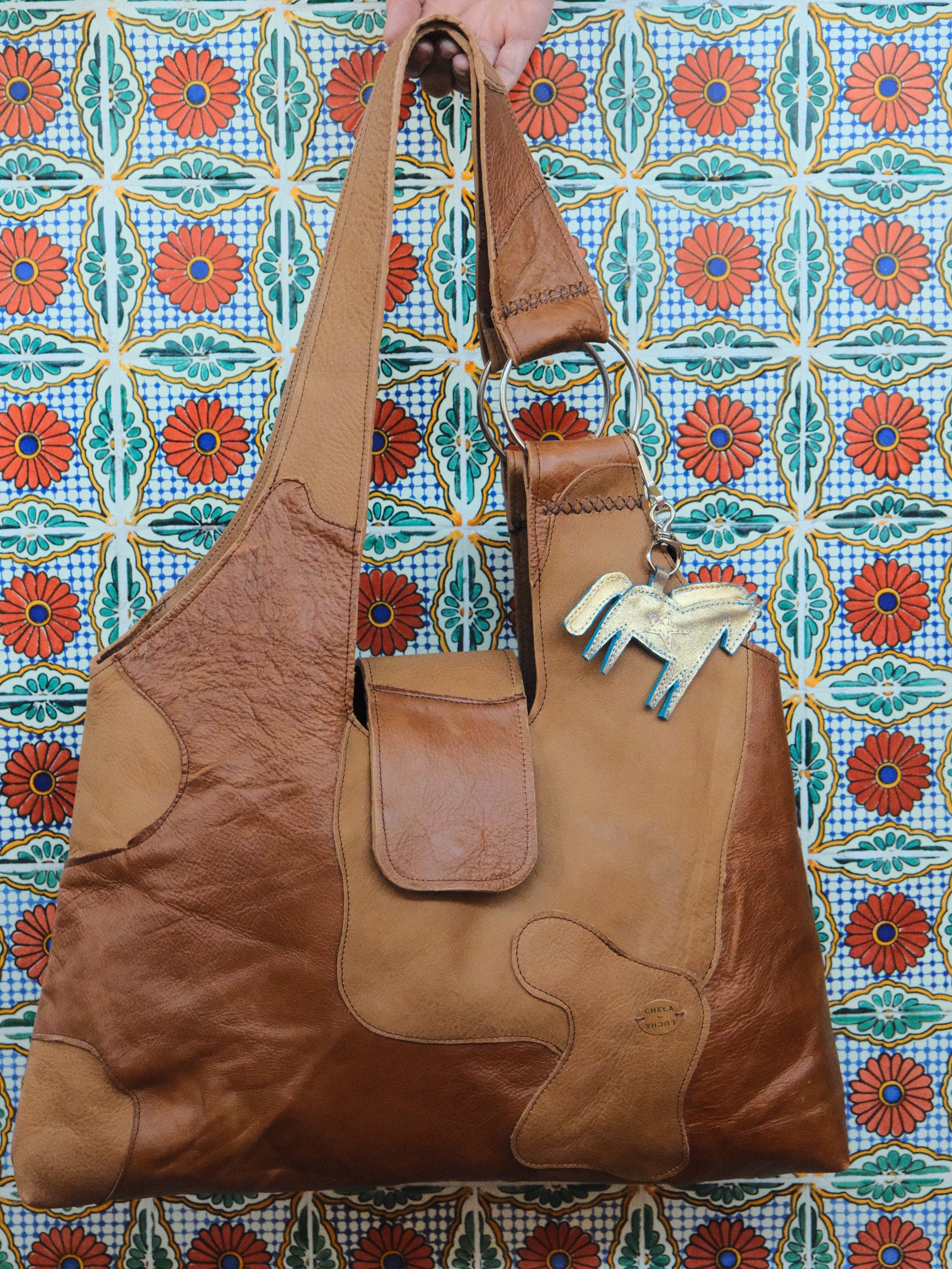 Bolsa PINA hecha con pedacera de piel en tono café.