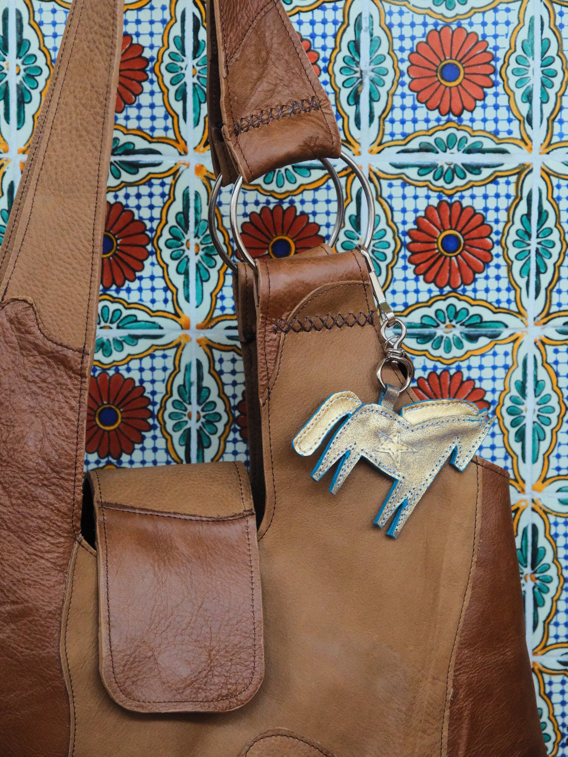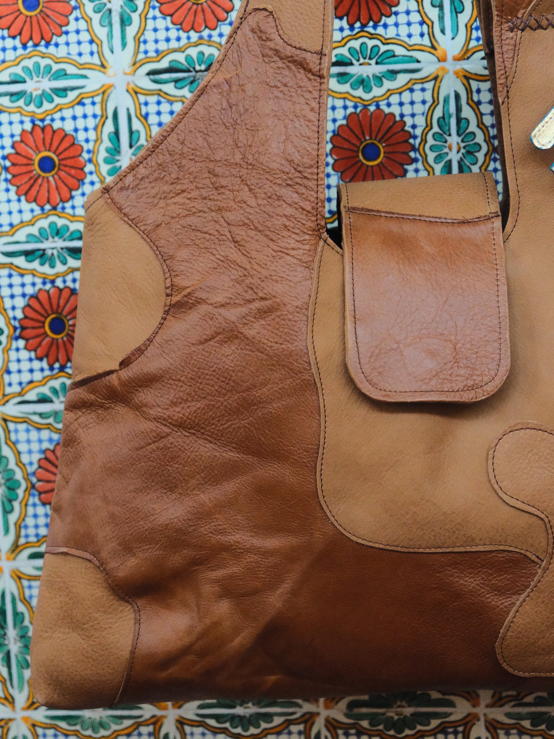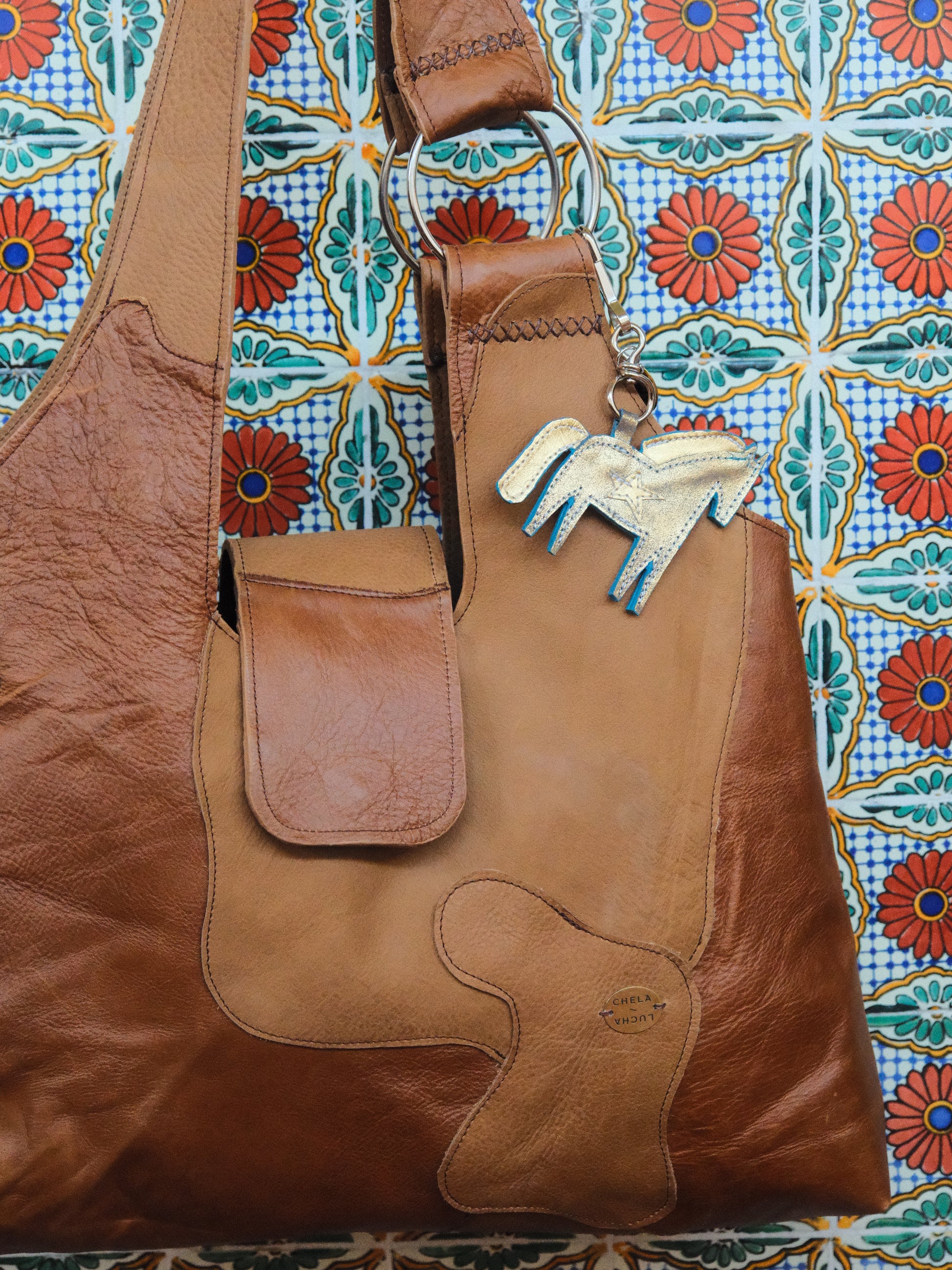 Bolsa PINA hecha con pedacera de piel en tono café.