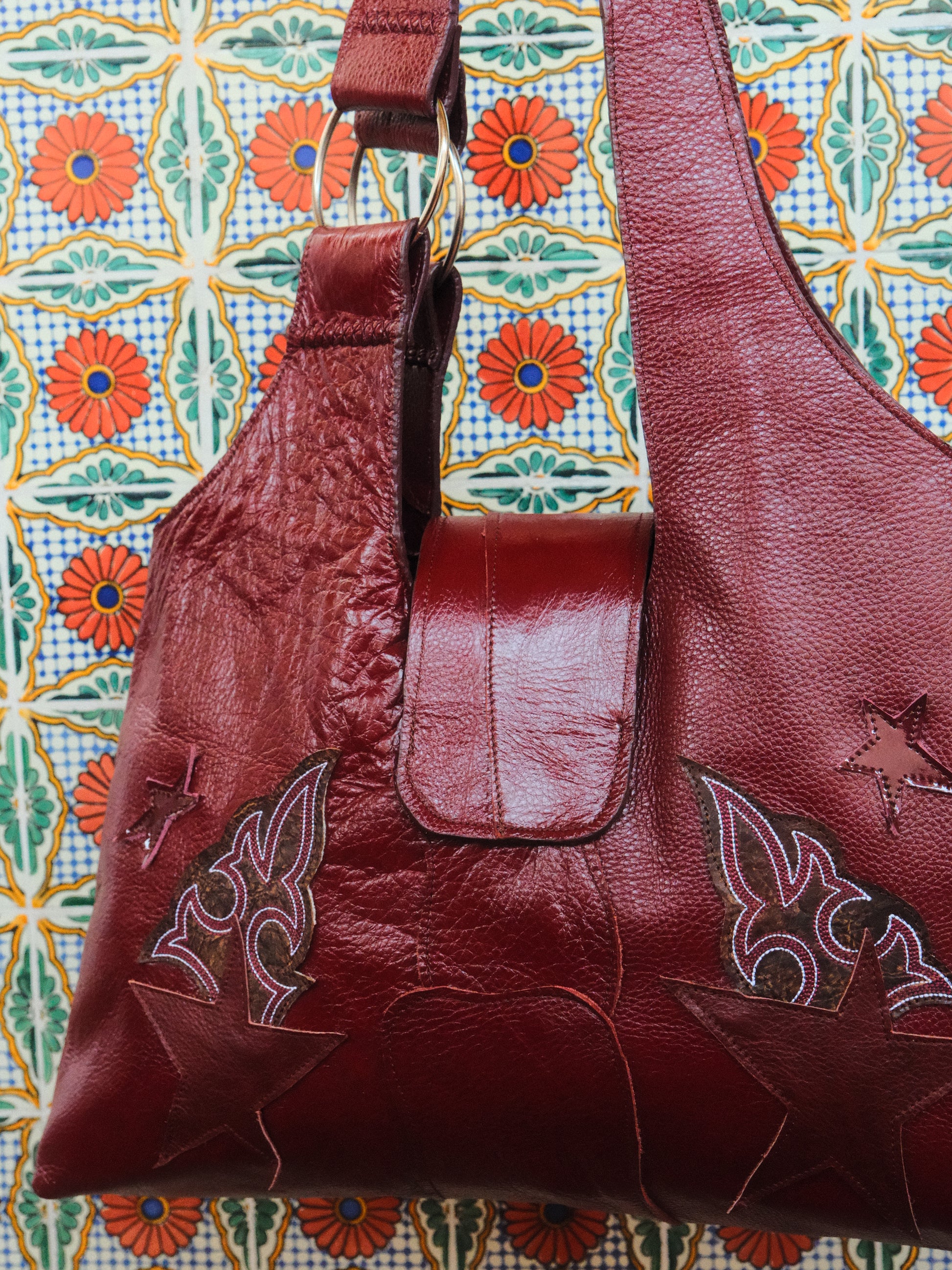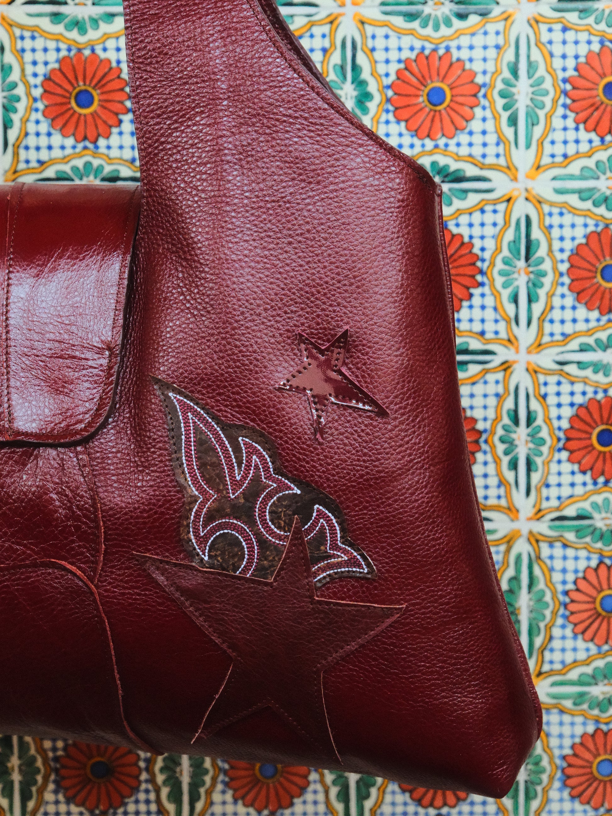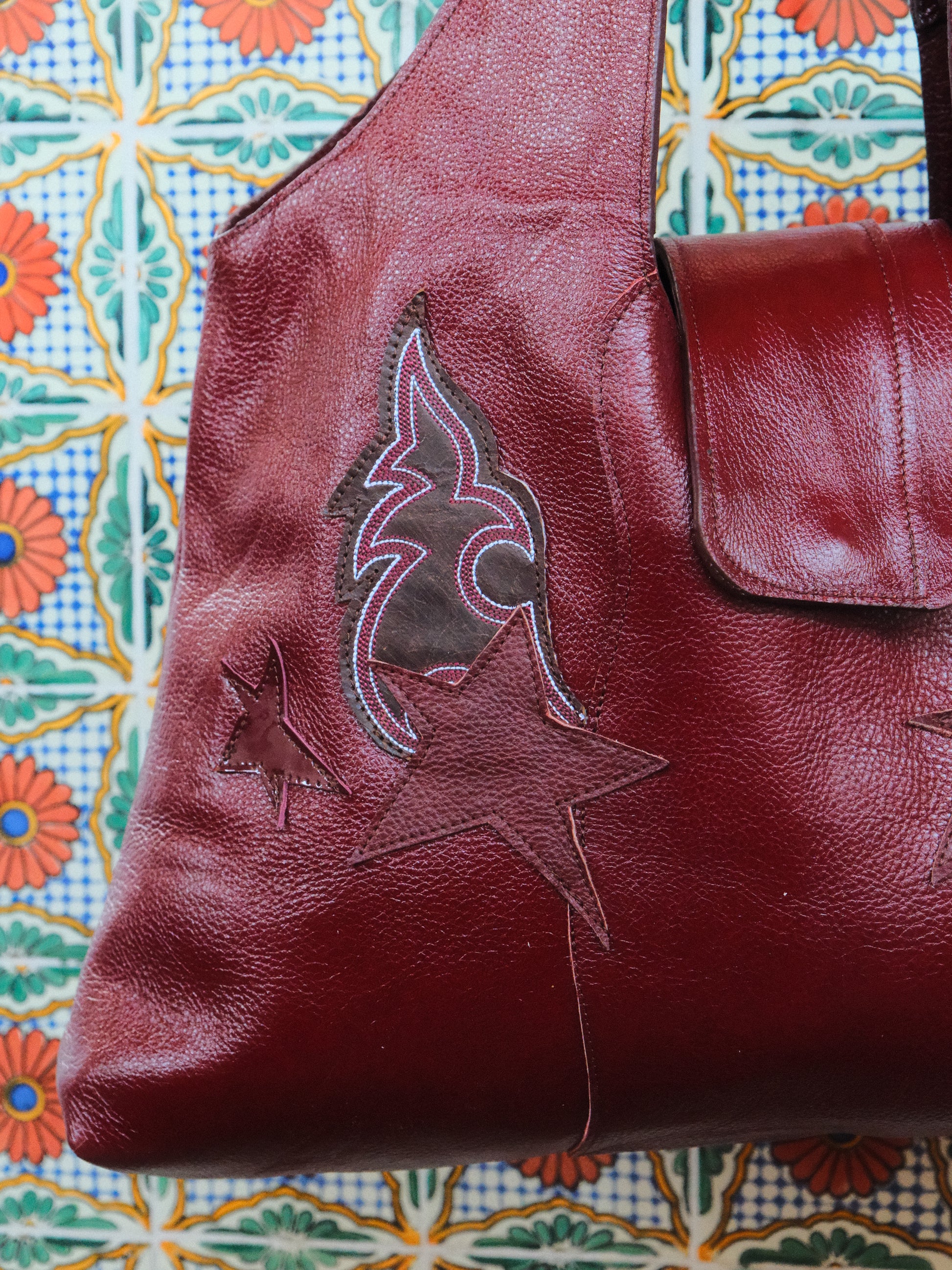 Bolsa PINA hecha con pedacera de piel en tonos tinto y parches de piel bordada.