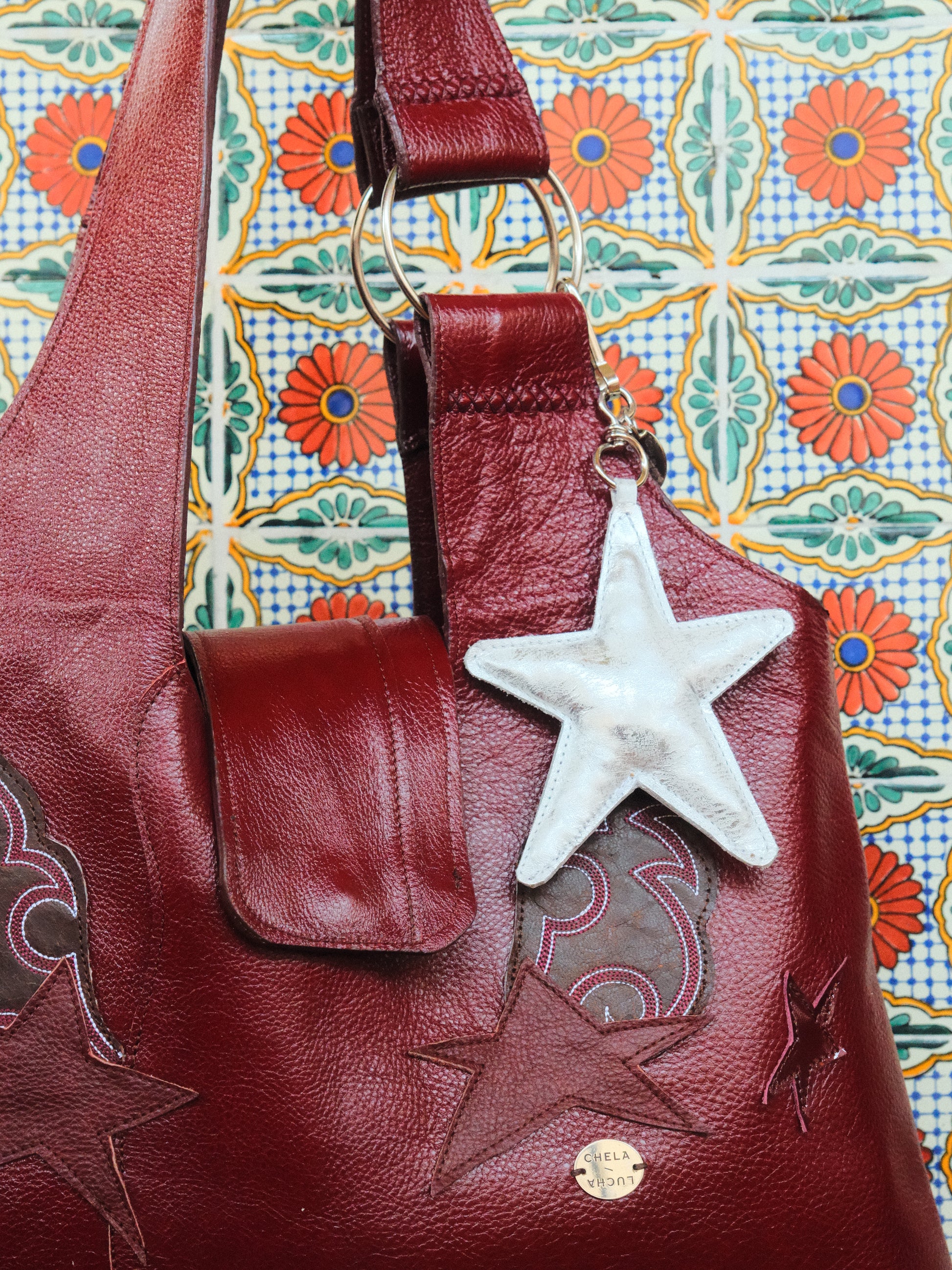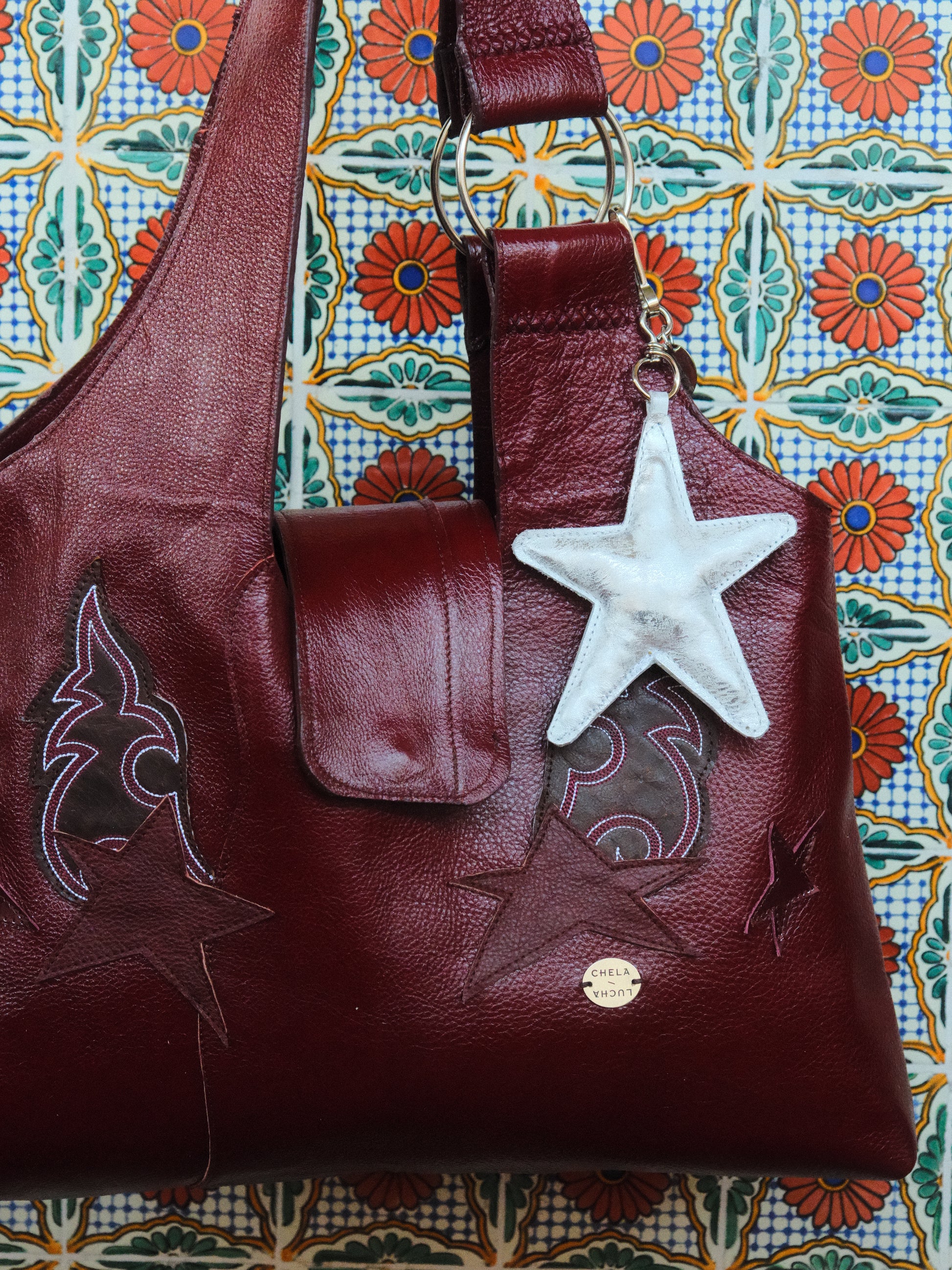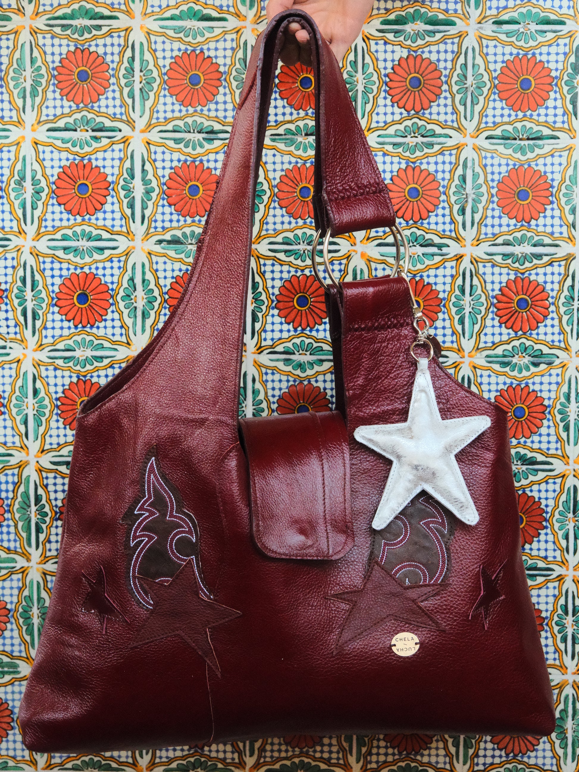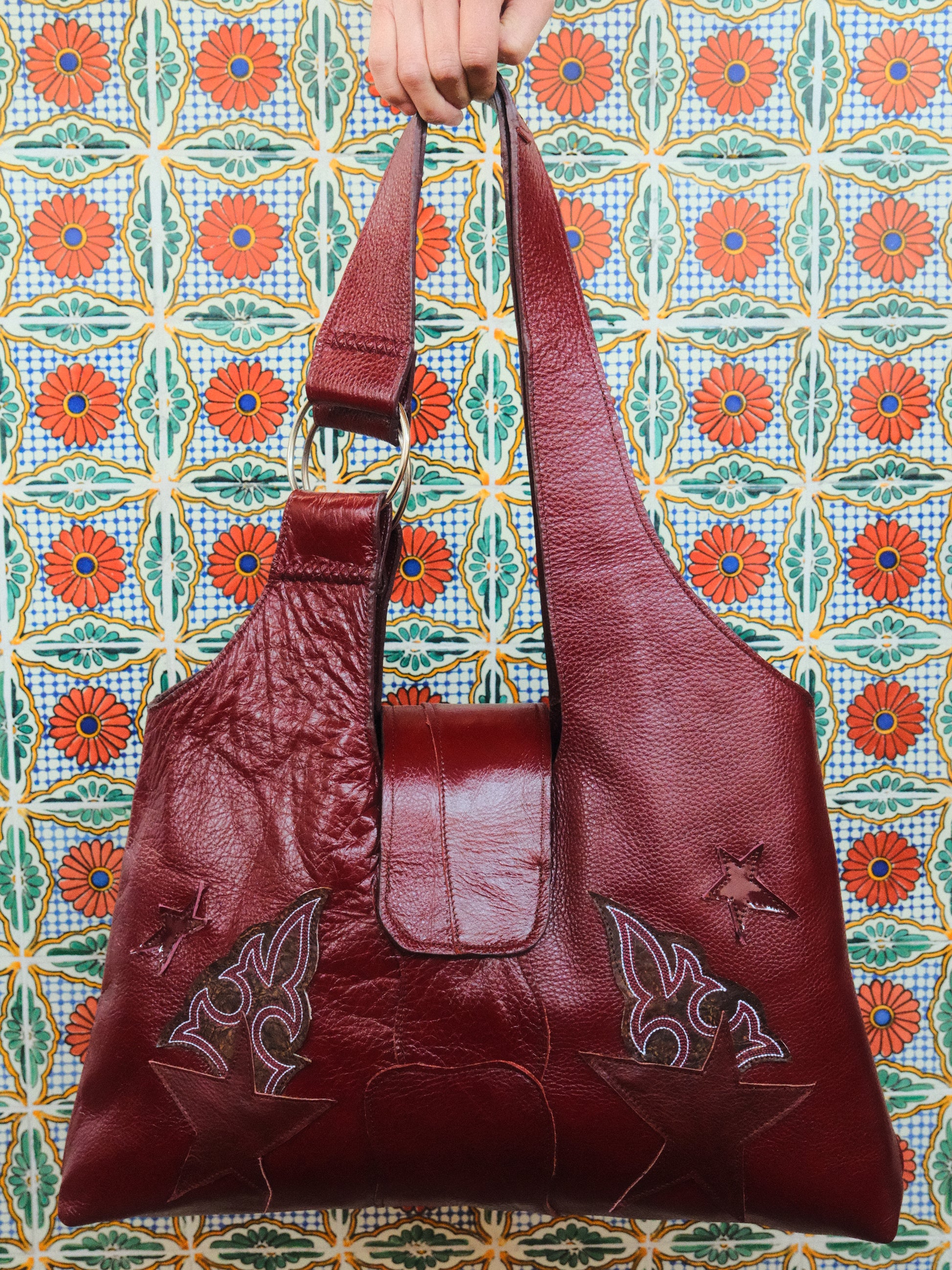Bolsa PINA hecha con pedacera de piel en tonos tinto y parches de piel bordada.