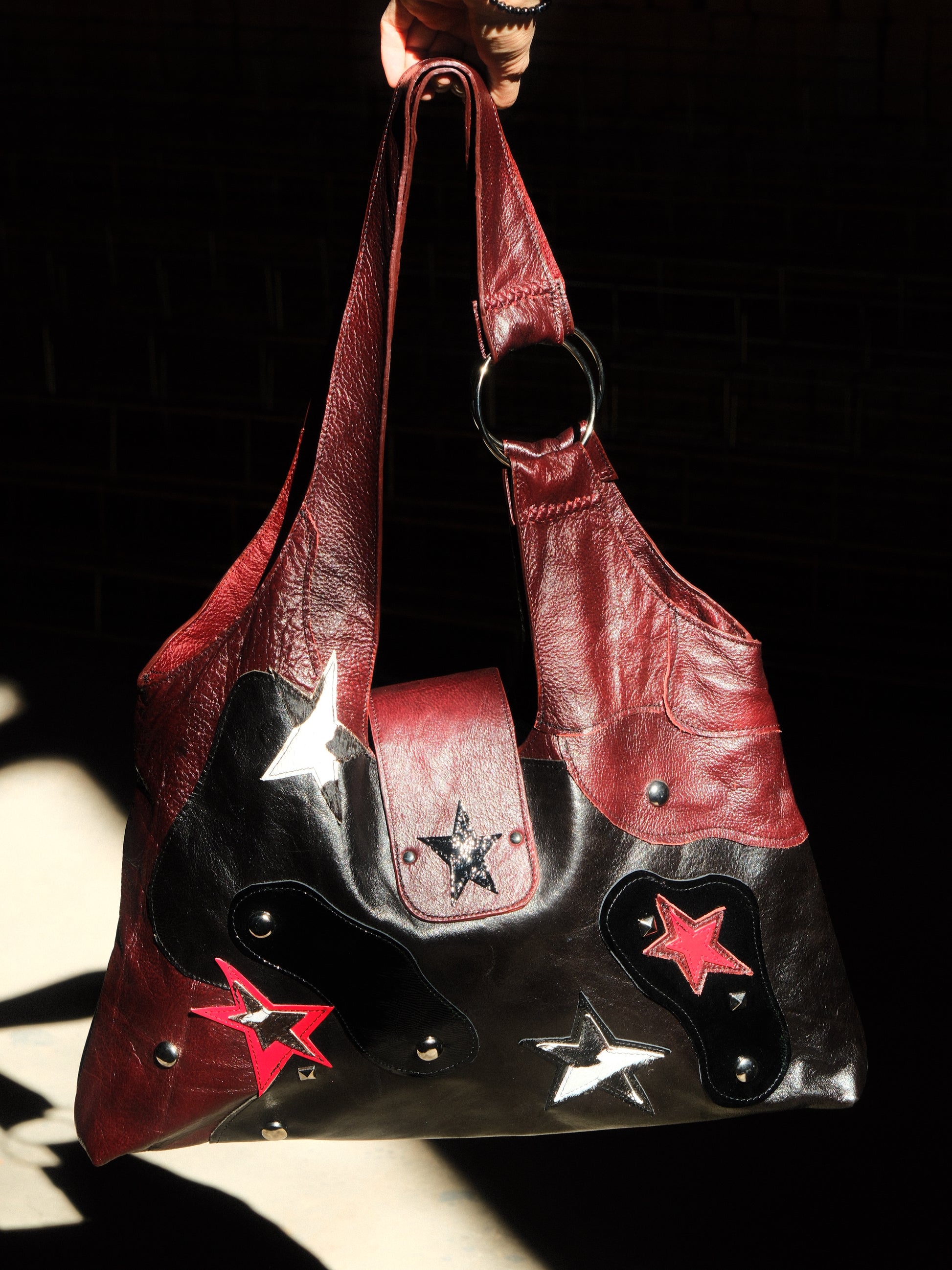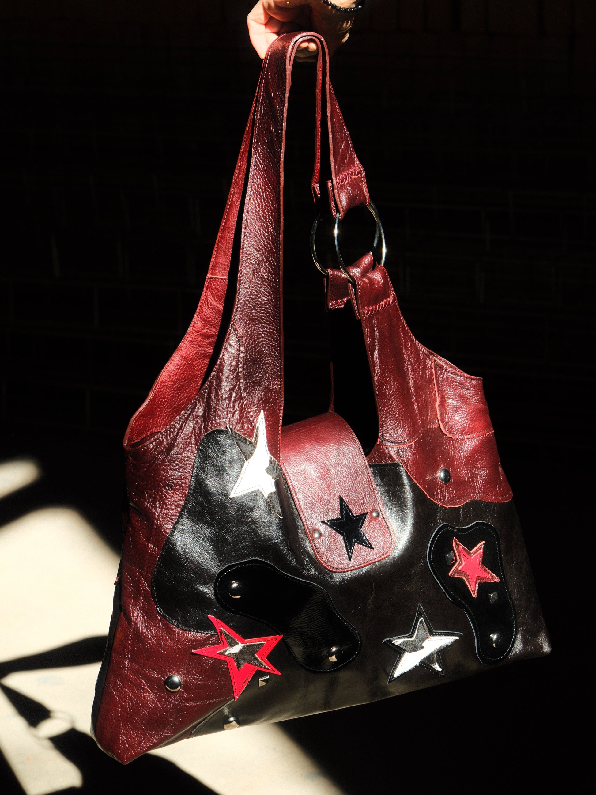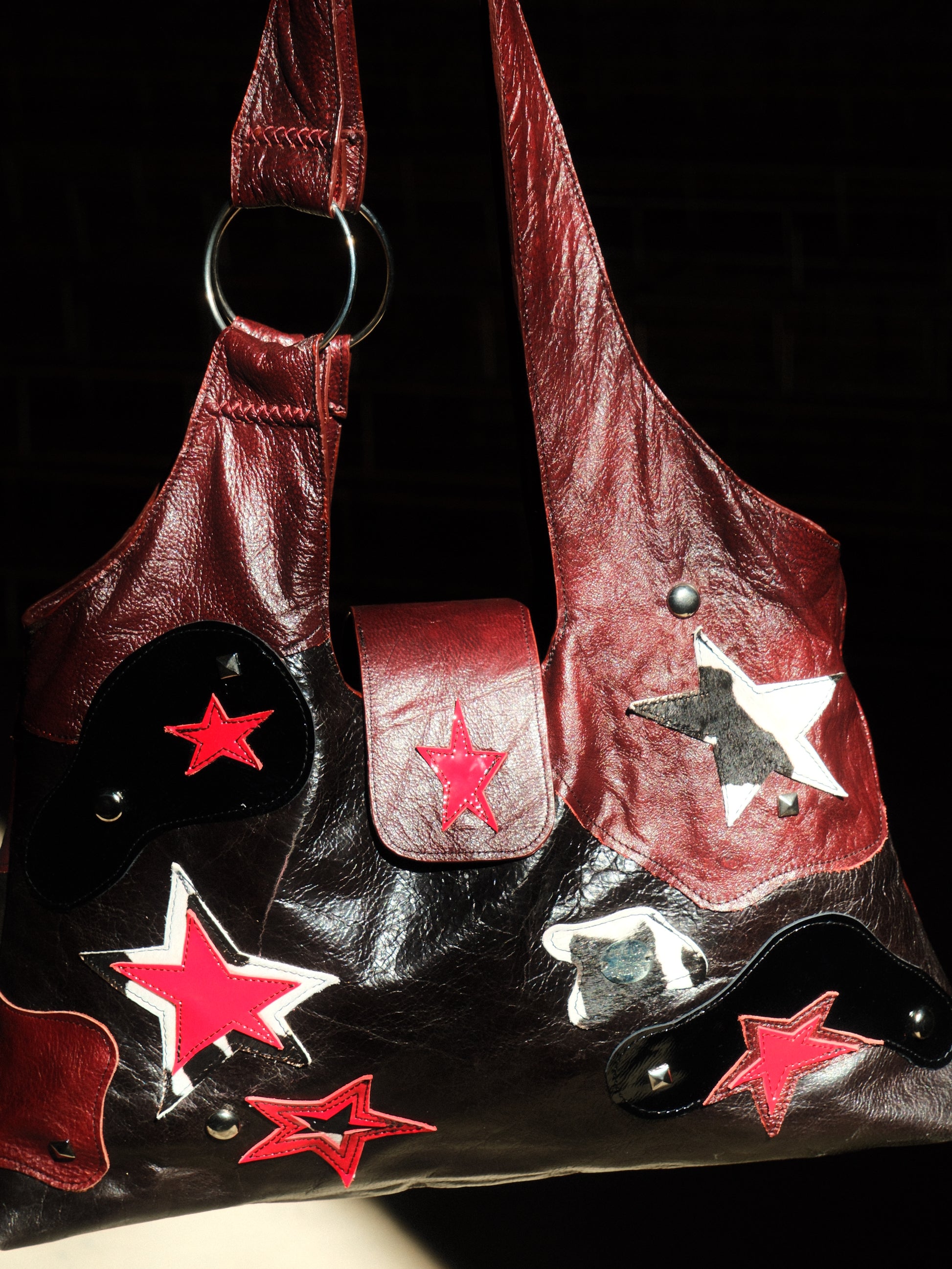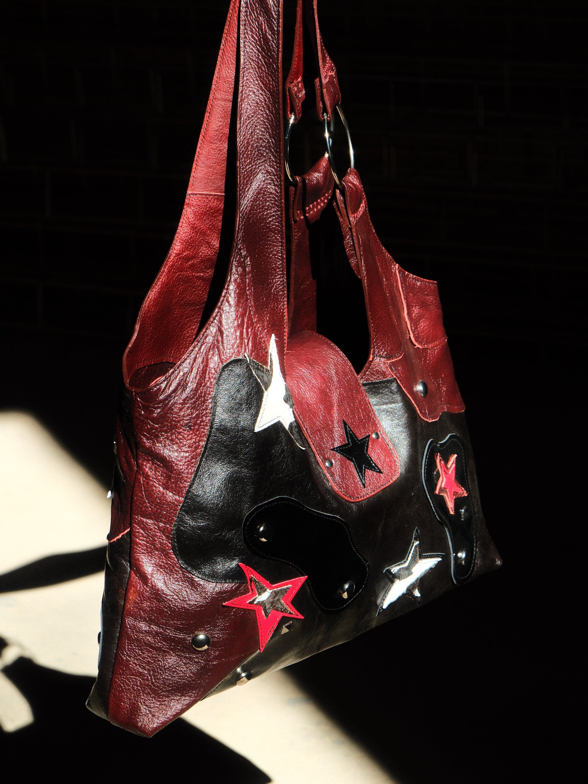 Bolsa PINA hecha con pedacera de piel en tonos negro, tinto y textura de pelito. Detalles de estoperoles en tono plateado.