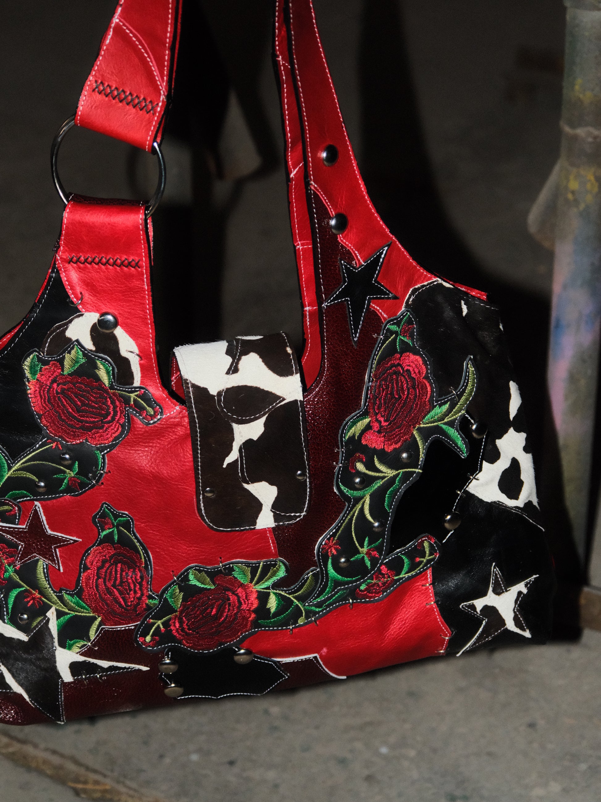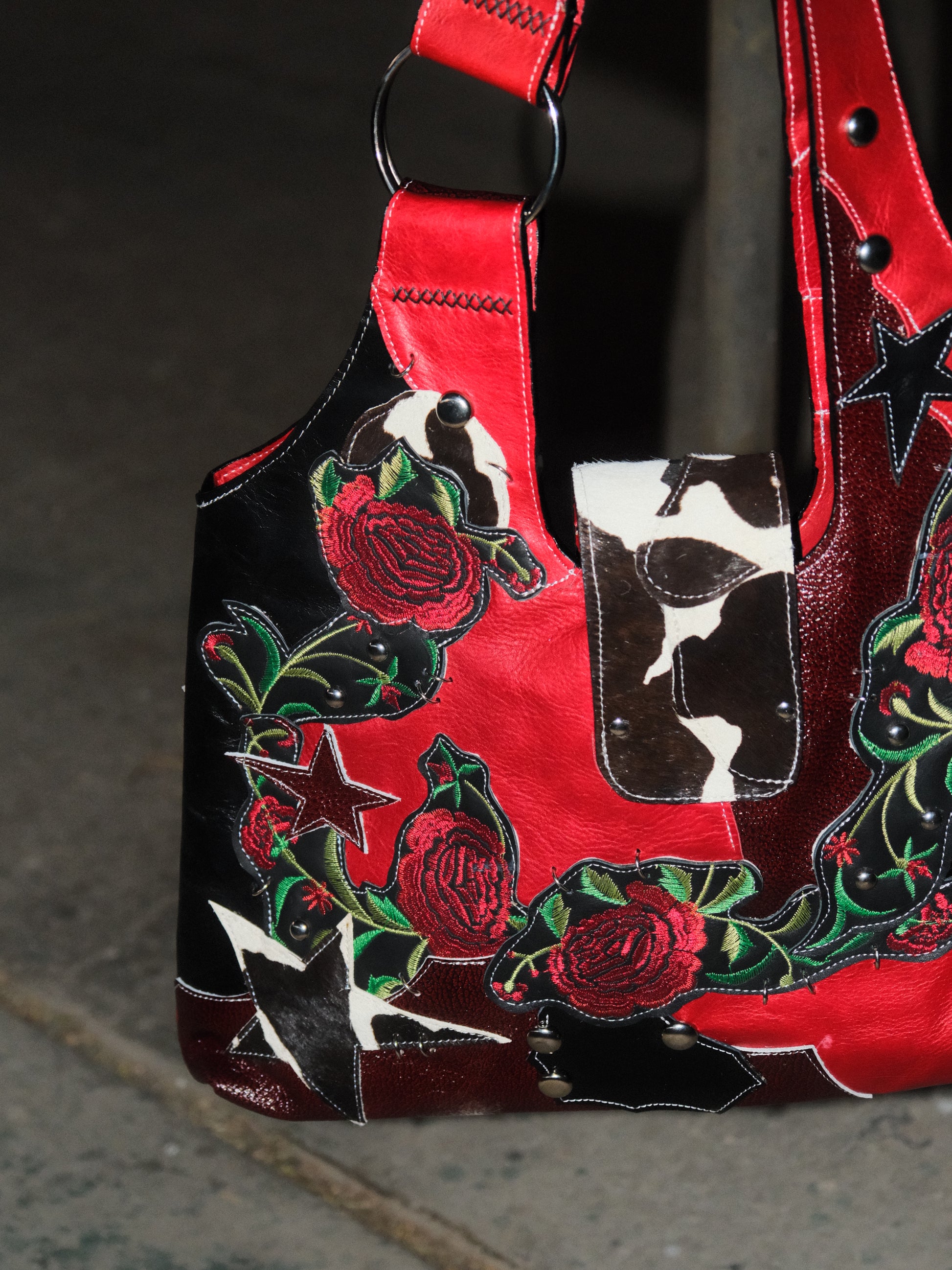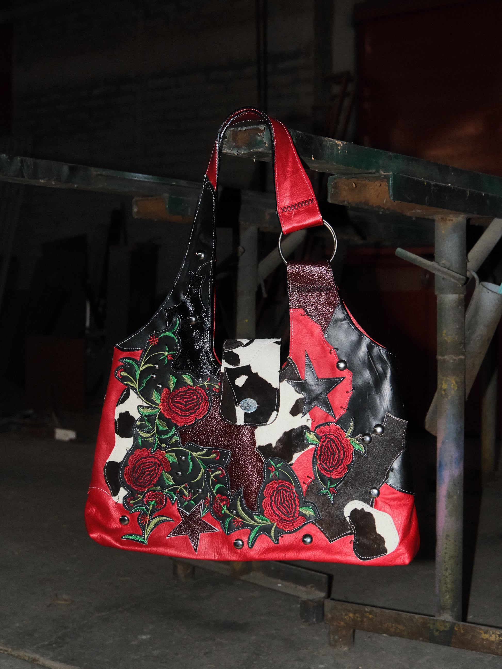 Bolsa PINA hecha con pedacera de piel en tonos rojo, tinto, negro y textura de bordado. Detalles de estoperoles y argollas en tono plateado.