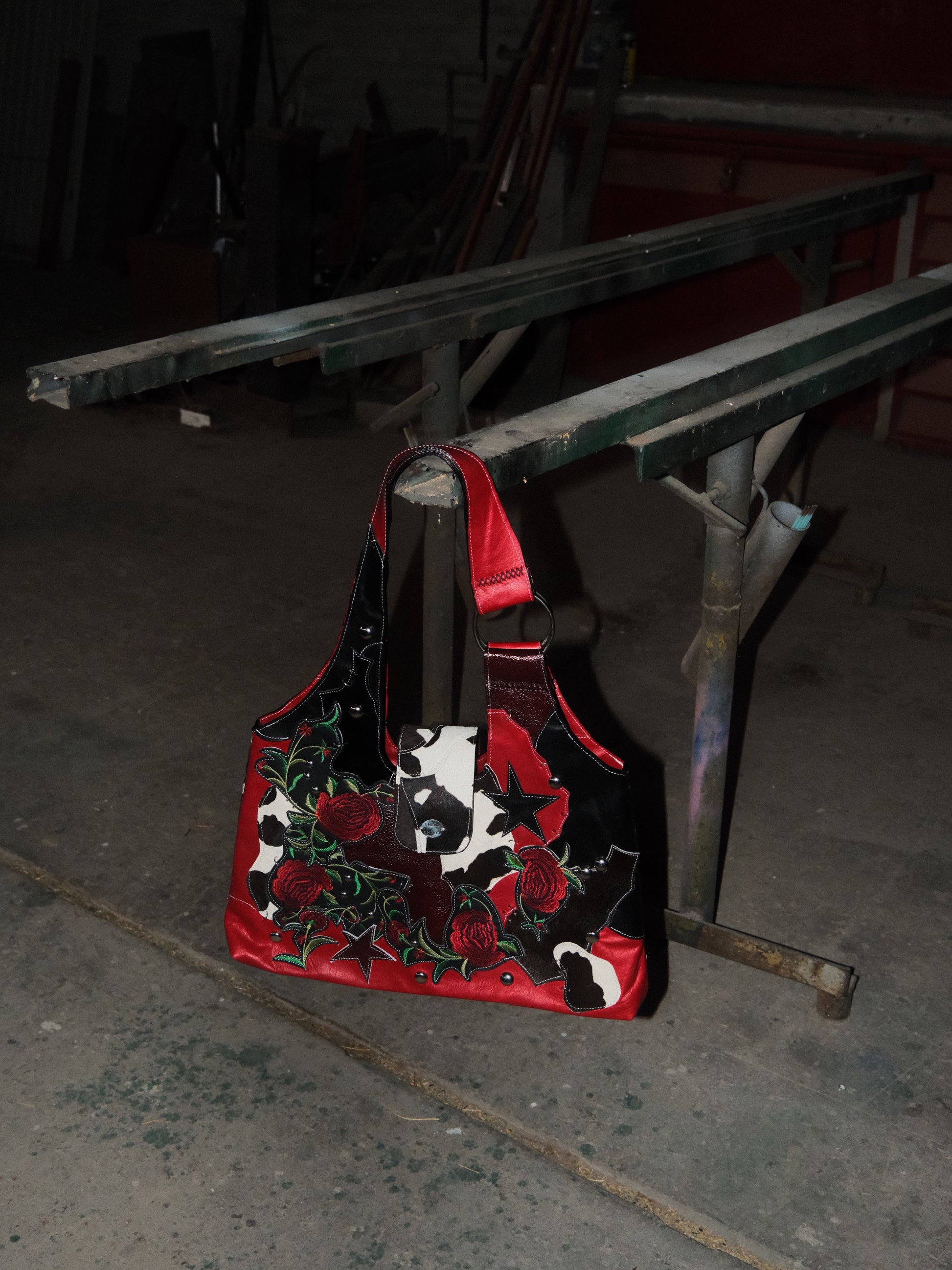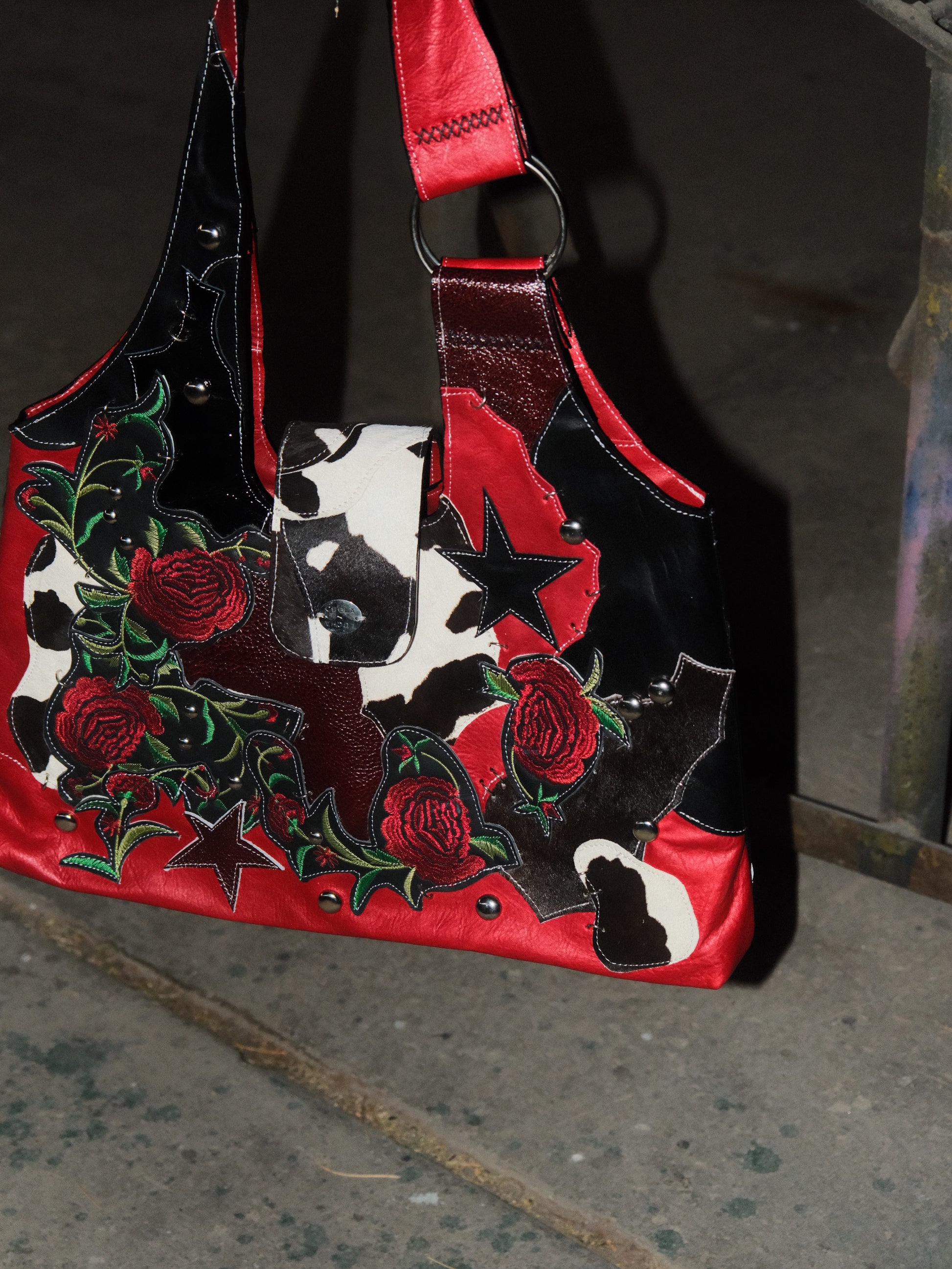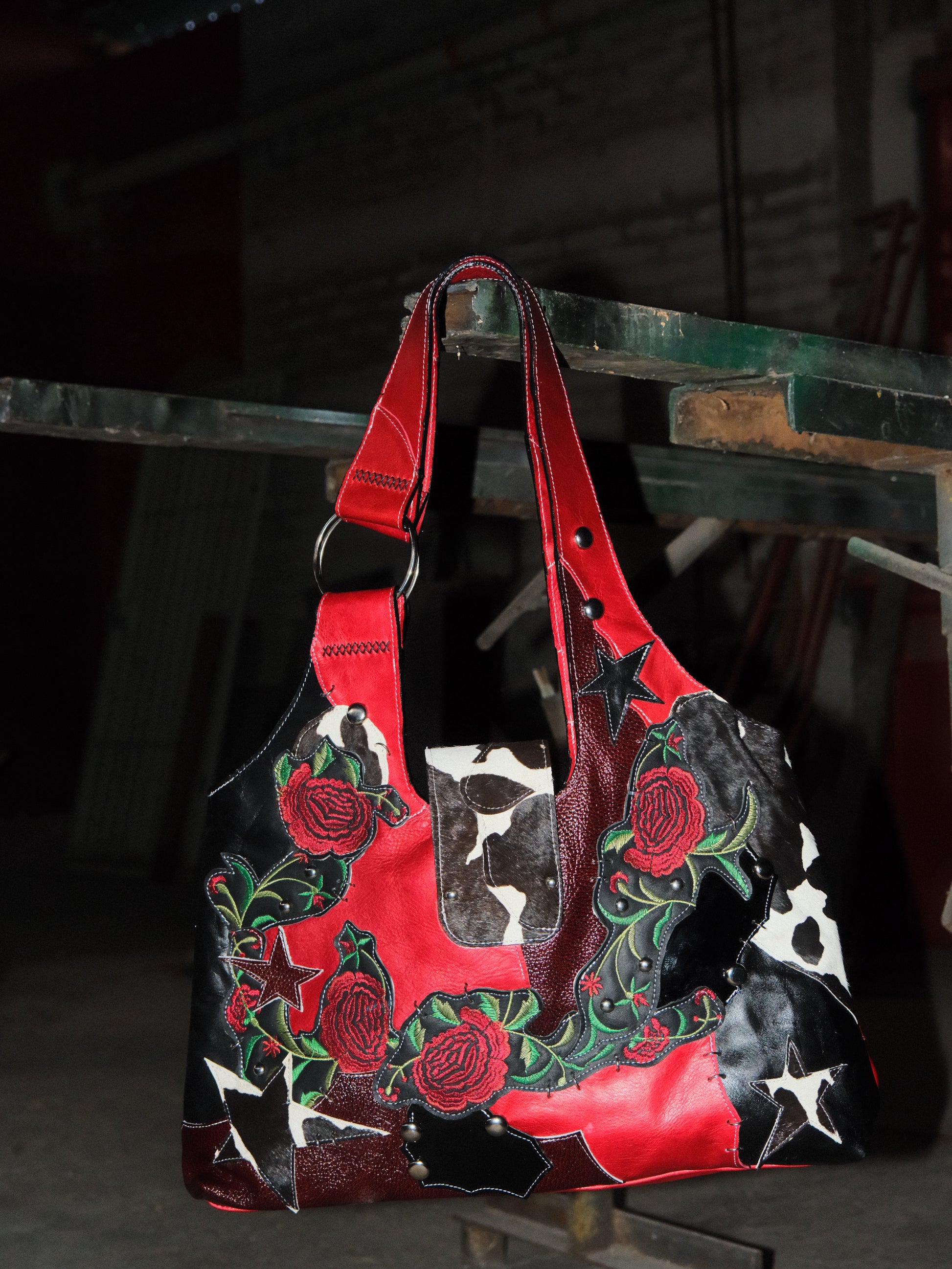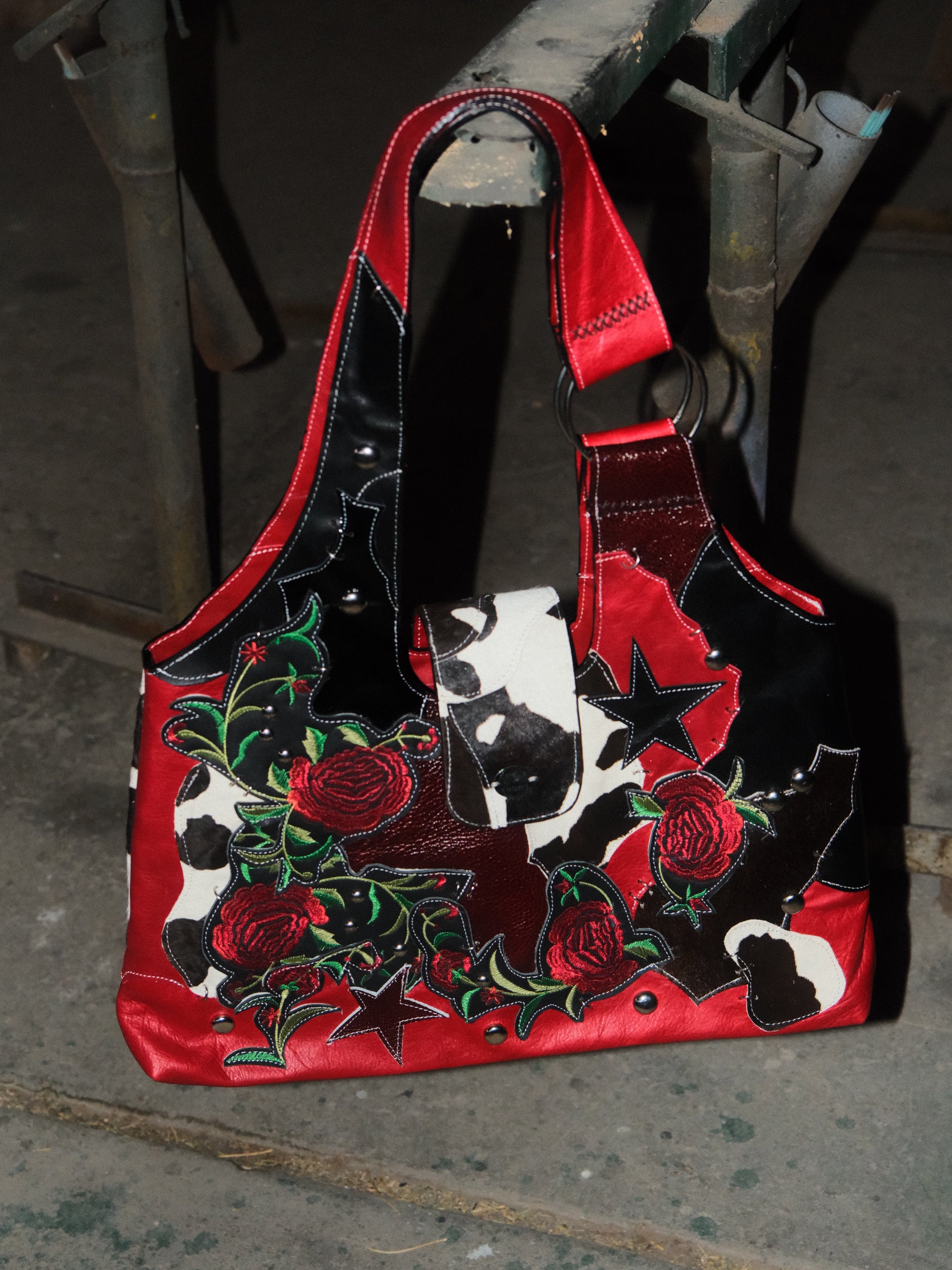 Bolsa PINA hecha con pedacera de piel en tonos rojo, tinto, negro y textura de bordado. Detalles de estoperoles y argollas en tono plateado.