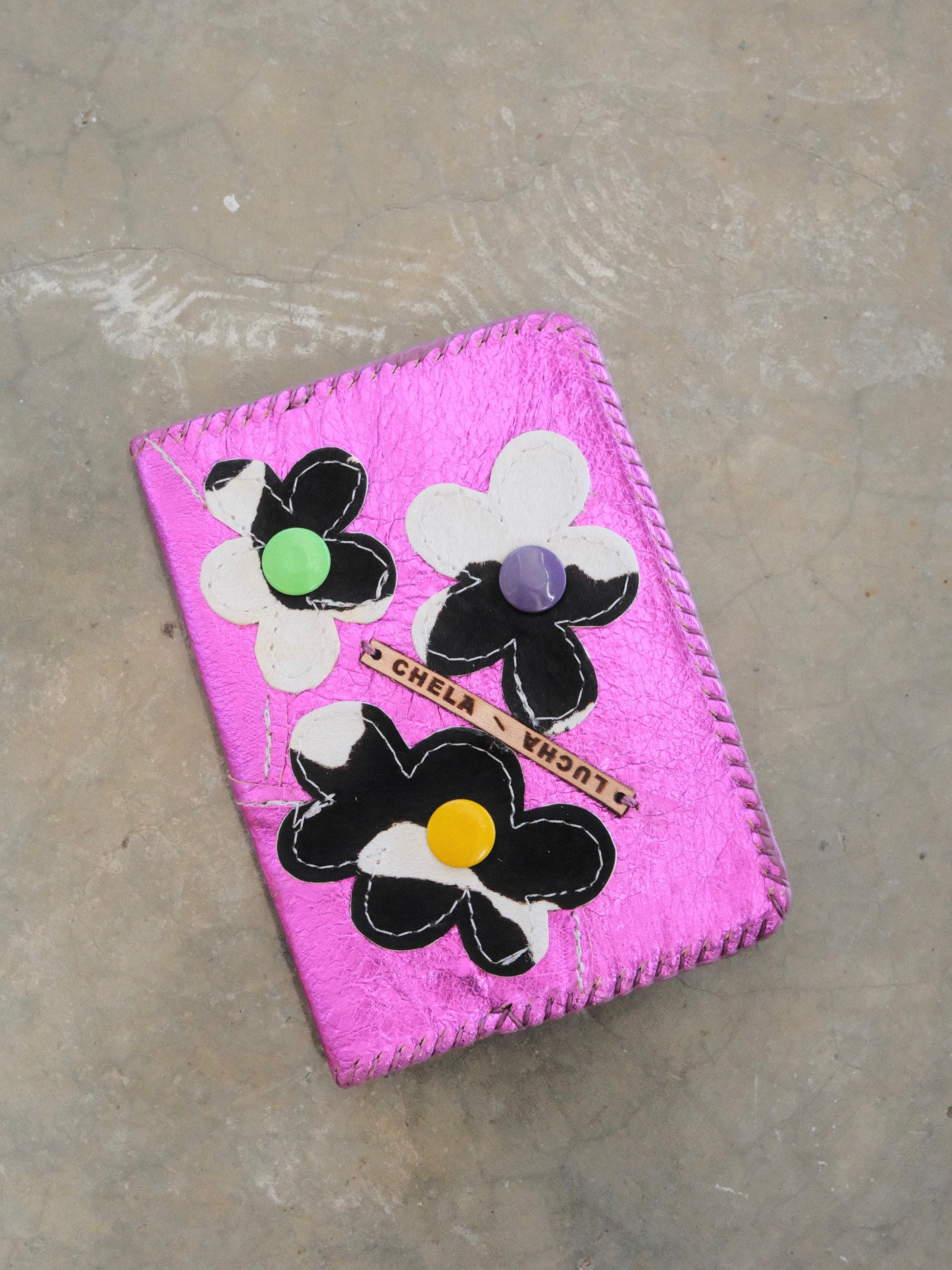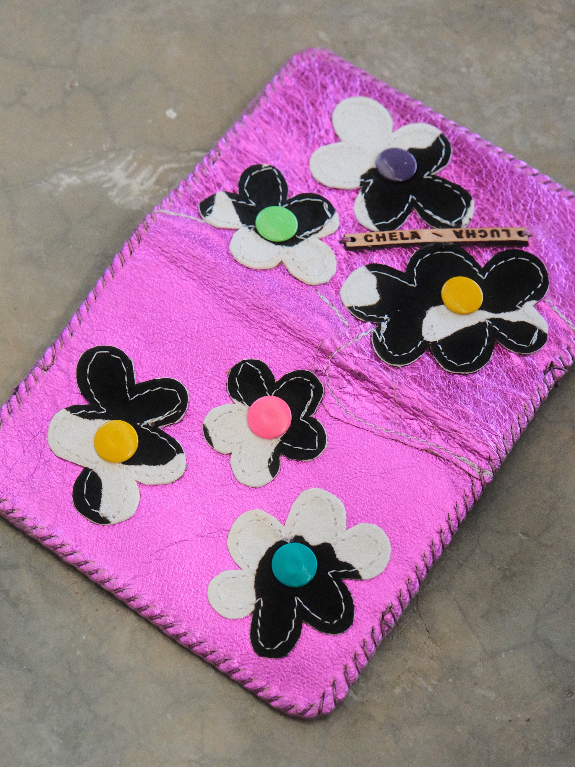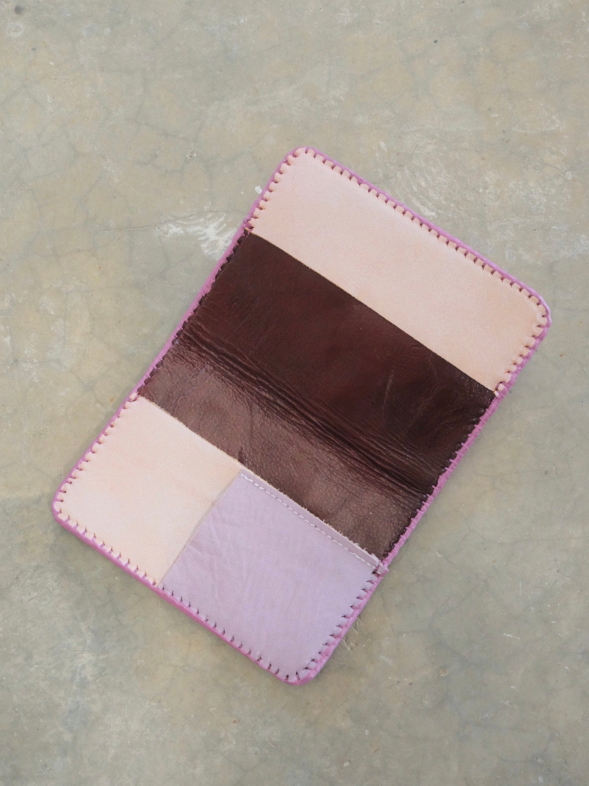 Porta pasaporte hecho con pedacera de piel en tonos variados. Detalles de remaches en tonos variados.