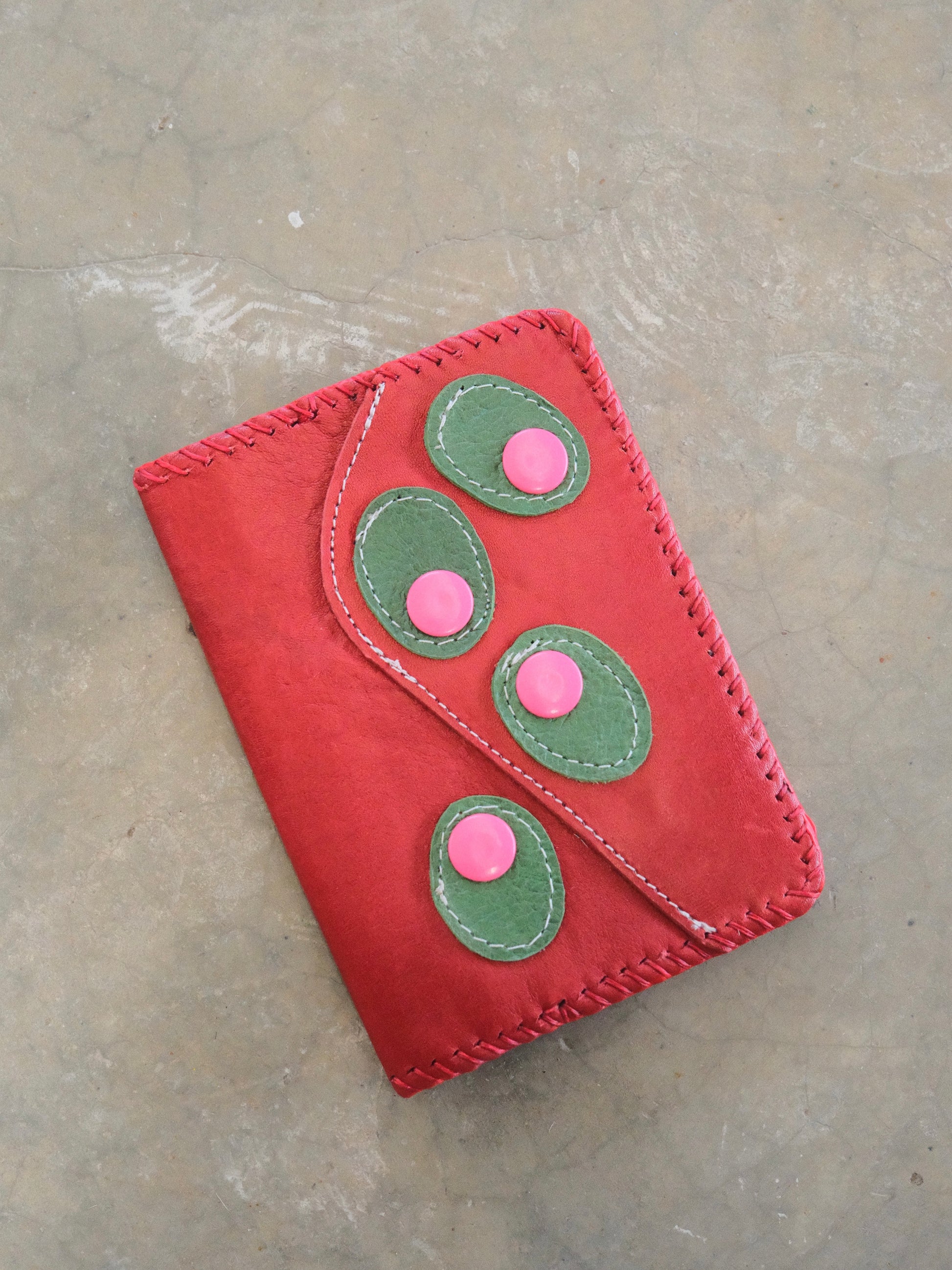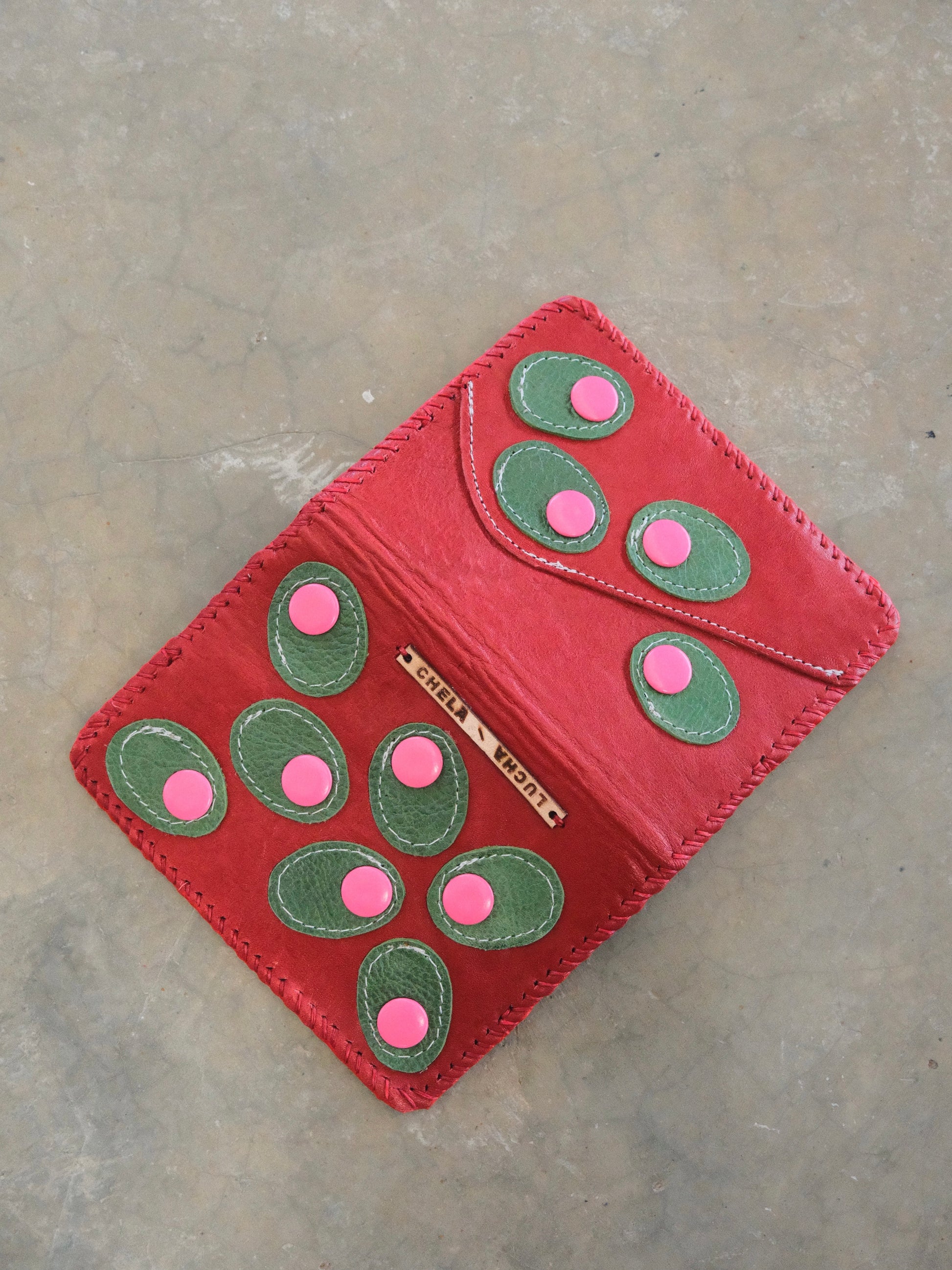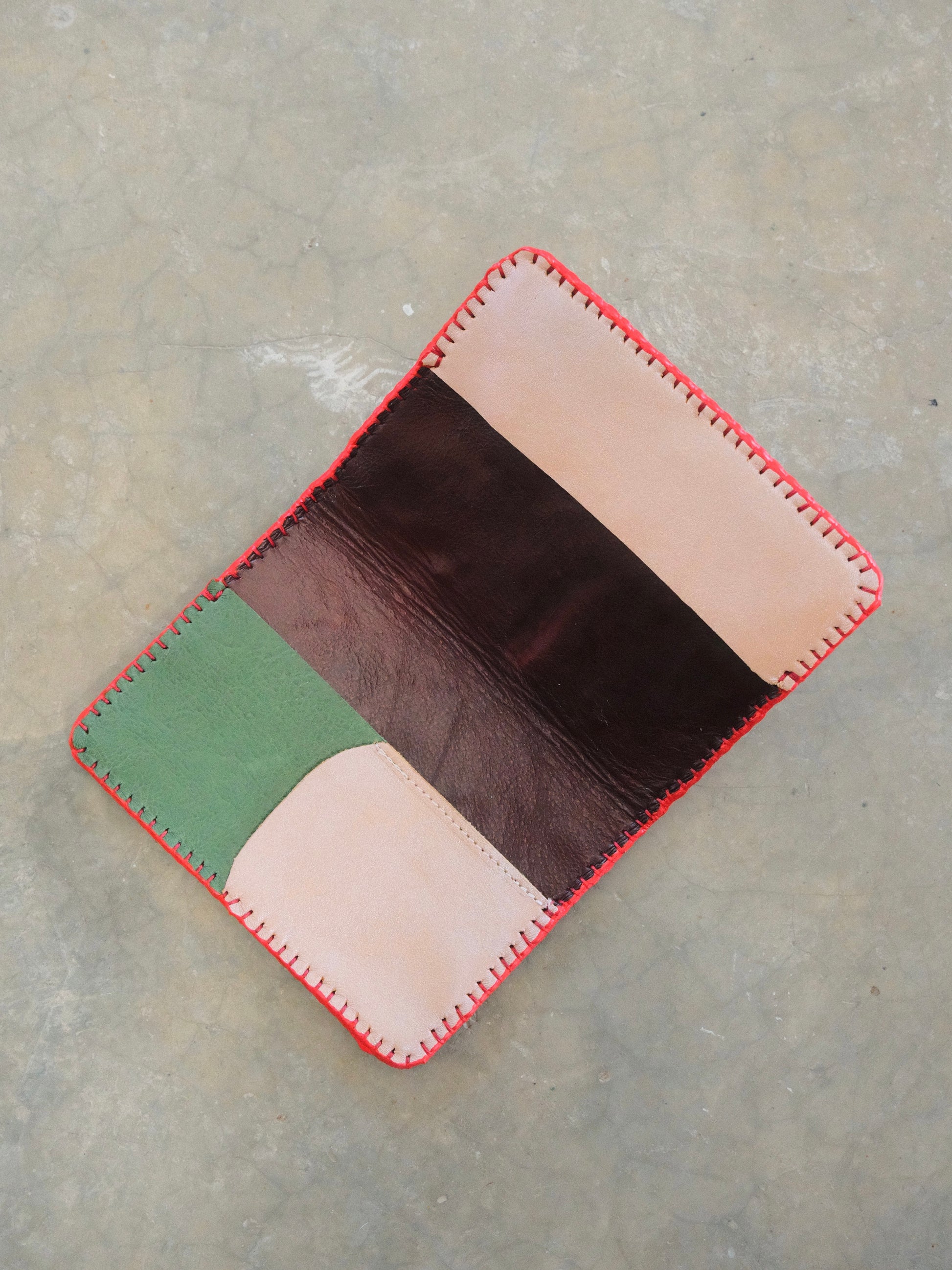 Porta pasaporte hecho con pedacera de piel en tonos variados. Detalles de remaches en tono rosa.