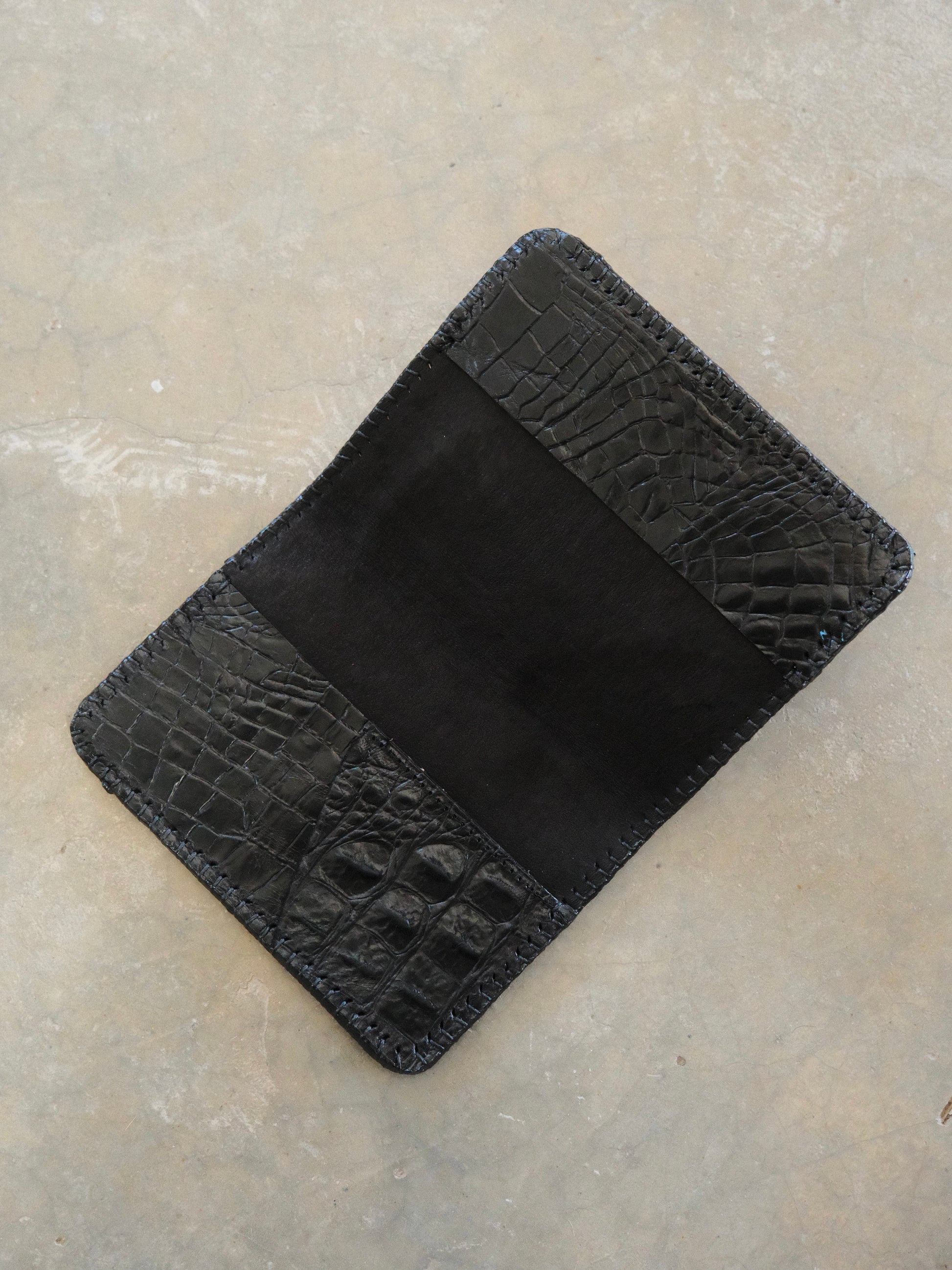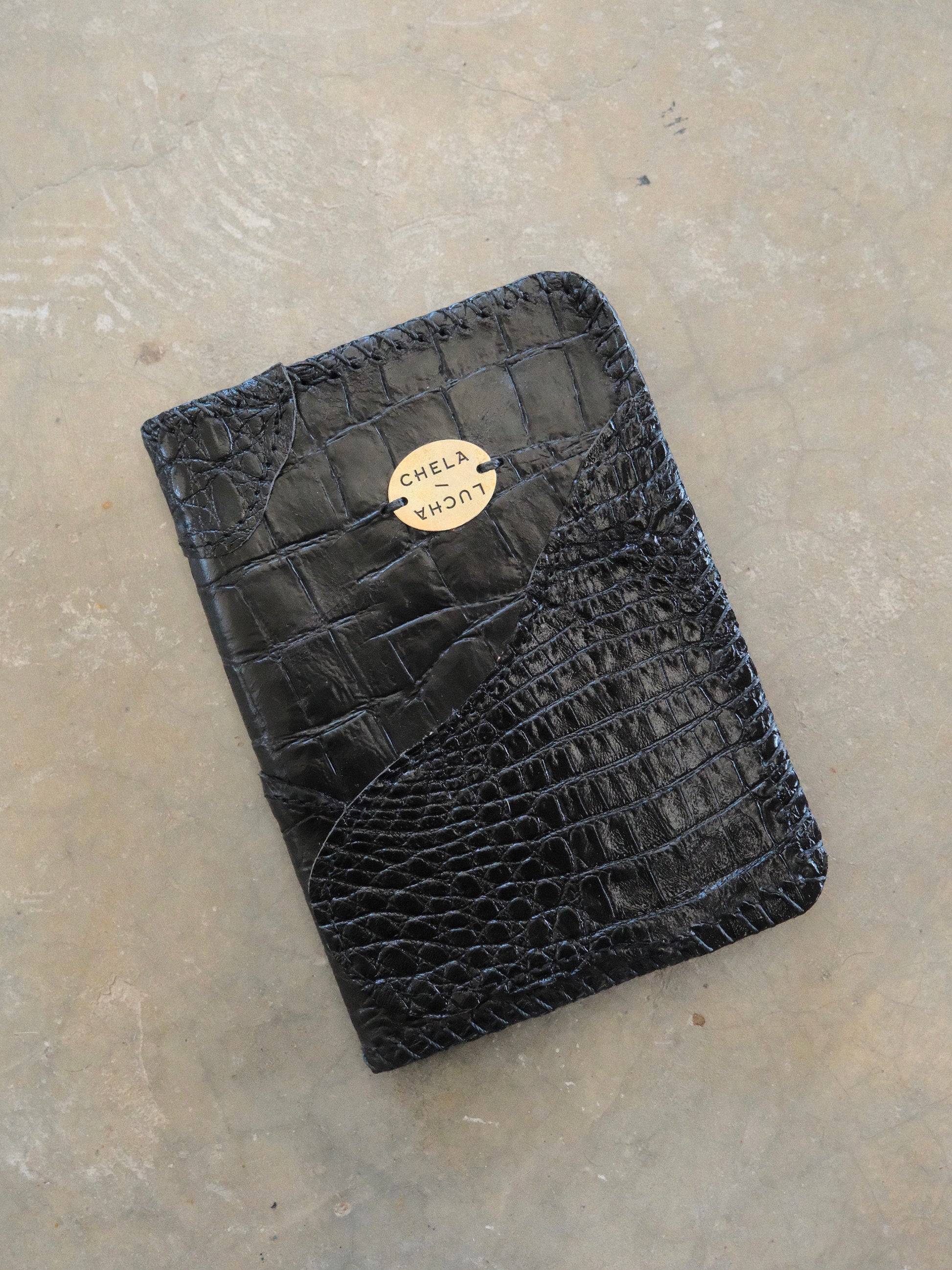 Porta pasaporte hecho con pedacera de piel en tono negro.