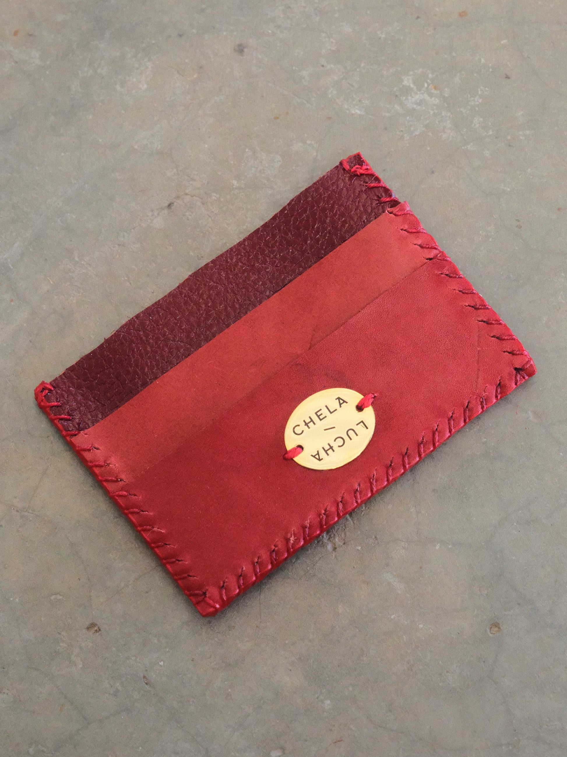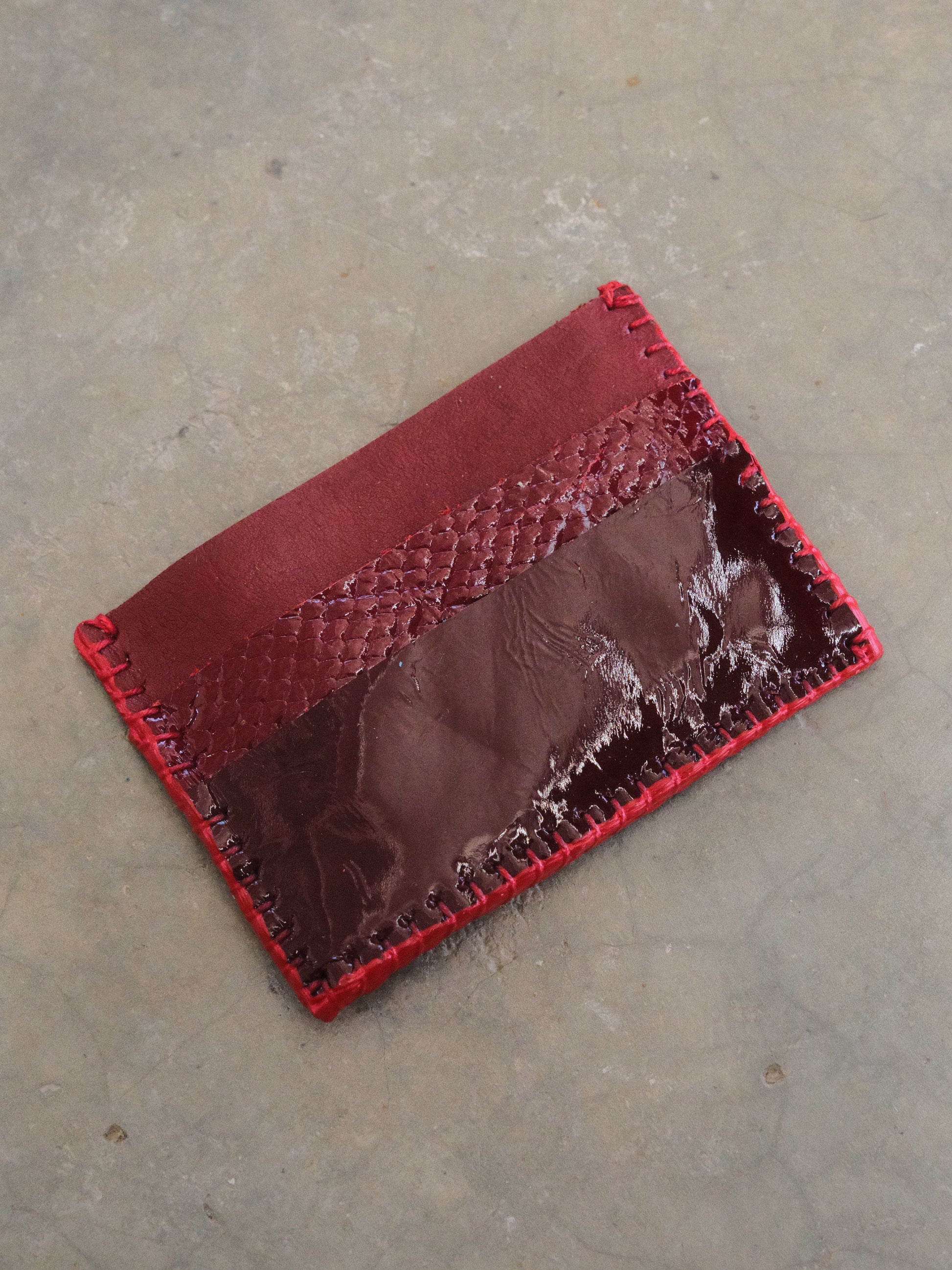 Tarjetero hecho con pedacera de piel en tonos rojos.