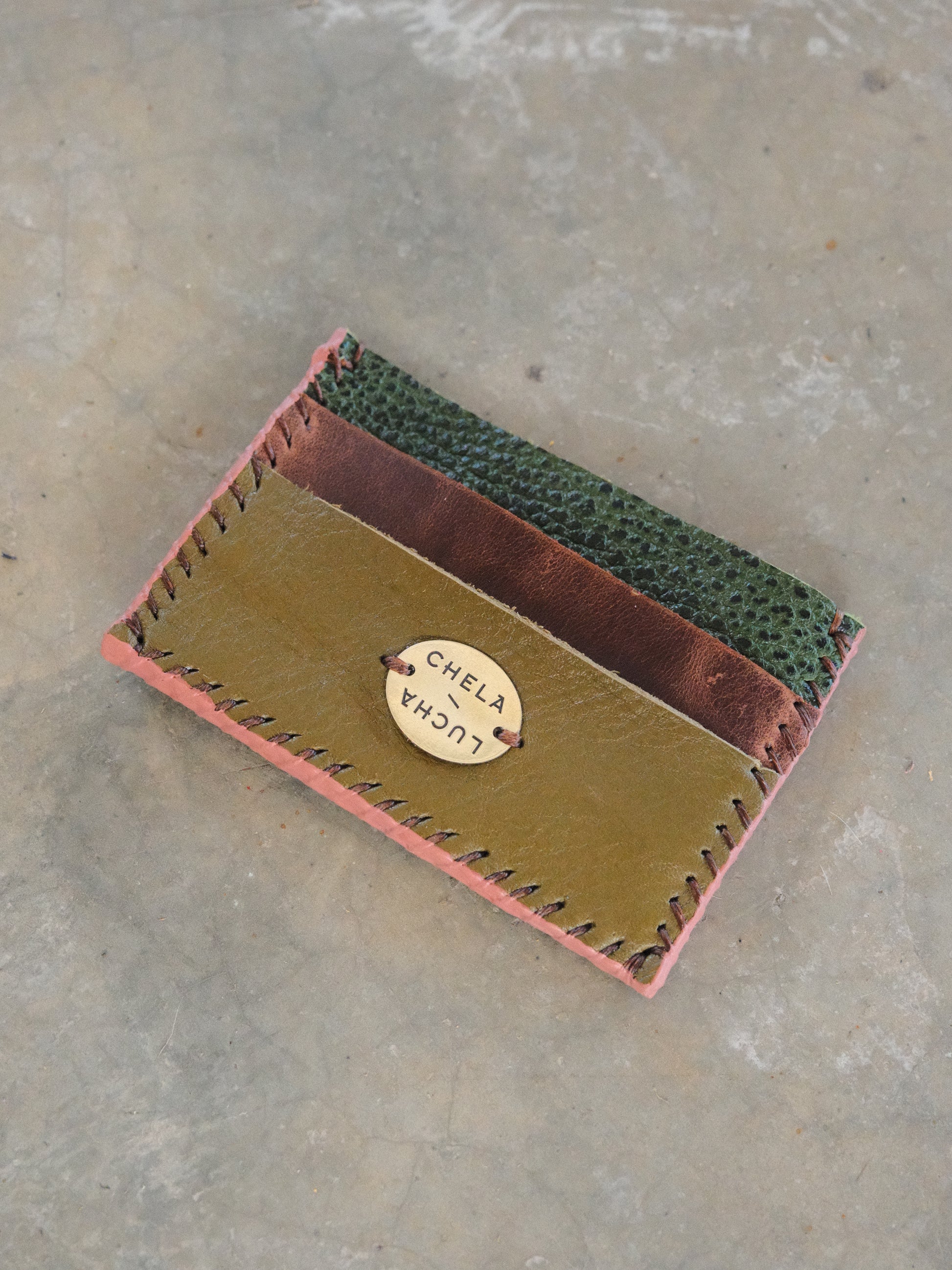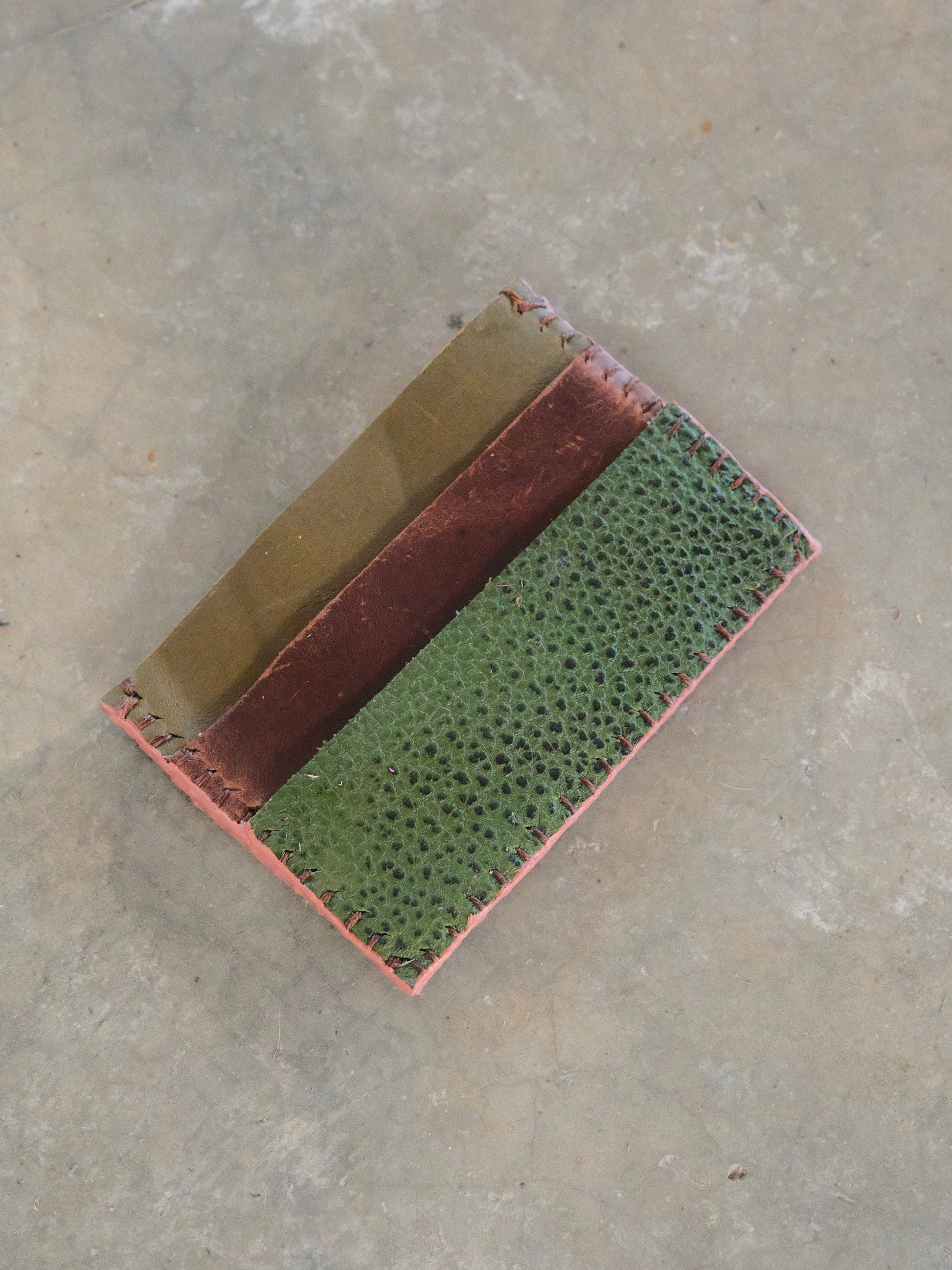 Tarjetero hecho de pedacera de piel en tonos variados.