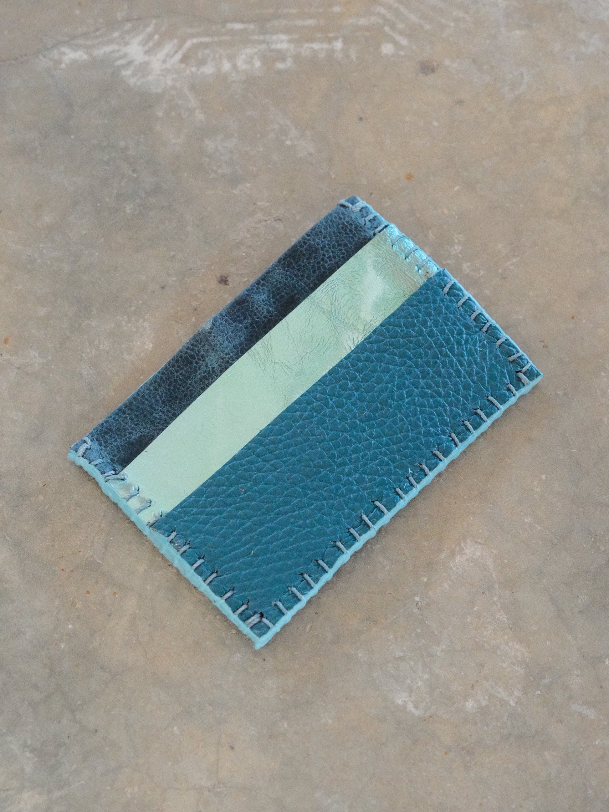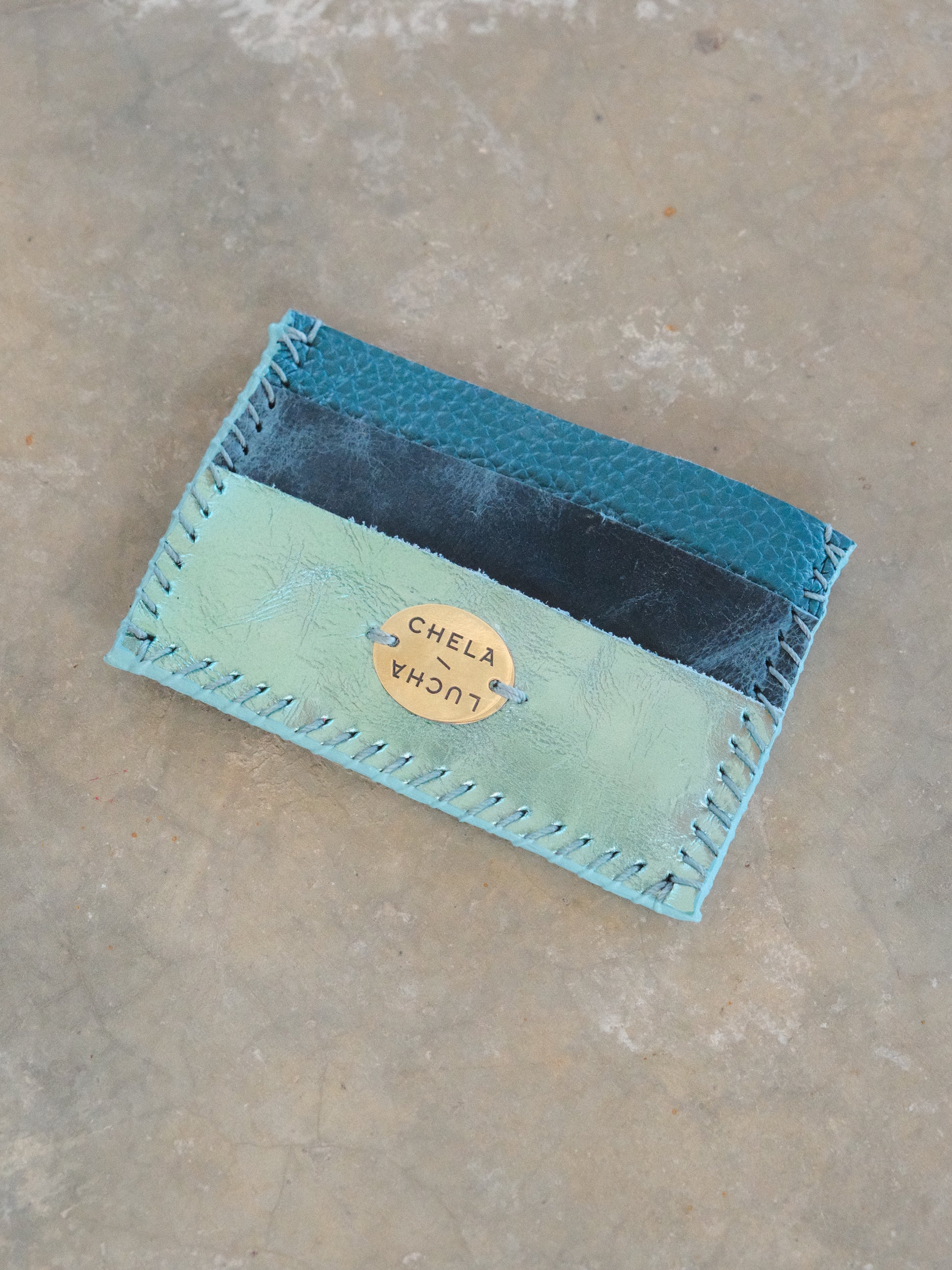 Tarjetero hecho de pedacera de piel en tonos azules.