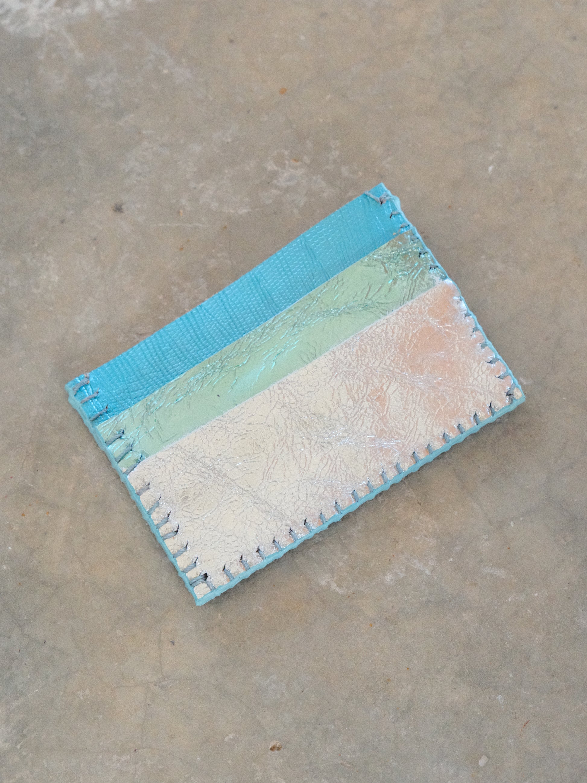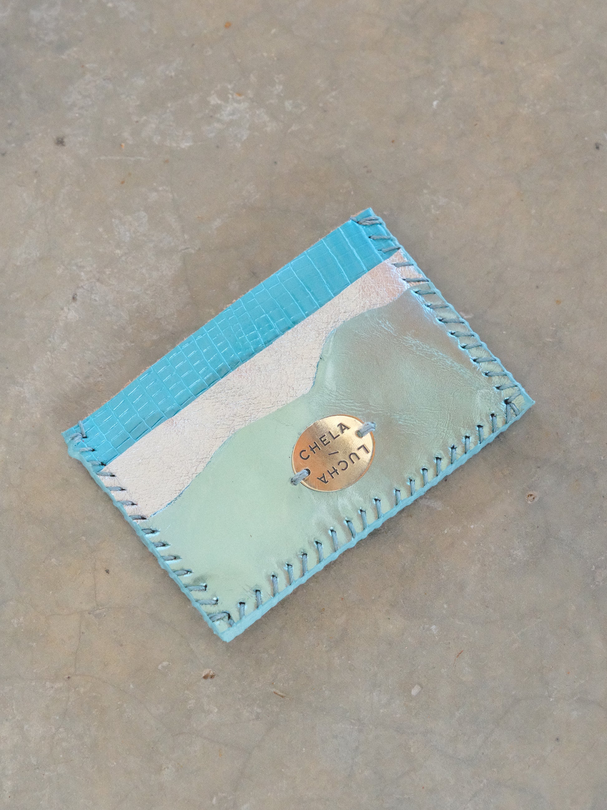 Tarjetero hecho de pedacera de piel en tonos variados.