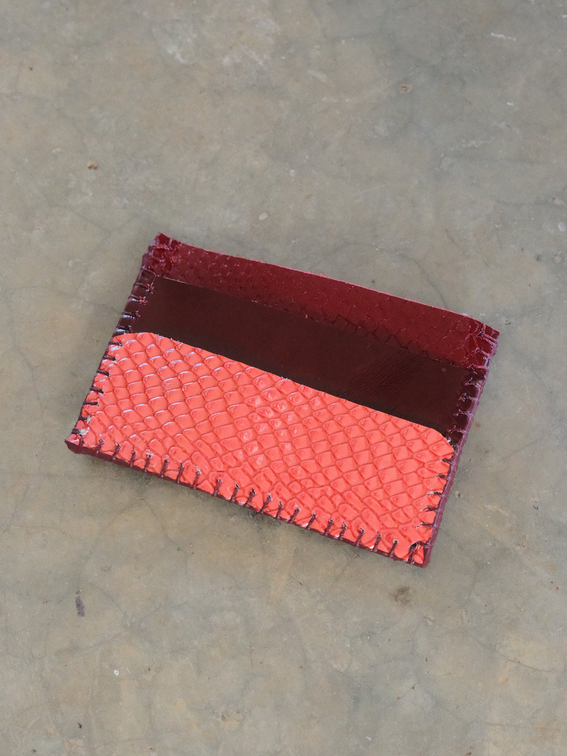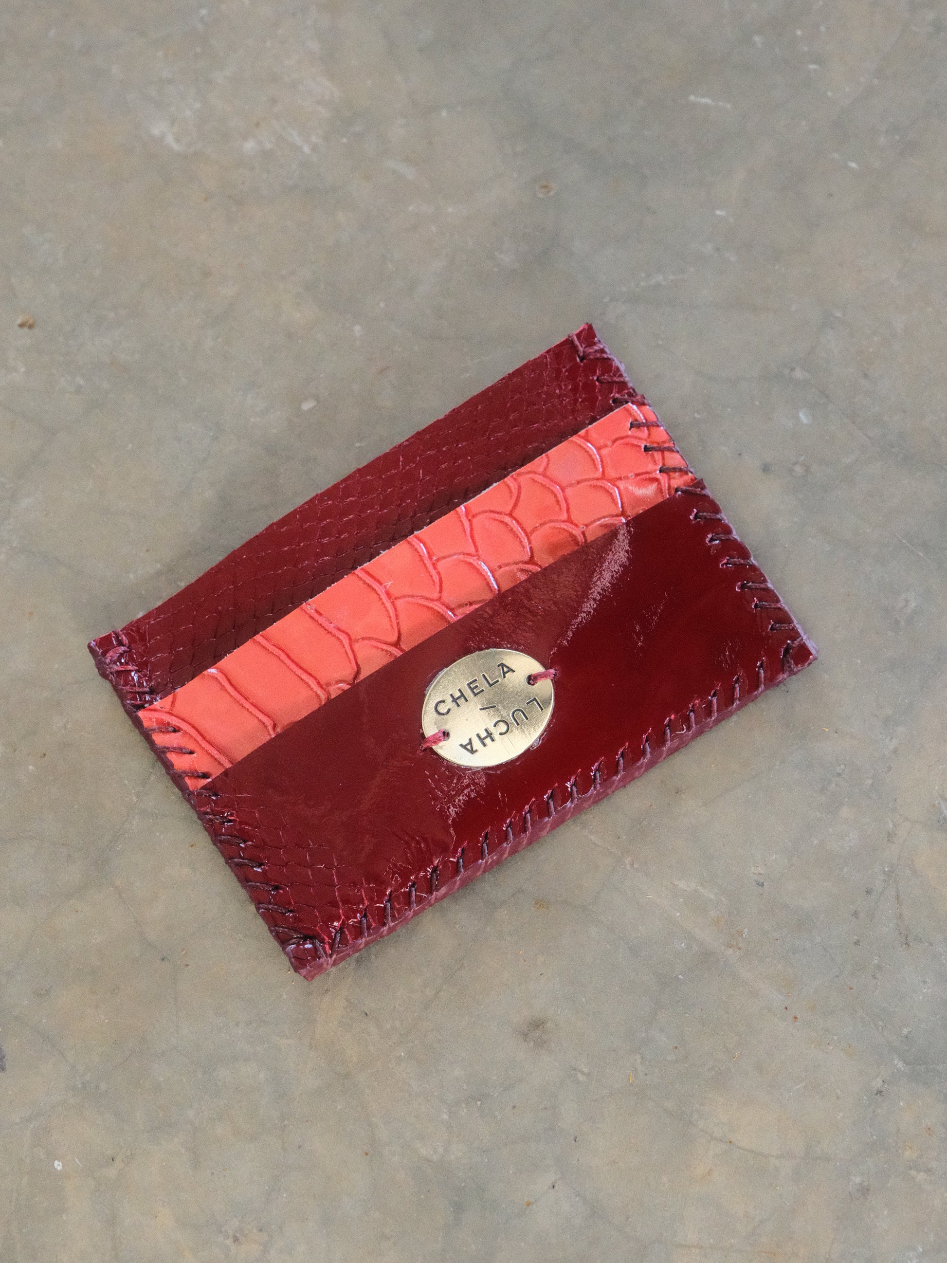 Tarjetero hecho de pedacera de piel en tonos rojos.