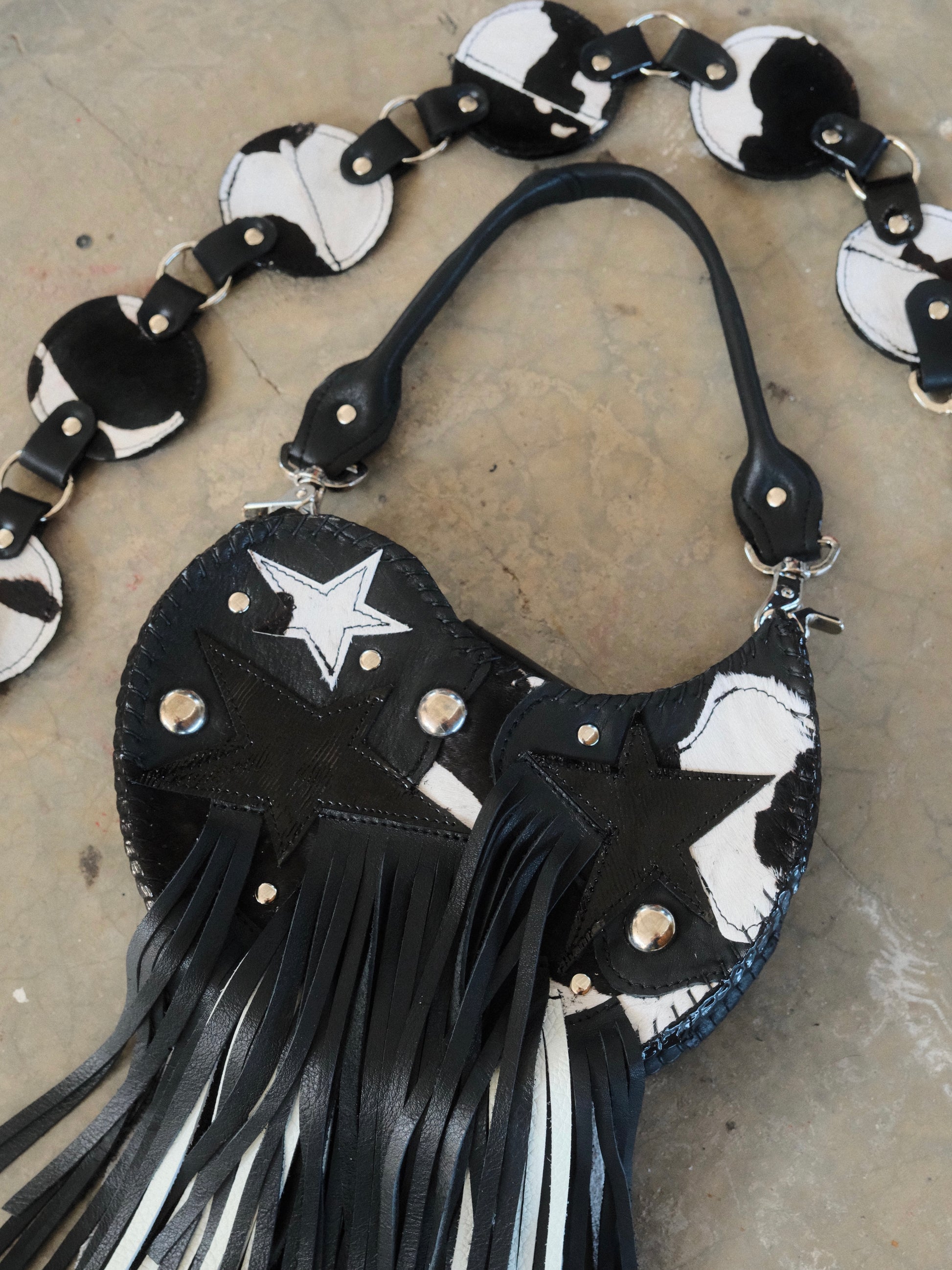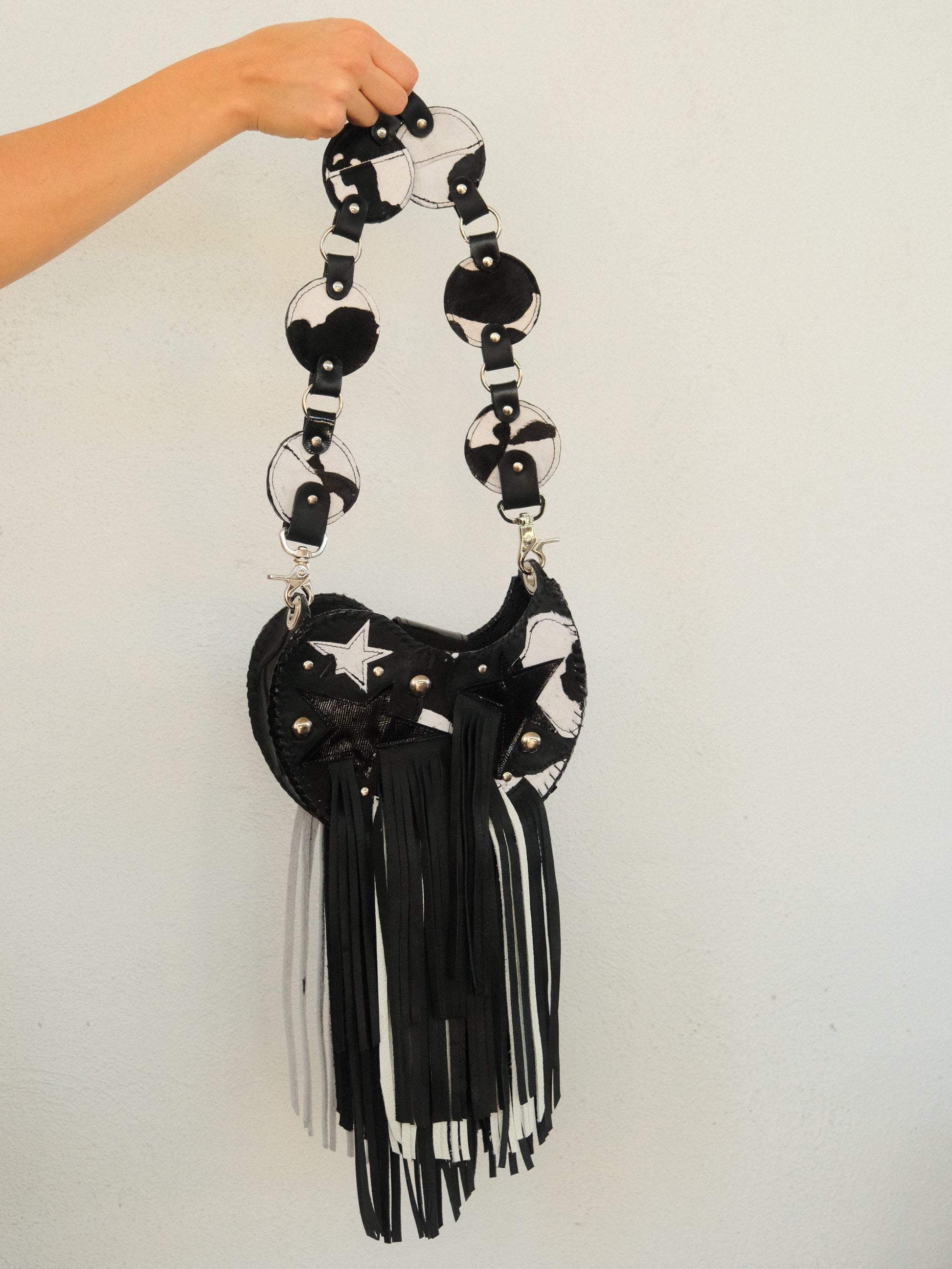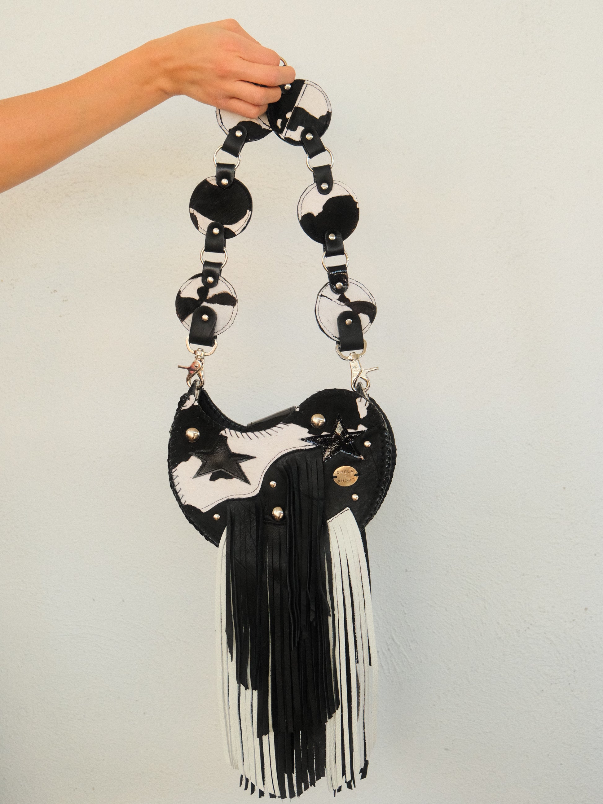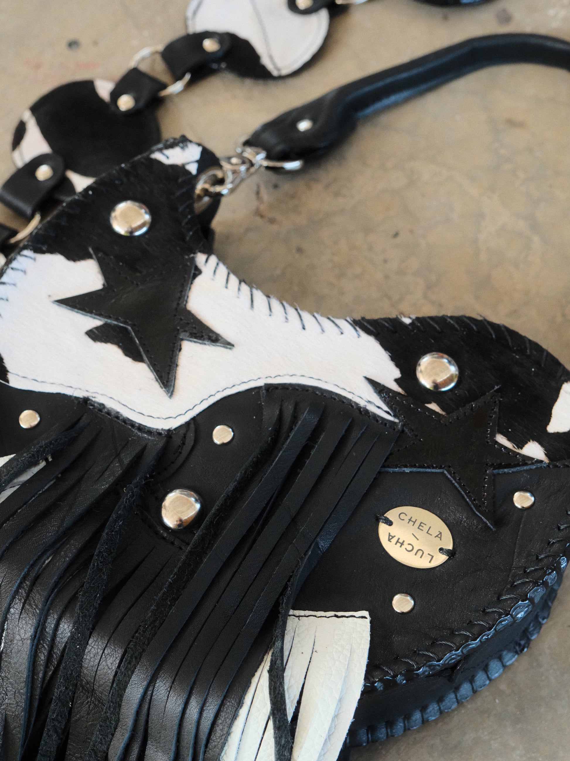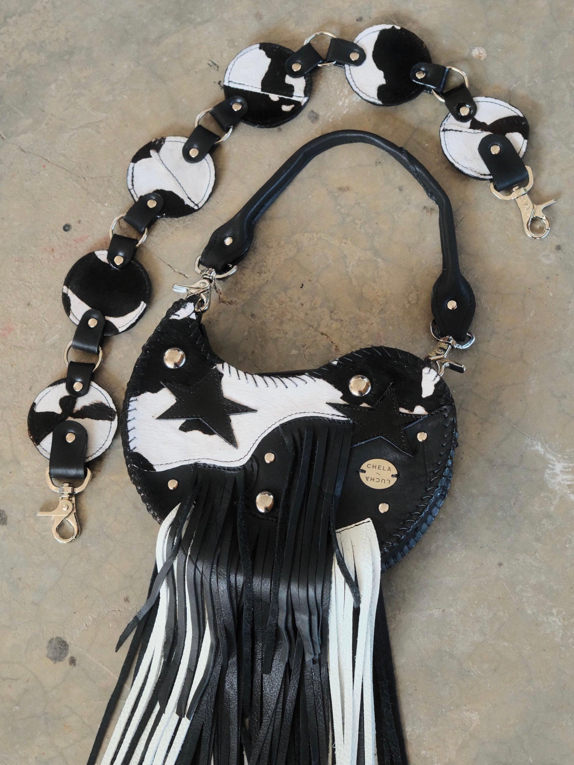Bolsa TOÑA hecha con pedacera de piel en tonos negro y textura de pelito.