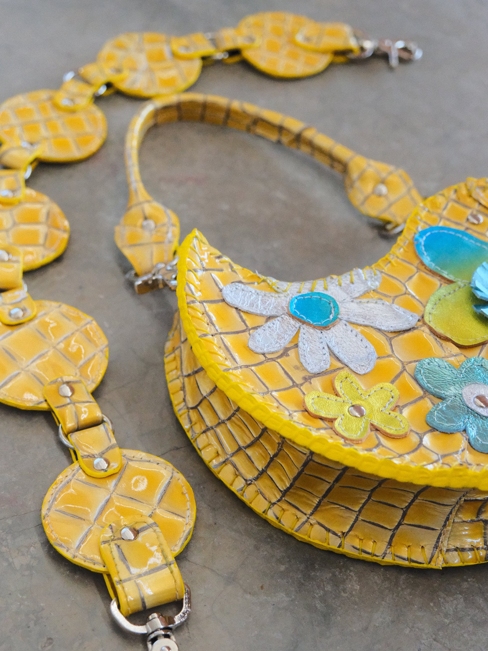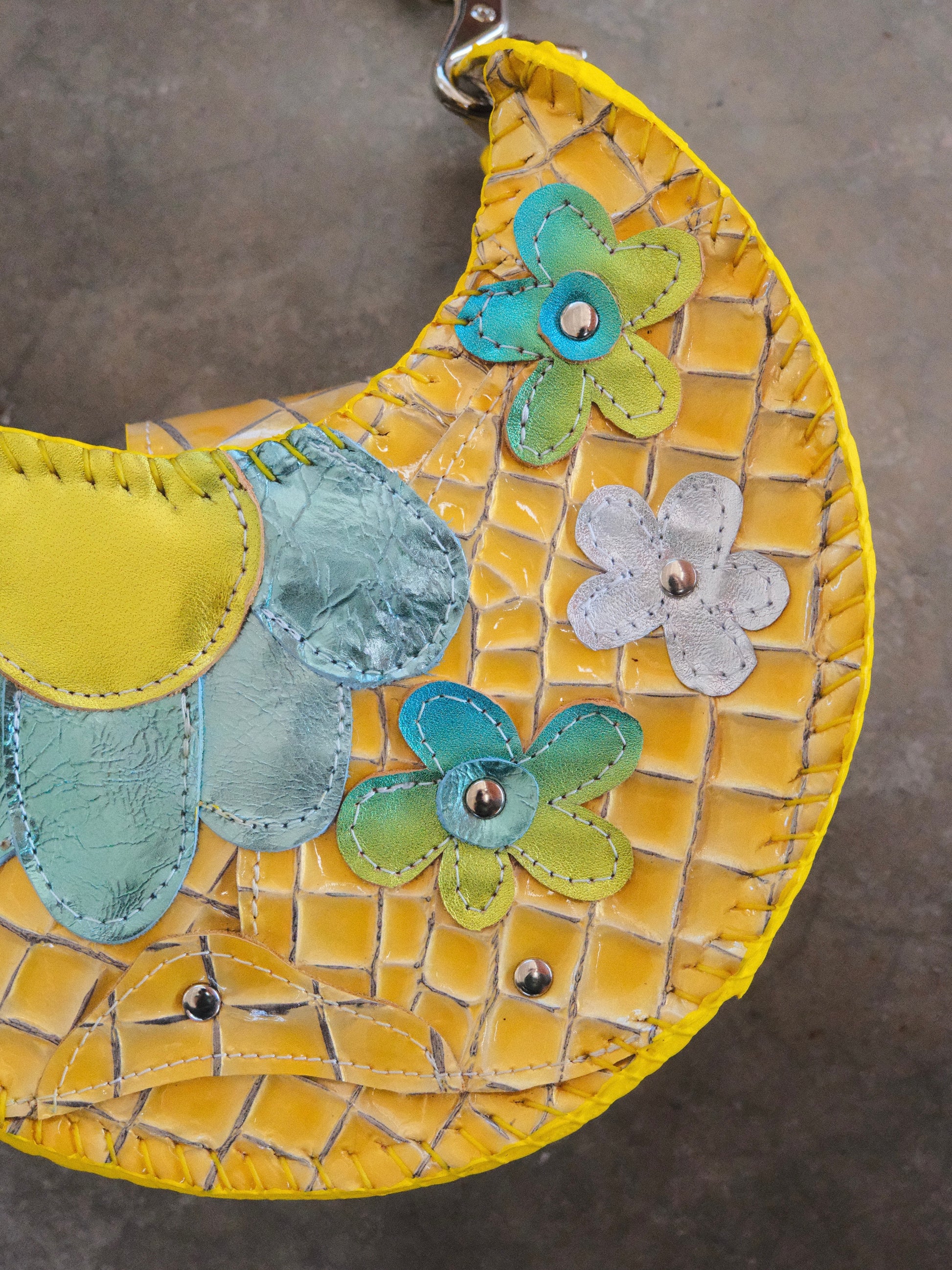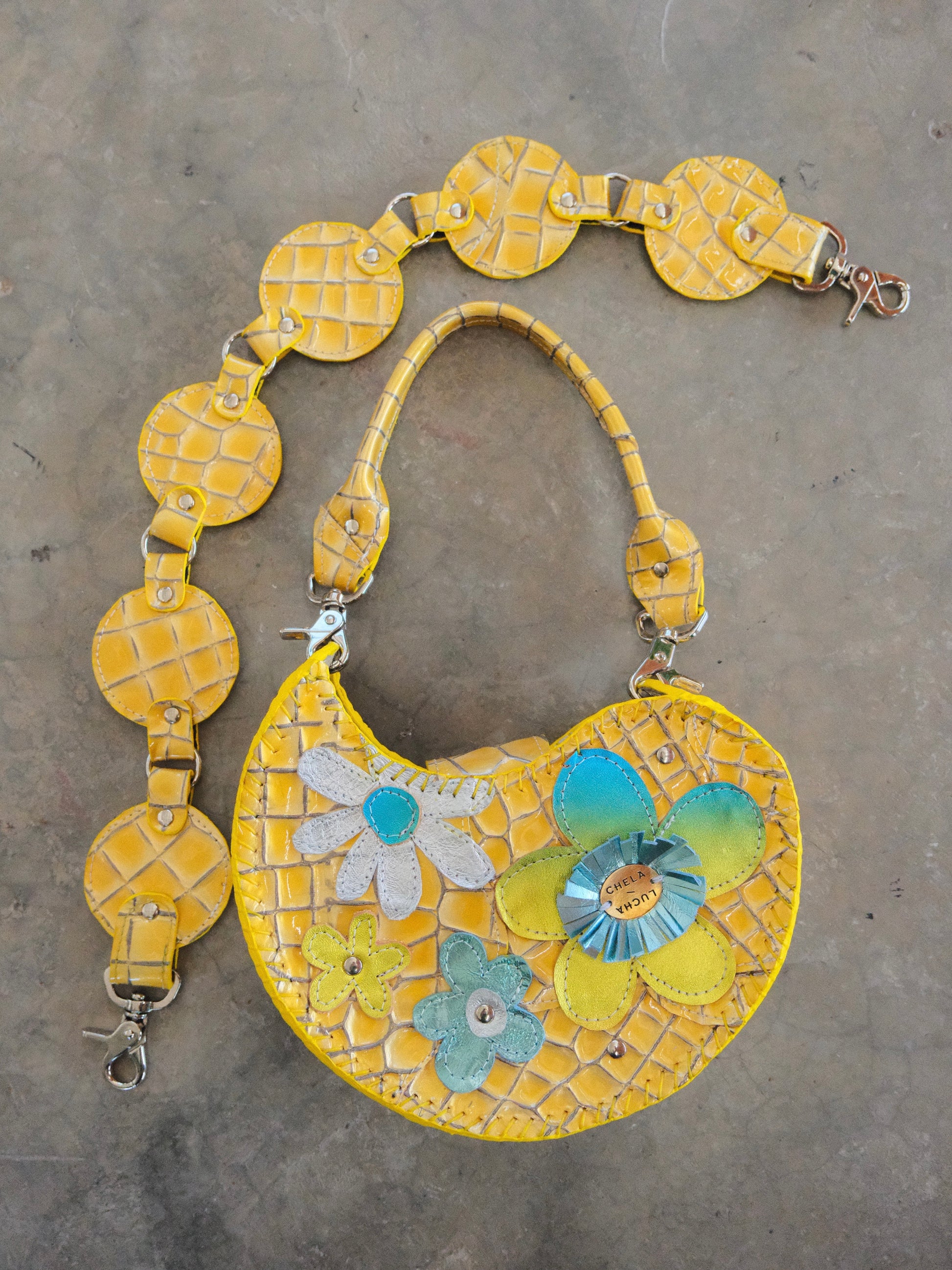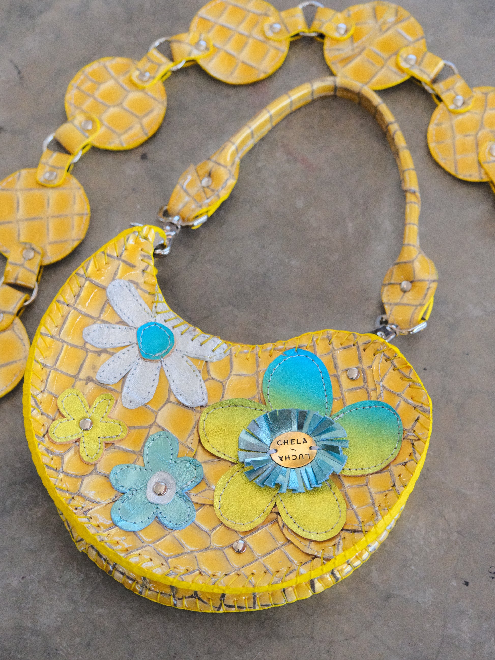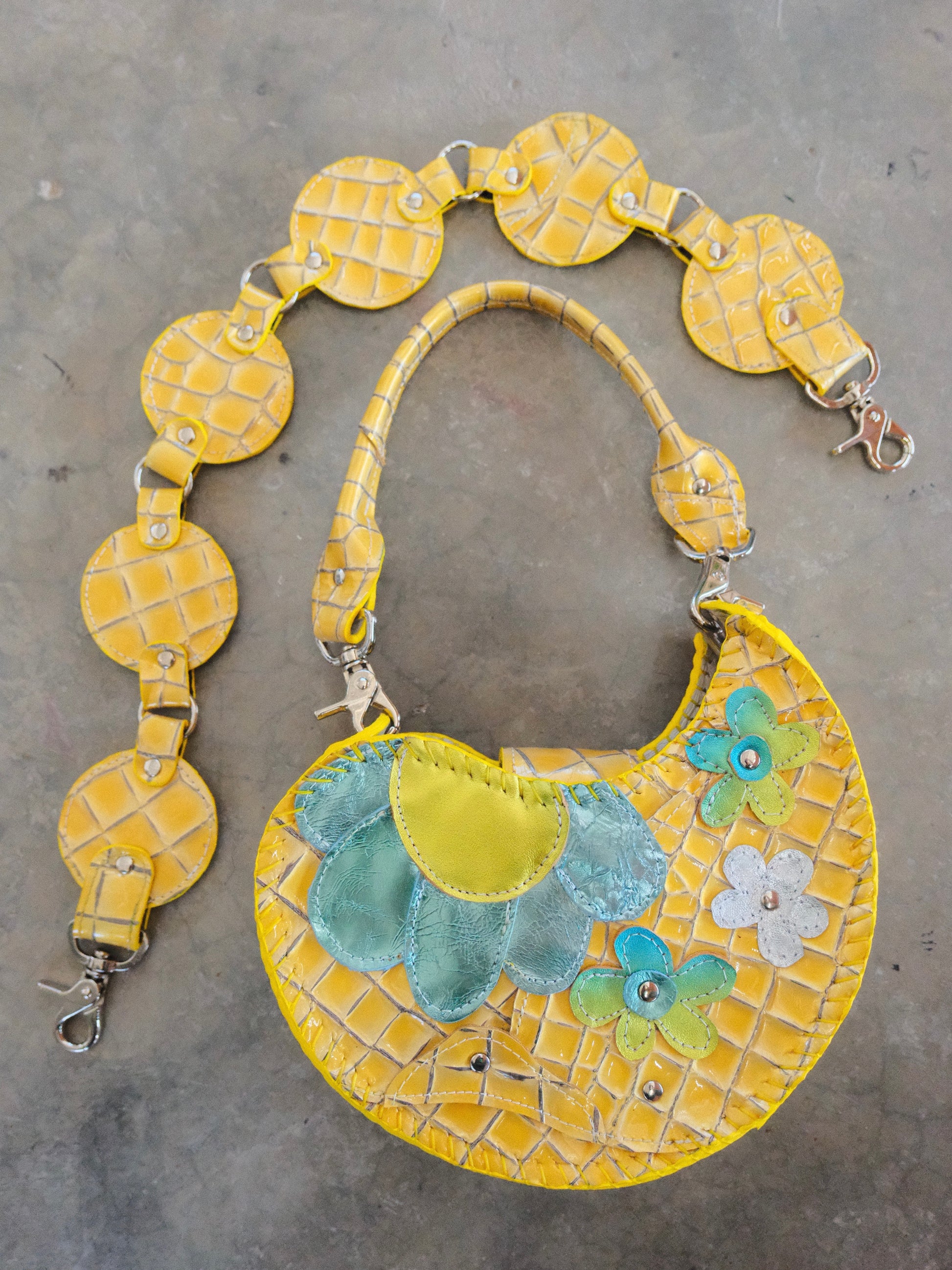 Bolsa TOÑA hecha con pedacera de piel en tonos variados. Detalles de remaches en tono plateado.