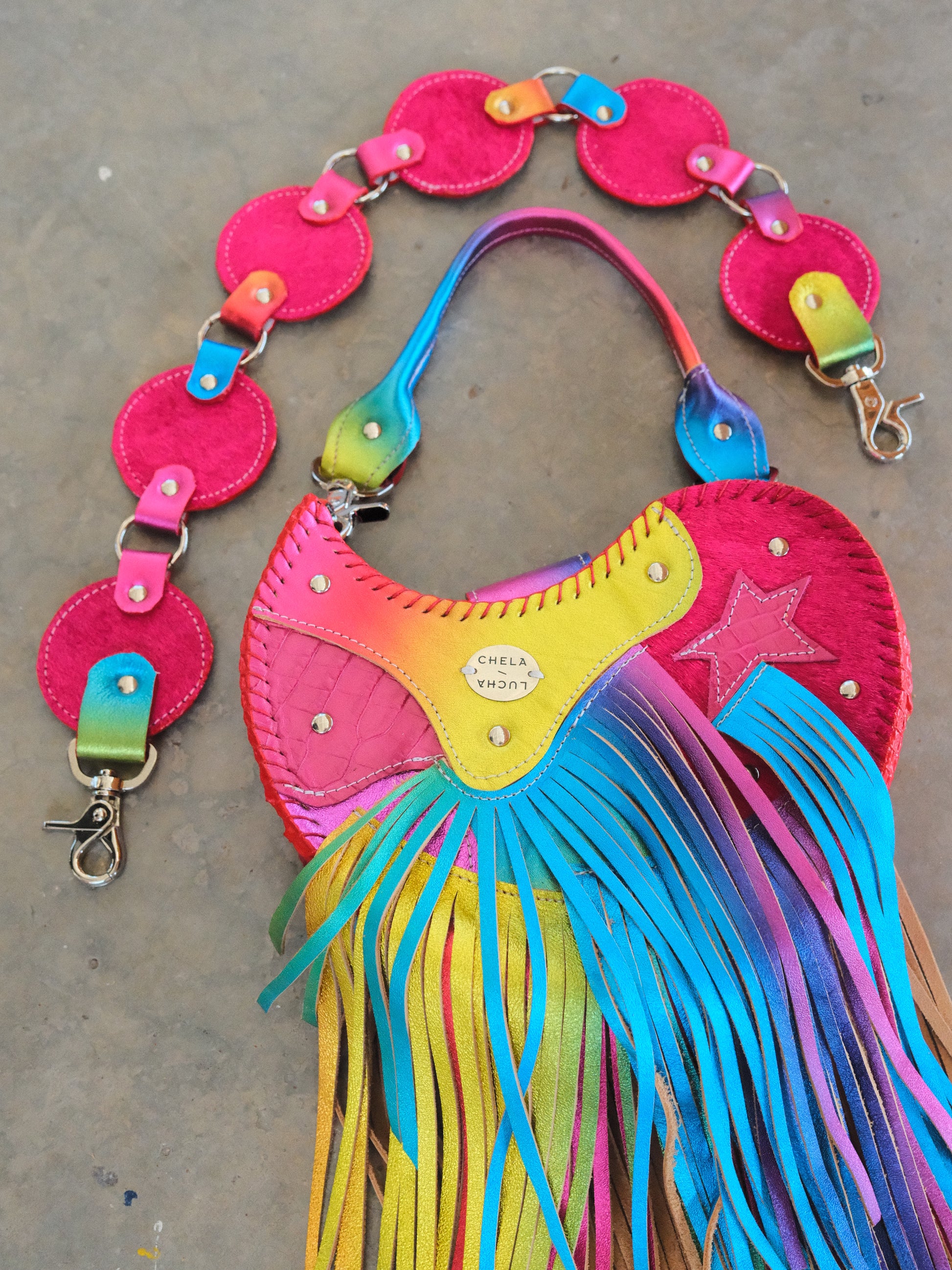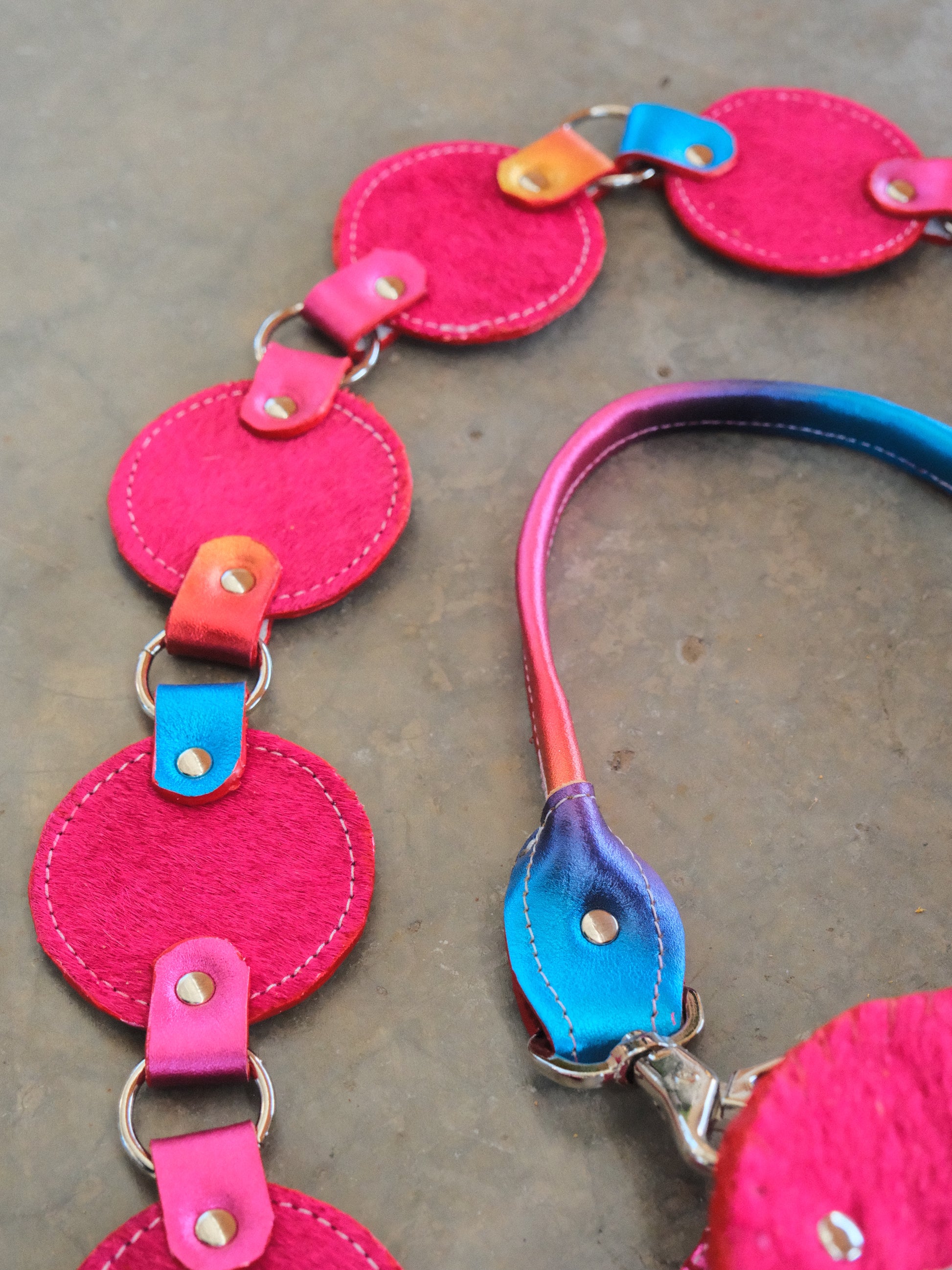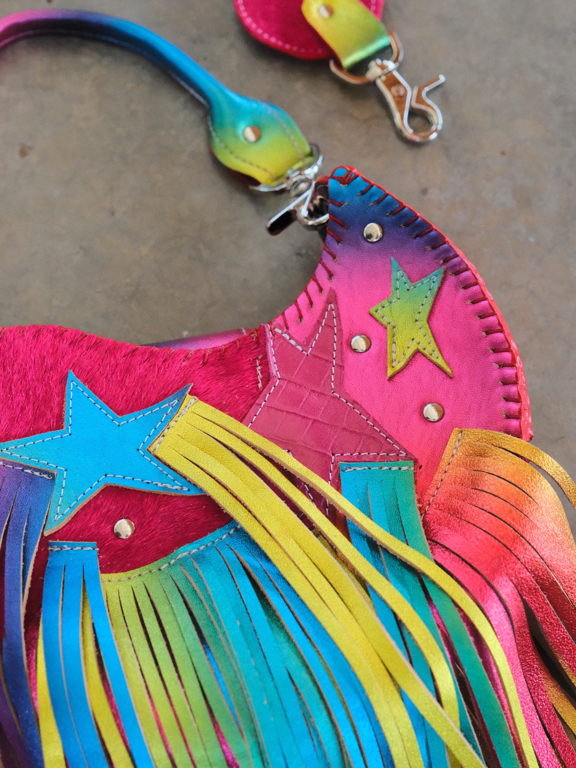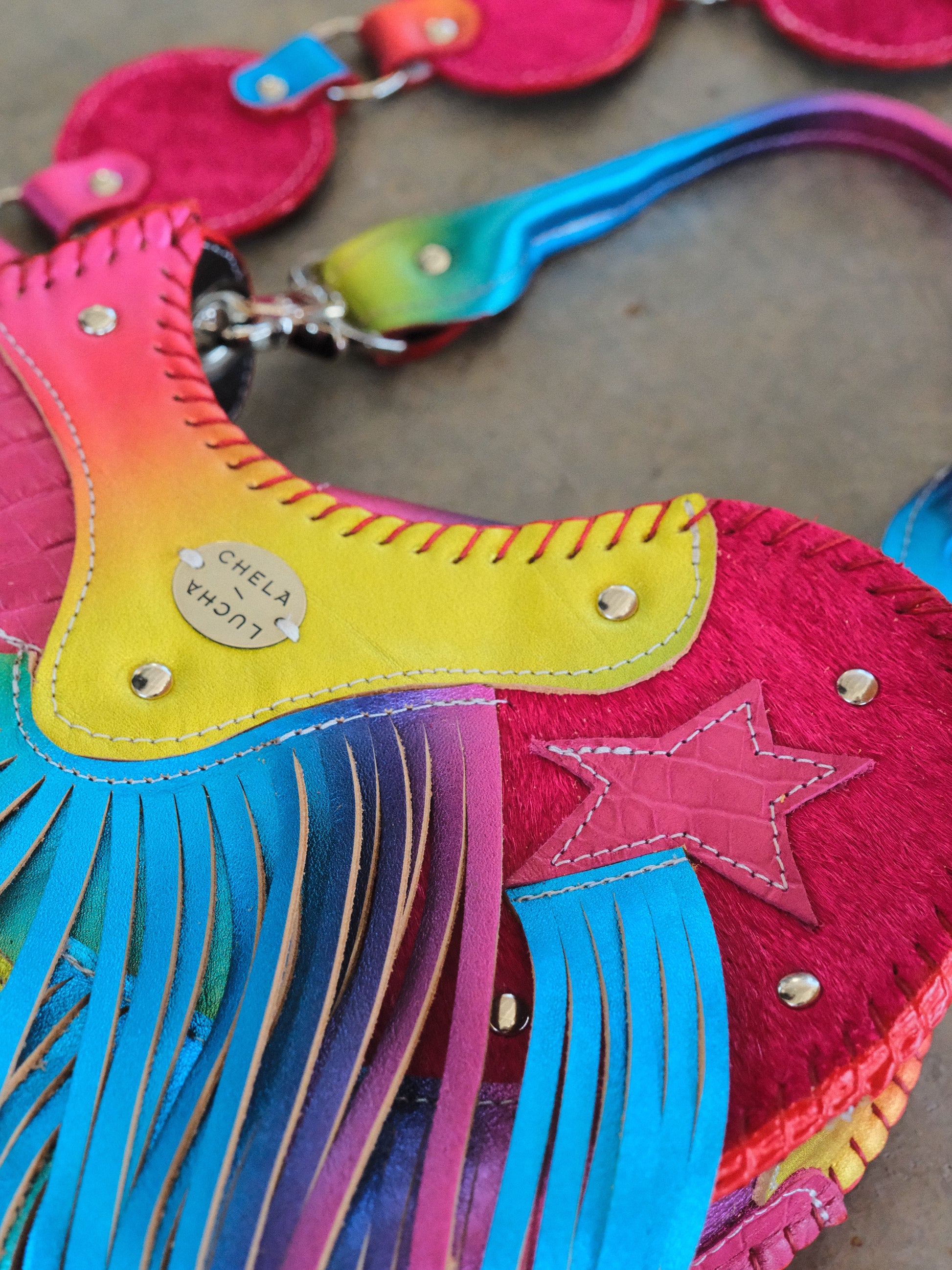 Bolsa TOÑA hecha con pedacera de piel en tonos variados. Detalles de remaches en tono plateado.