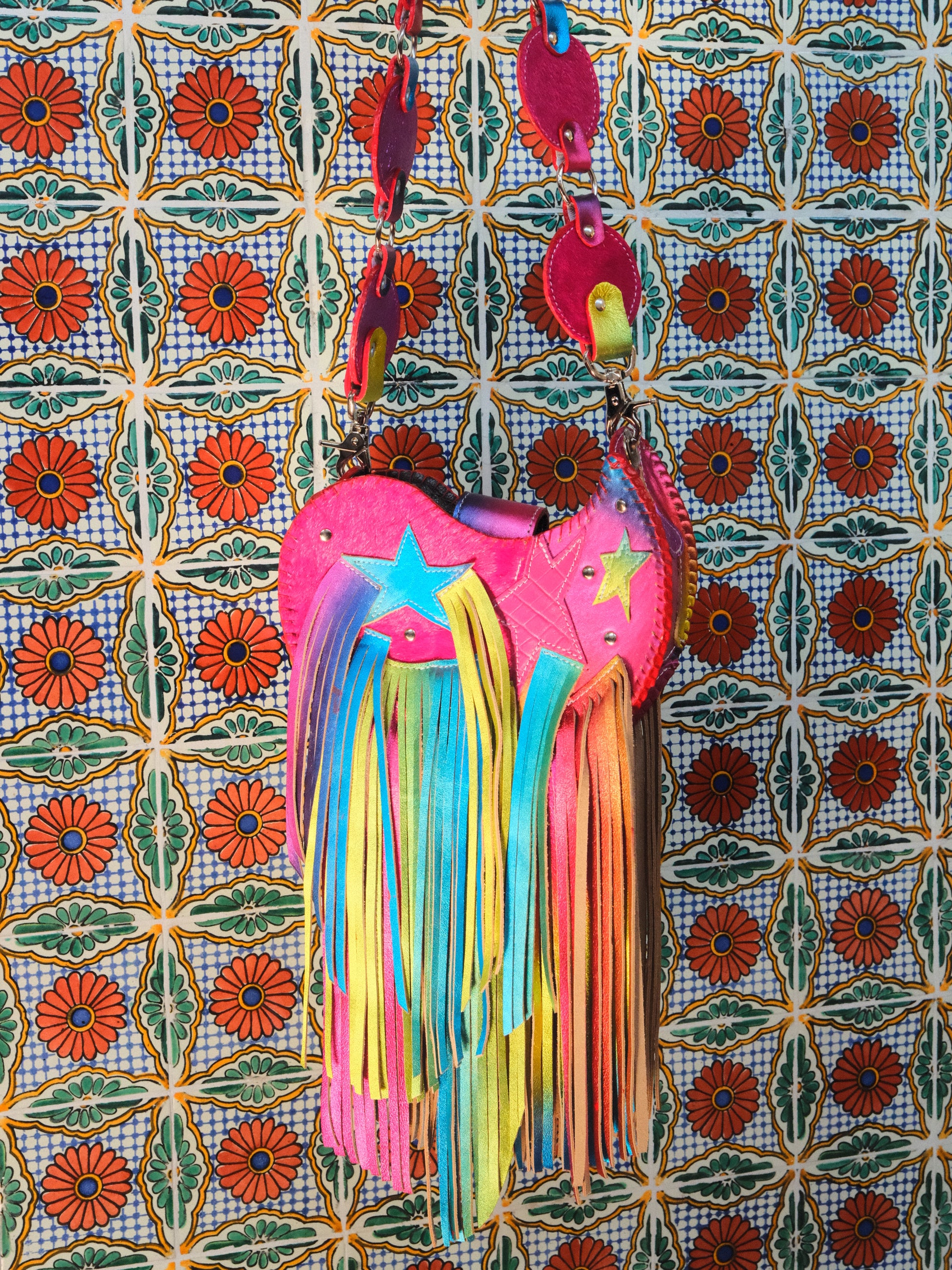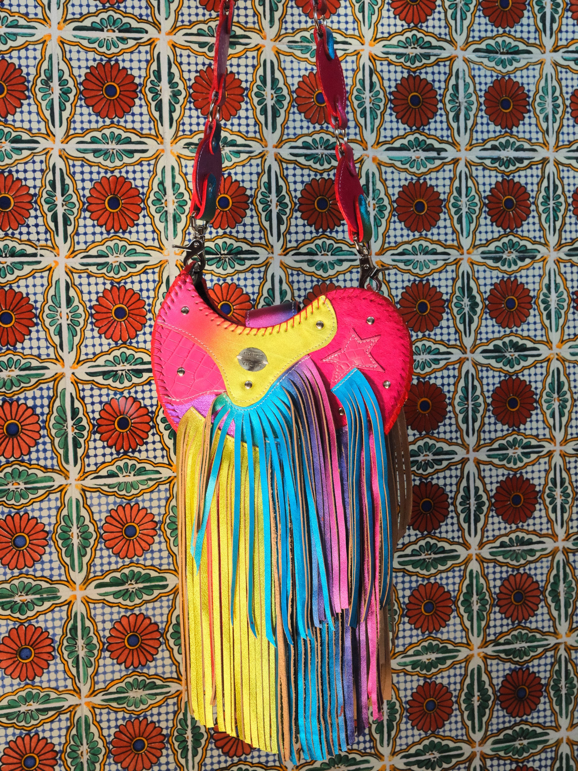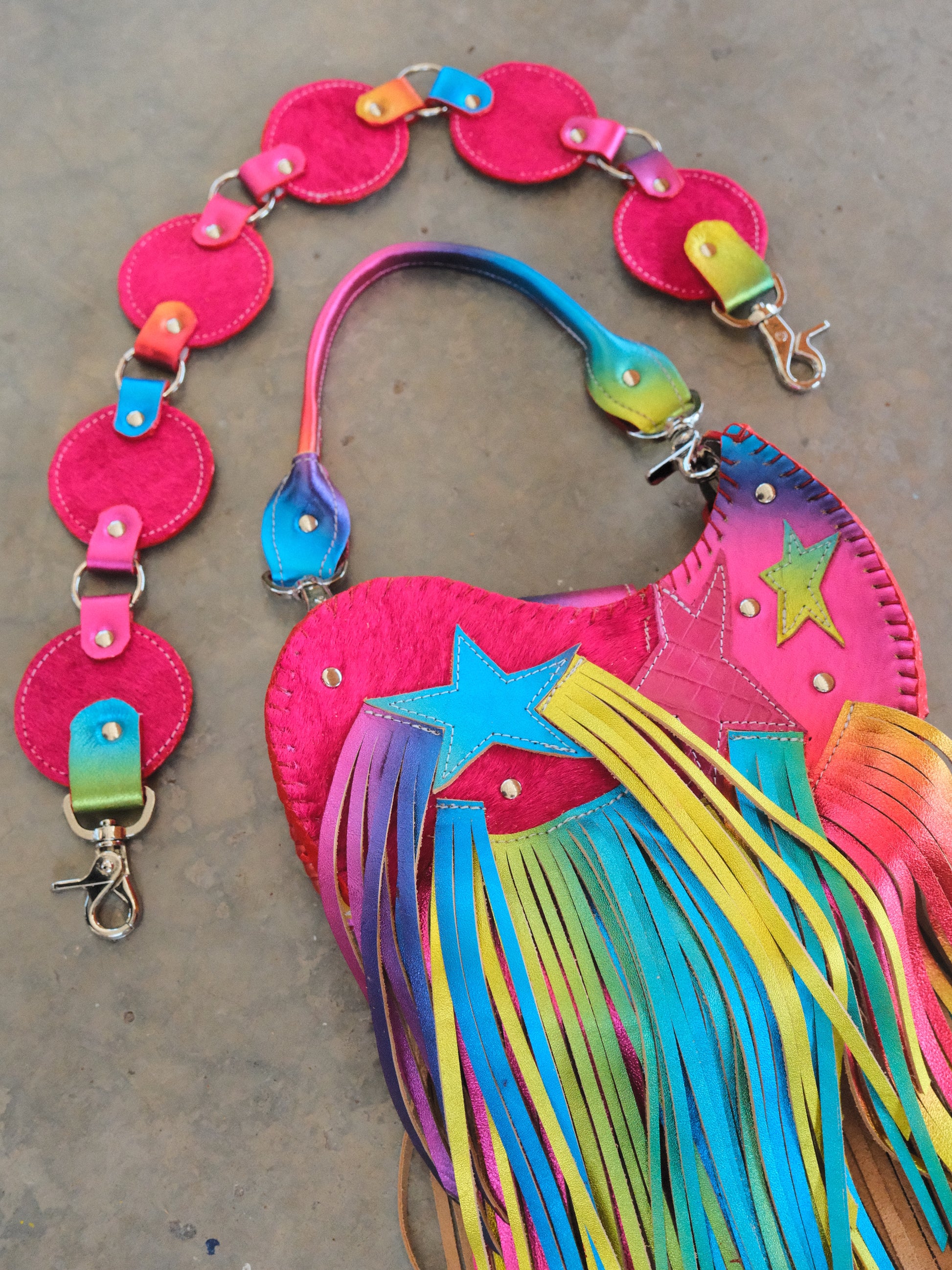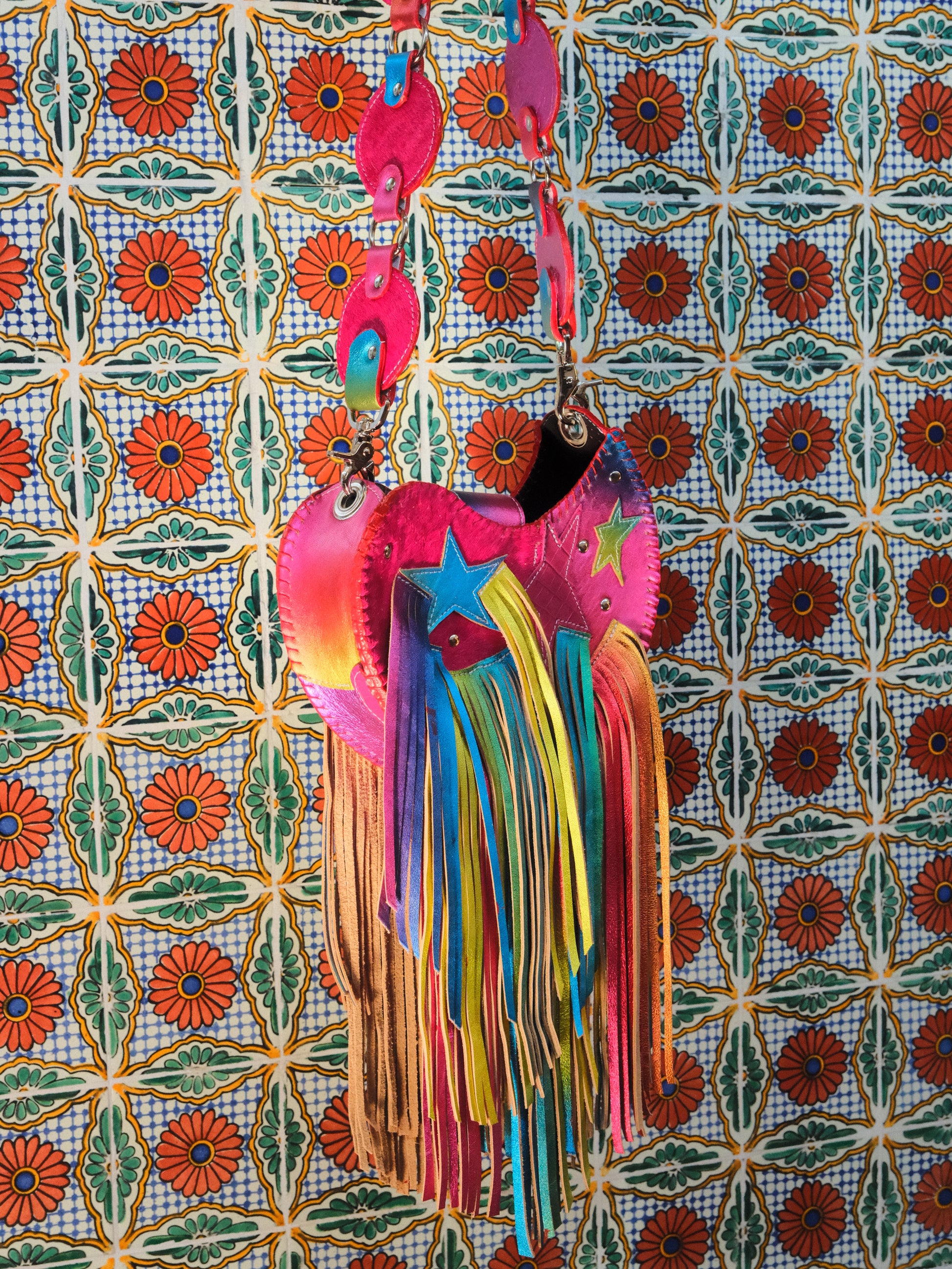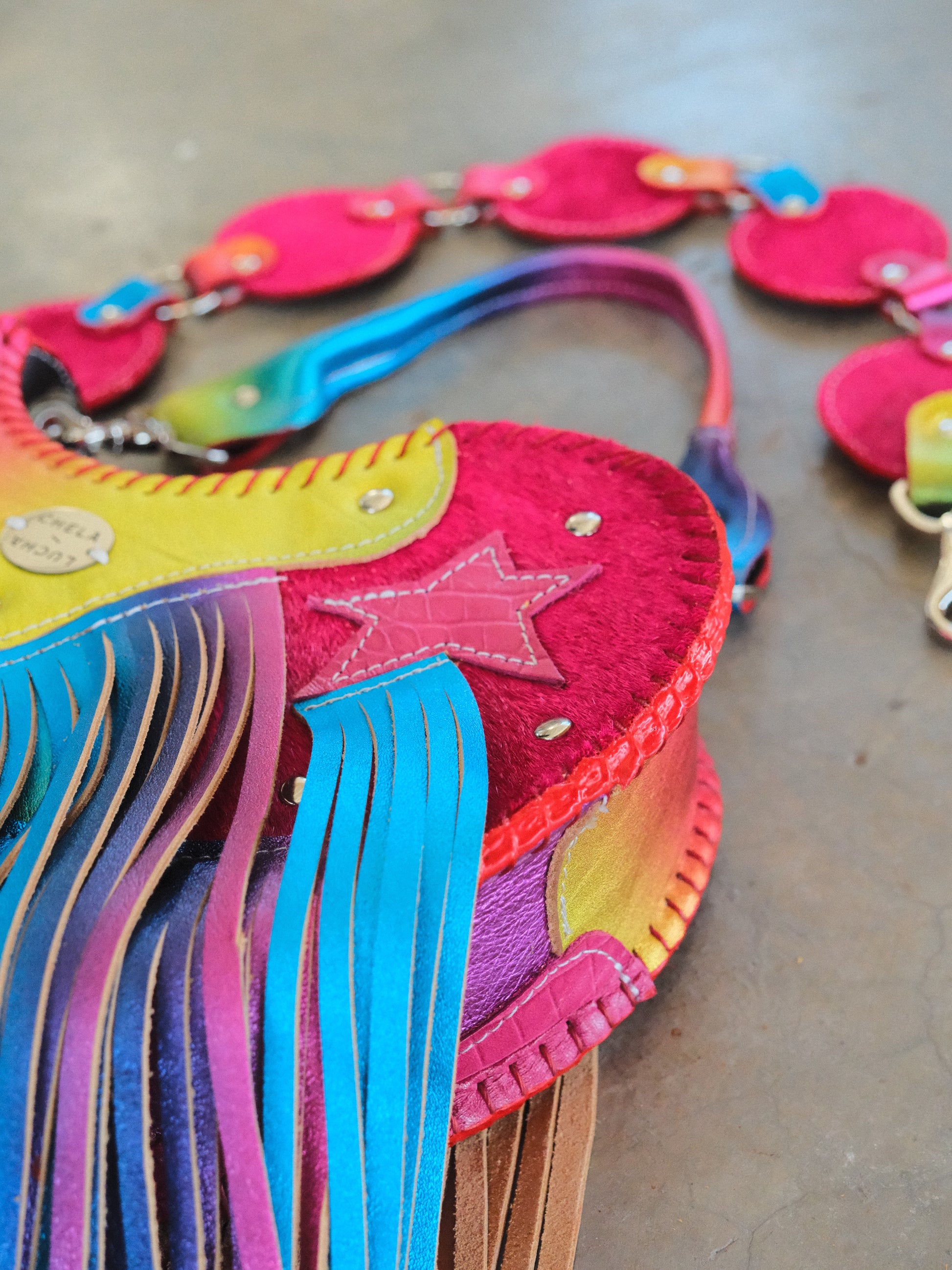 Bolsa TOÑA hecha con pedacera de piel en tonos variados. Detalles de remaches en tono plateado.
