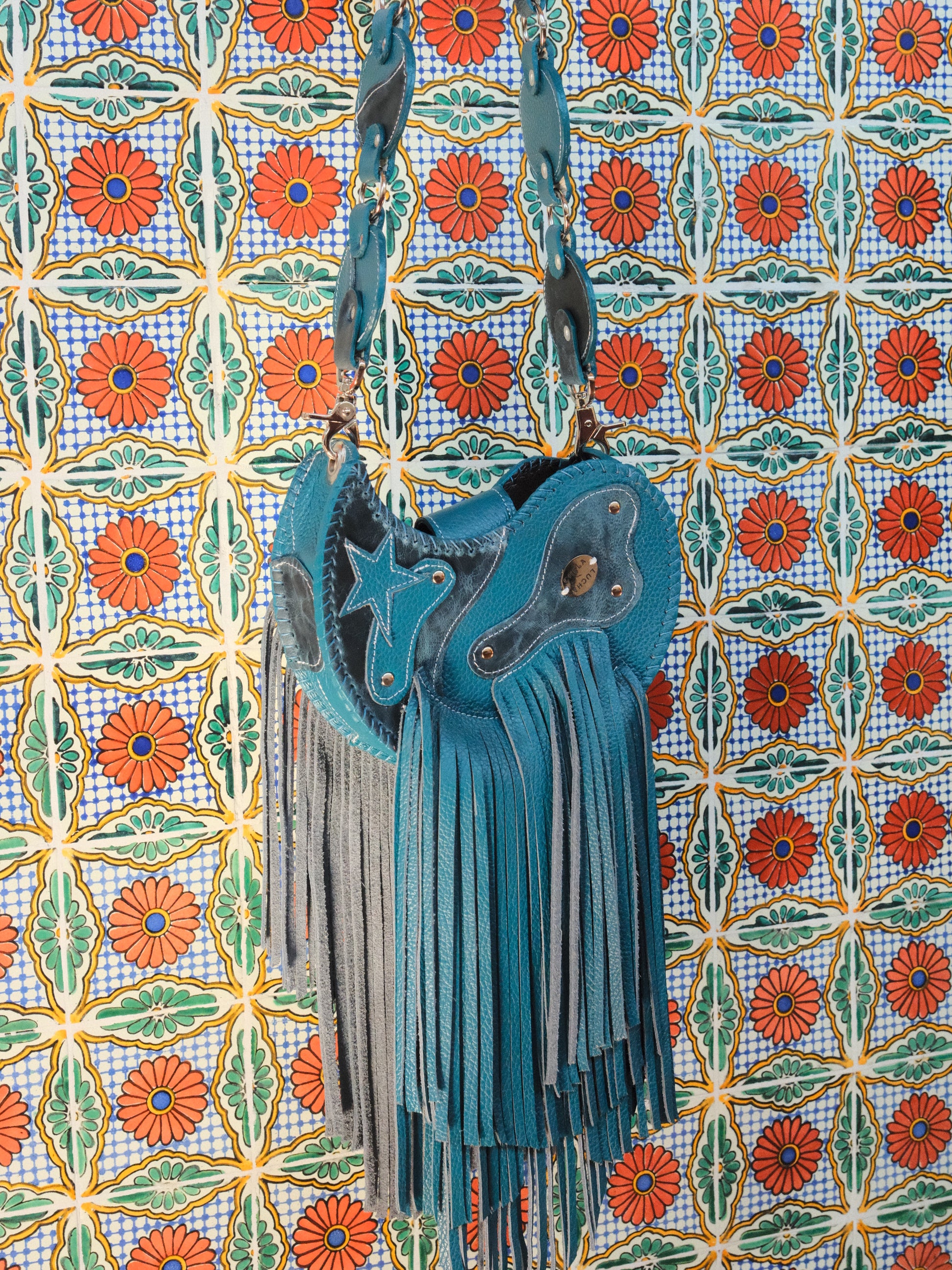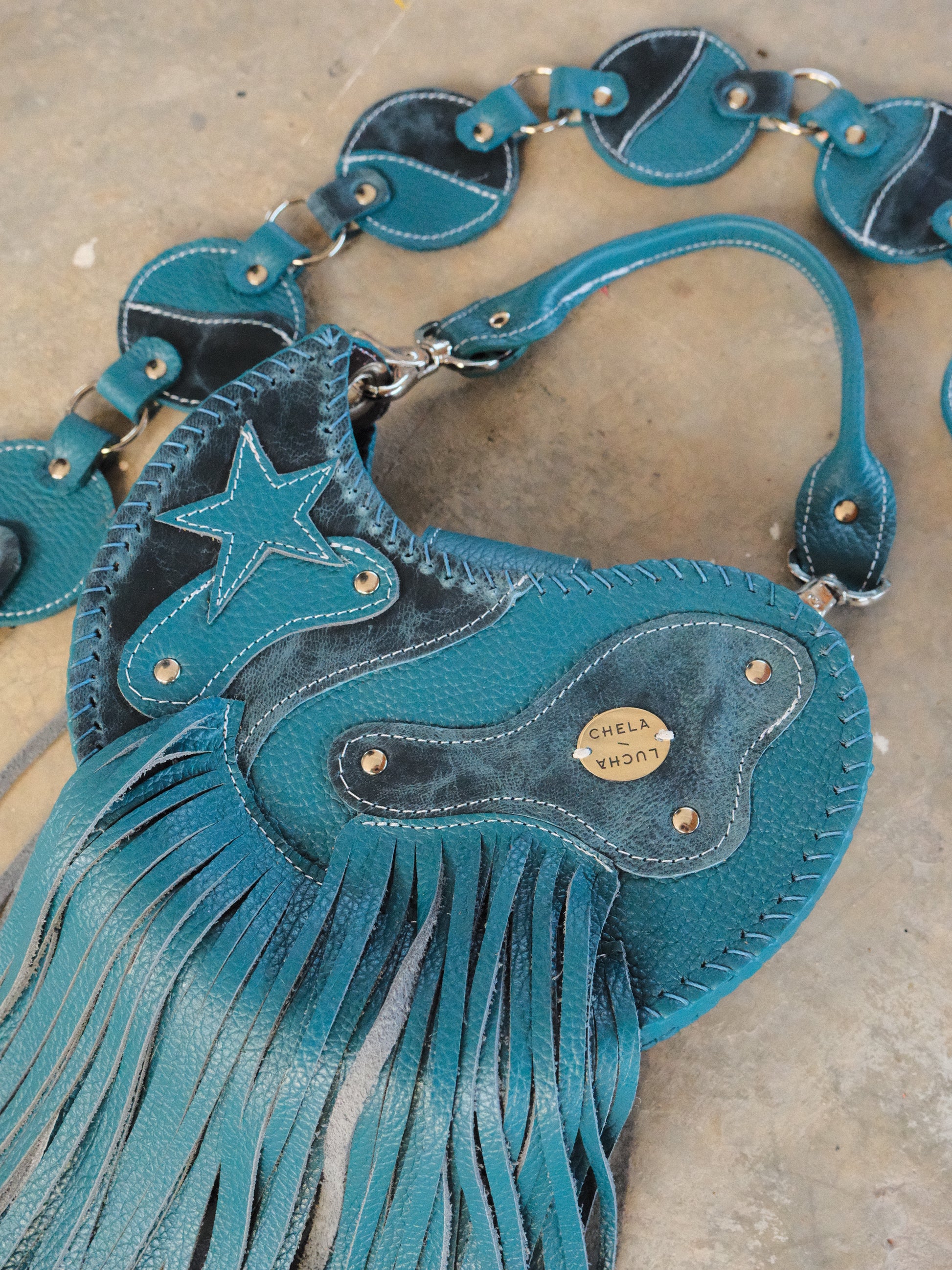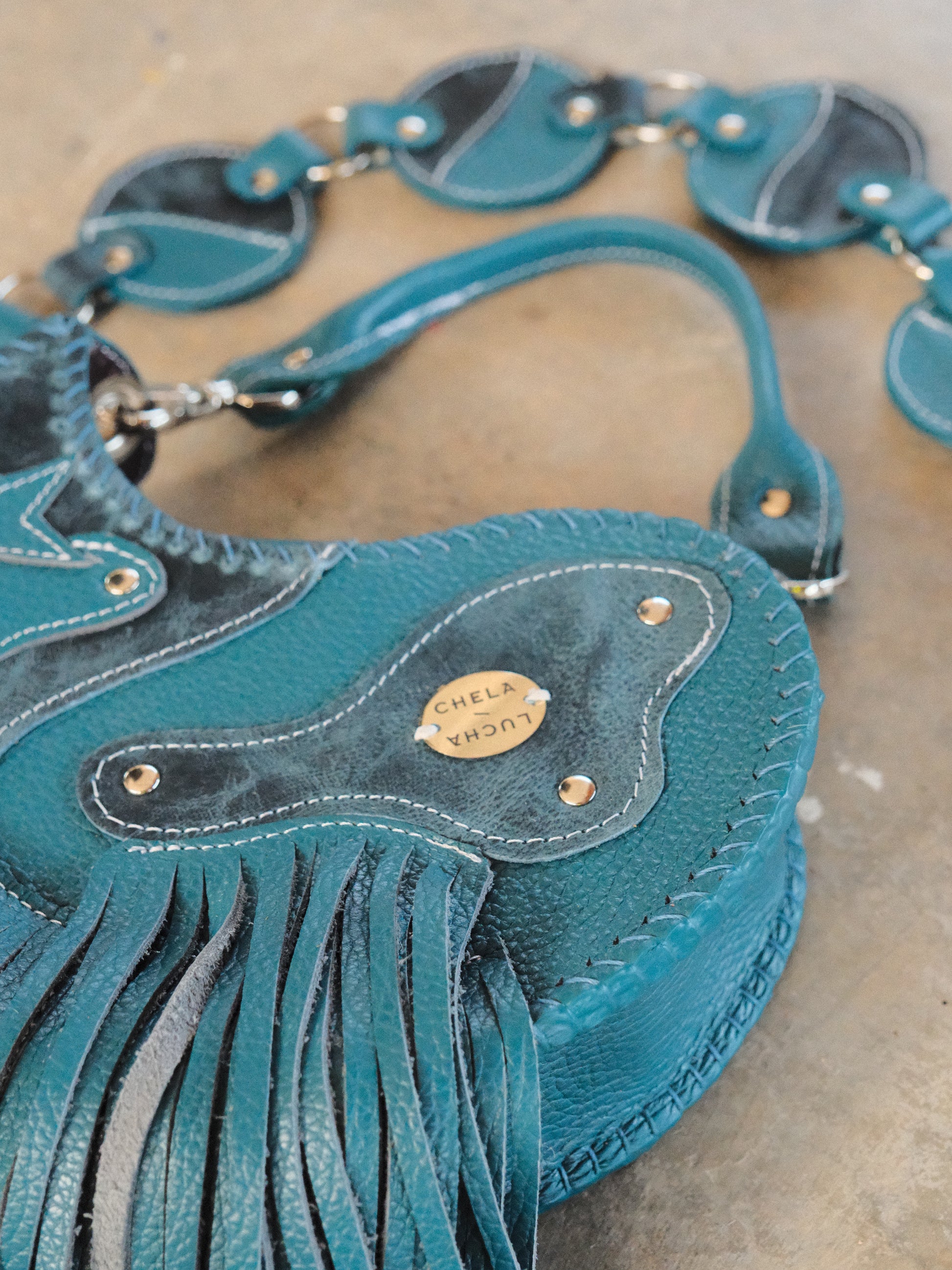 Bolsa TOÑA hecha con pedacera de piel en tonos azules. Detalles de remaches en tono plateado.