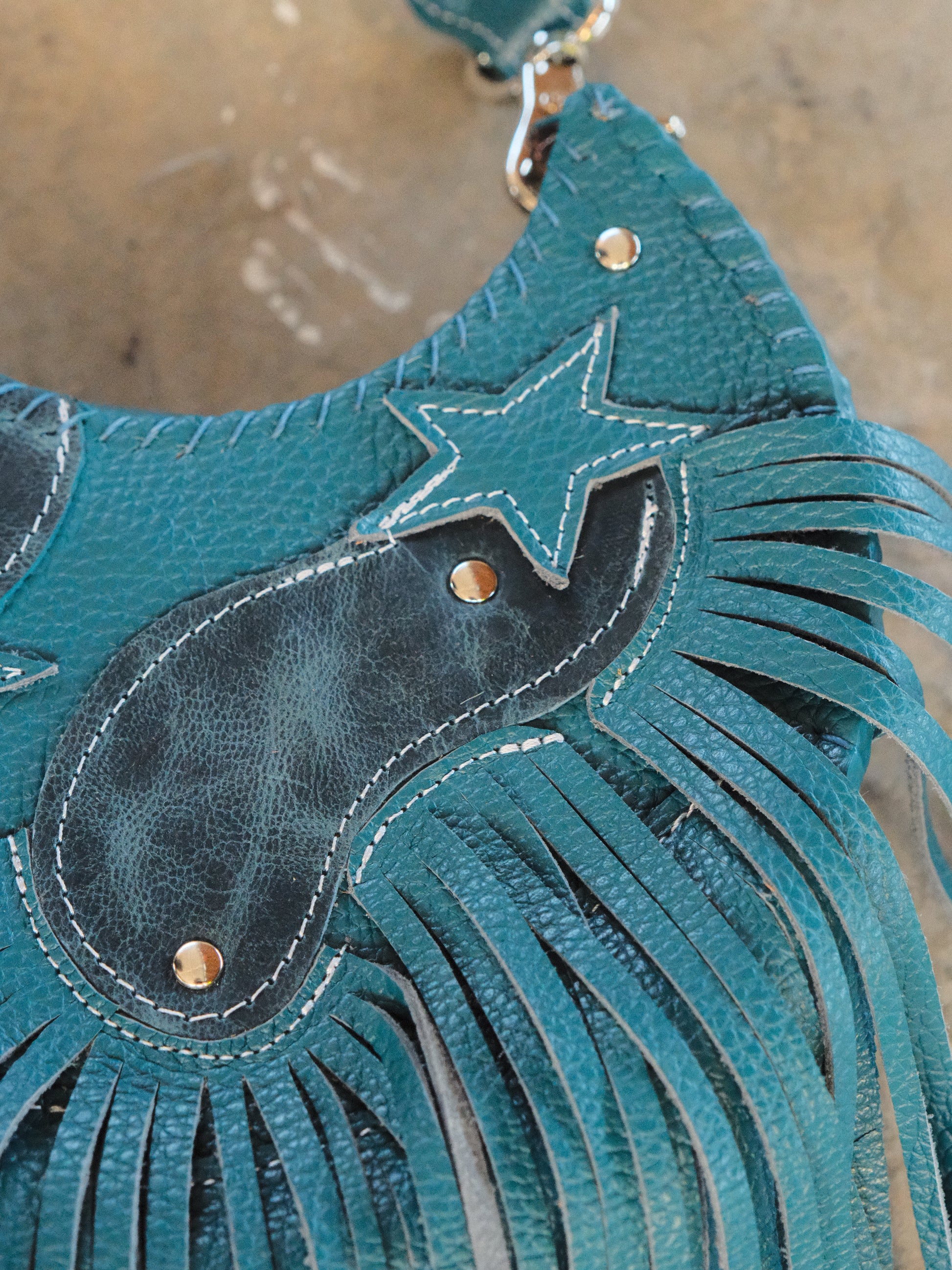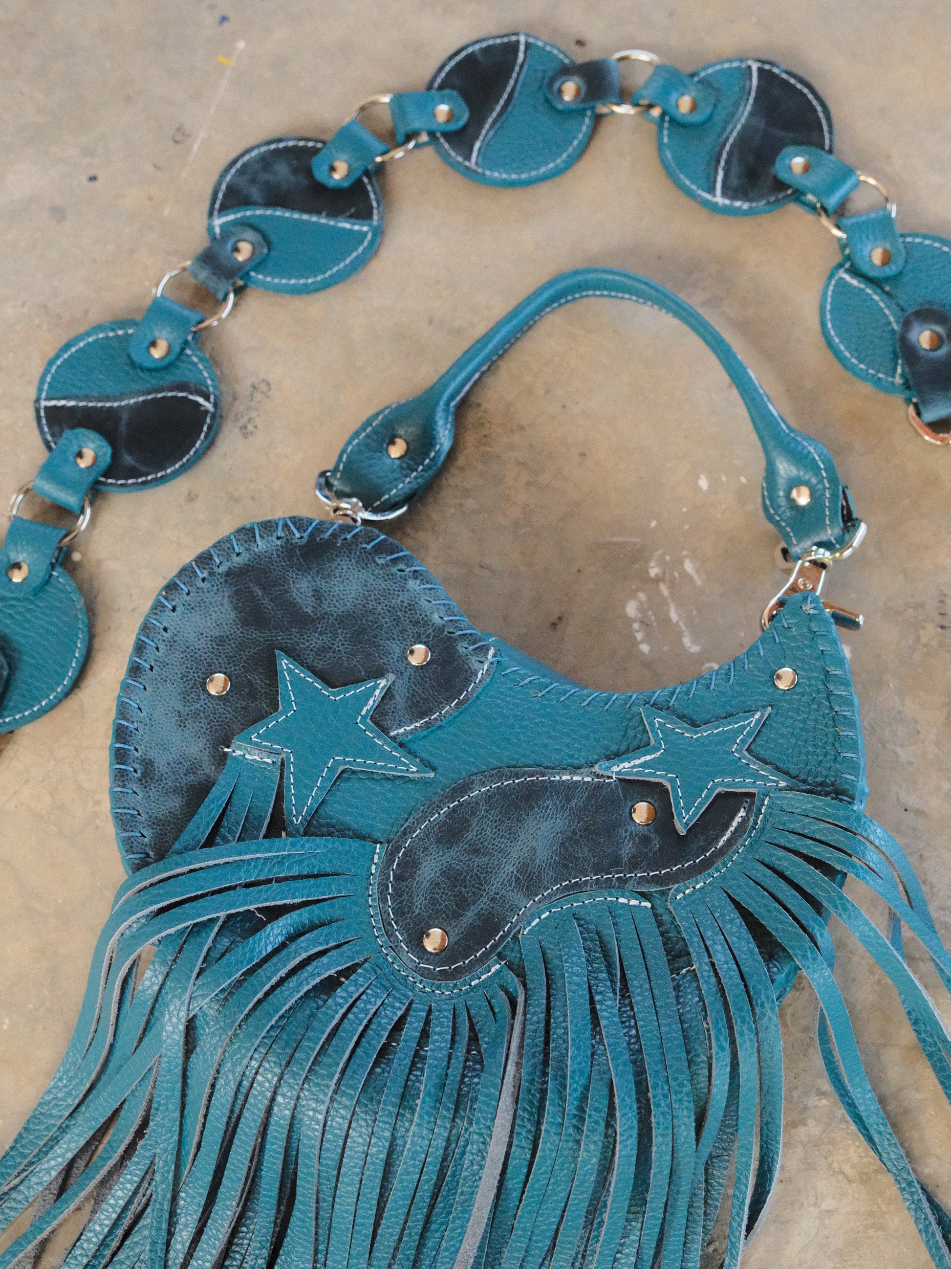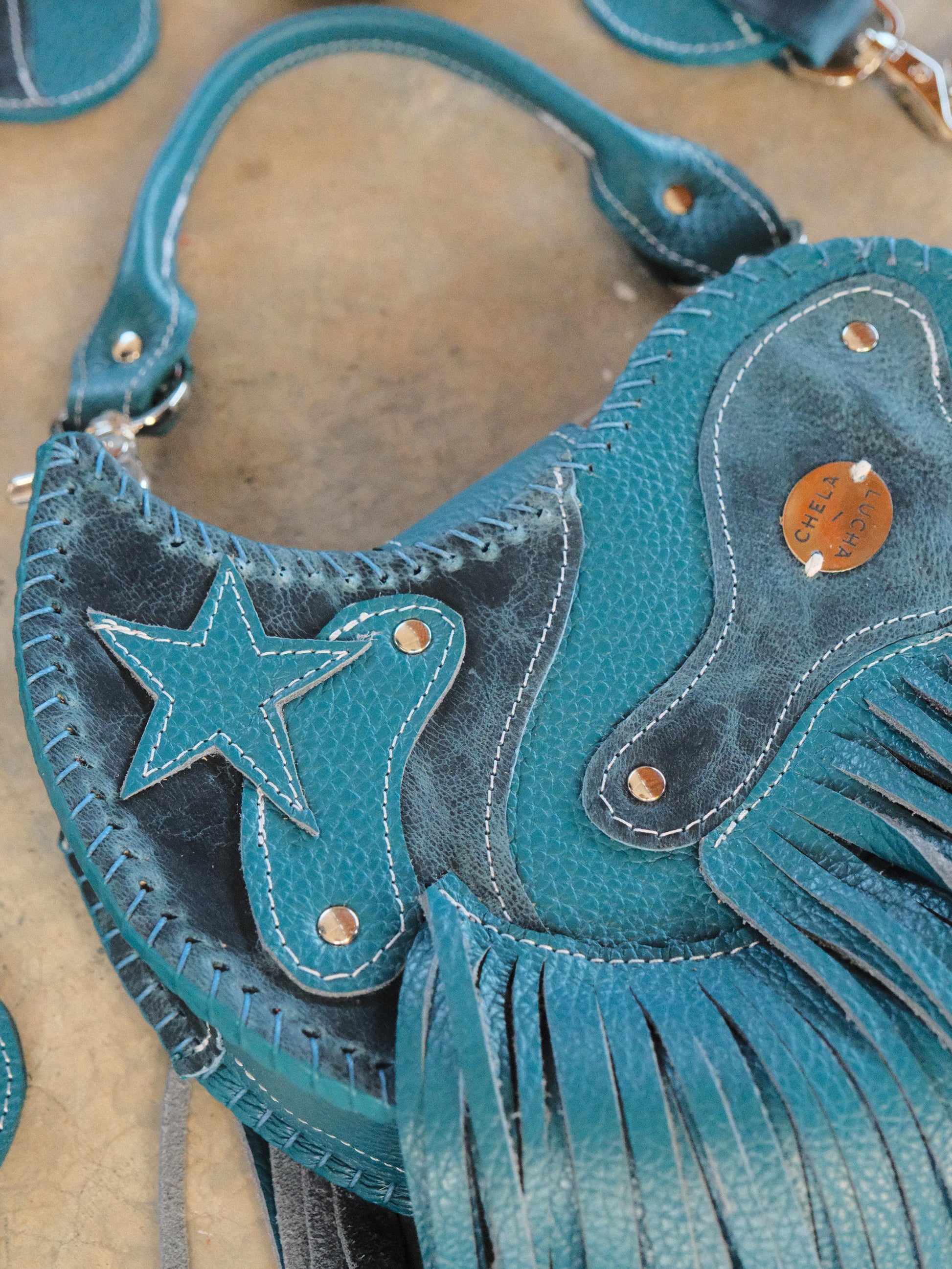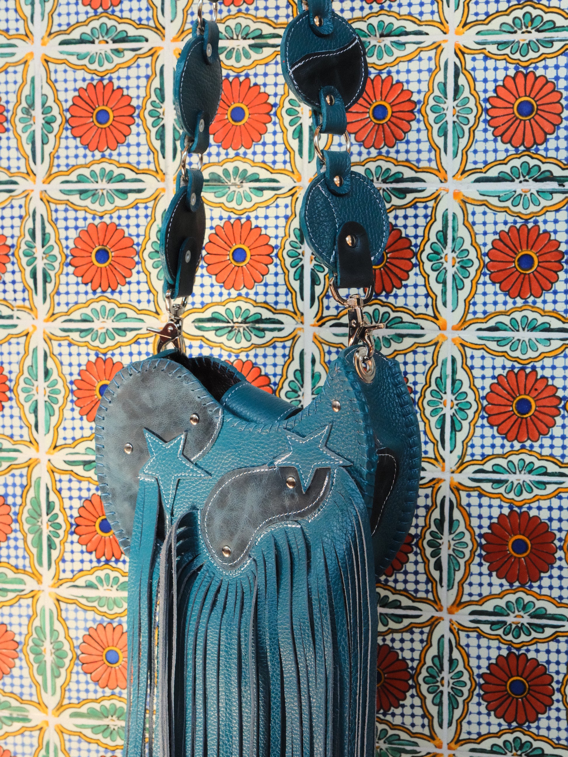 Bolsa TOÑA hecha con pedacera de piel en tonos azules. Detalles de remaches en tono plateado.