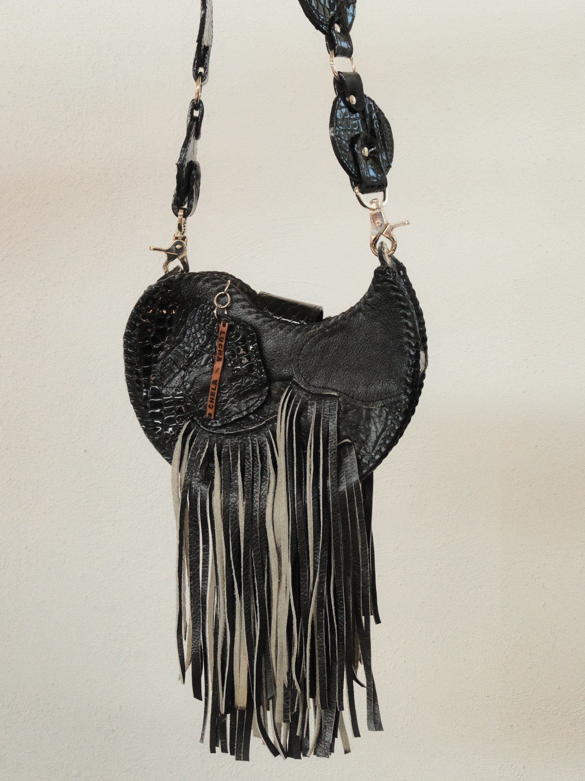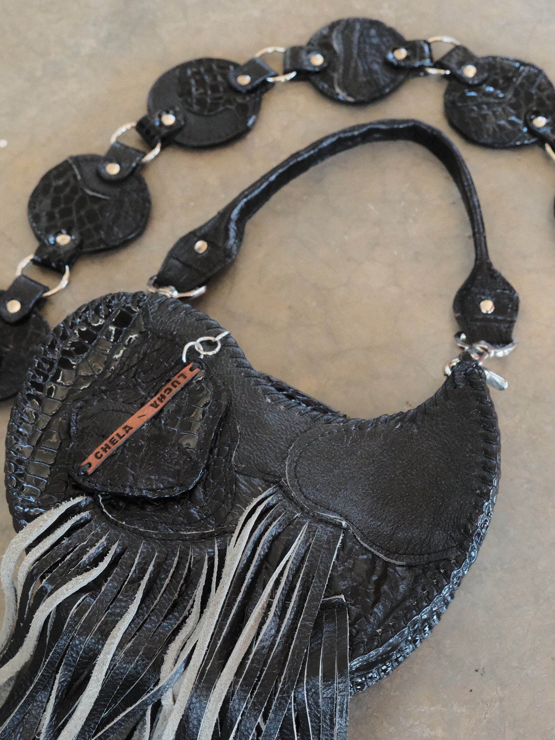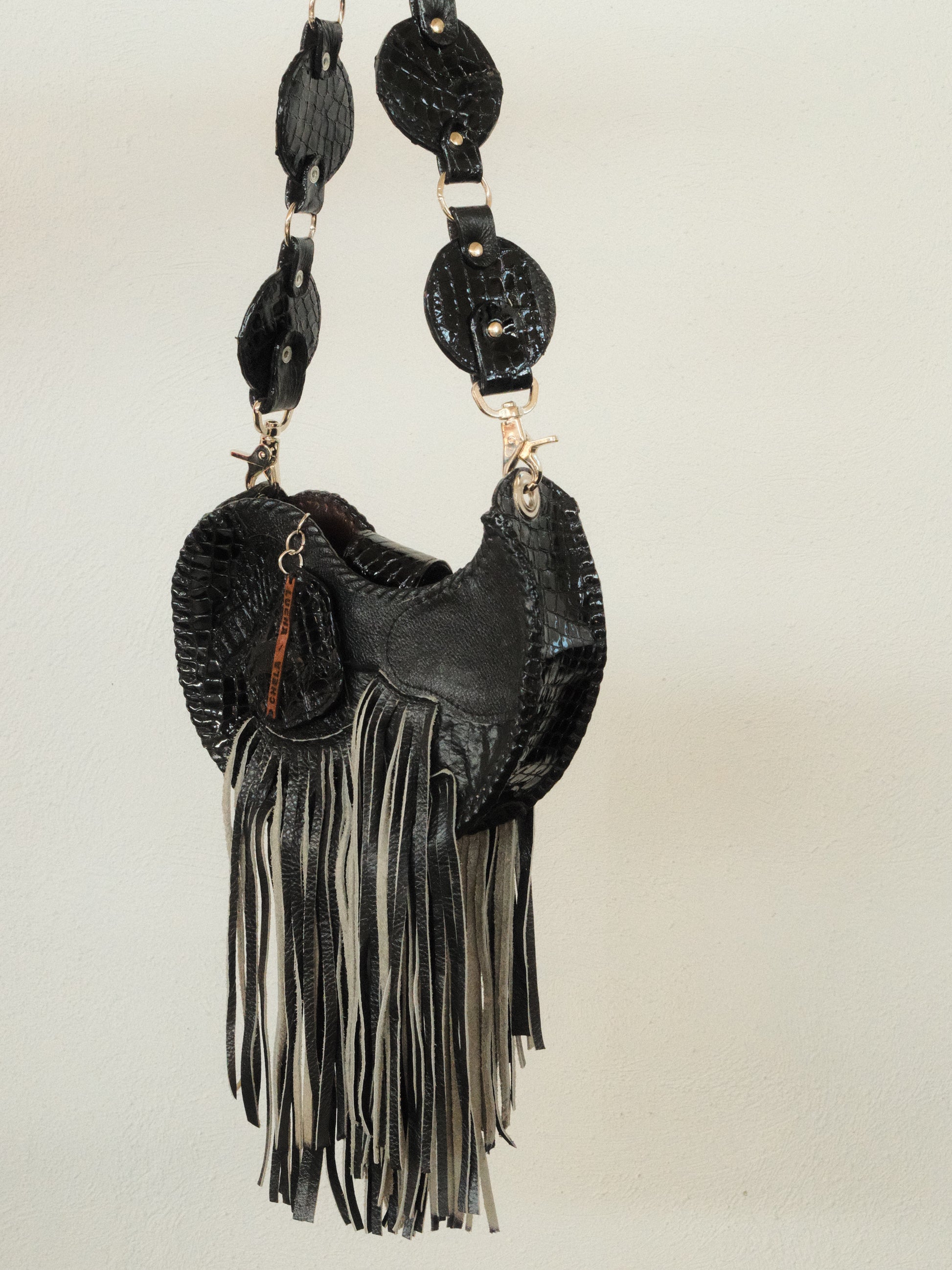 Bolsa TOÑA hecha con pedacera de piel en tonos negro.