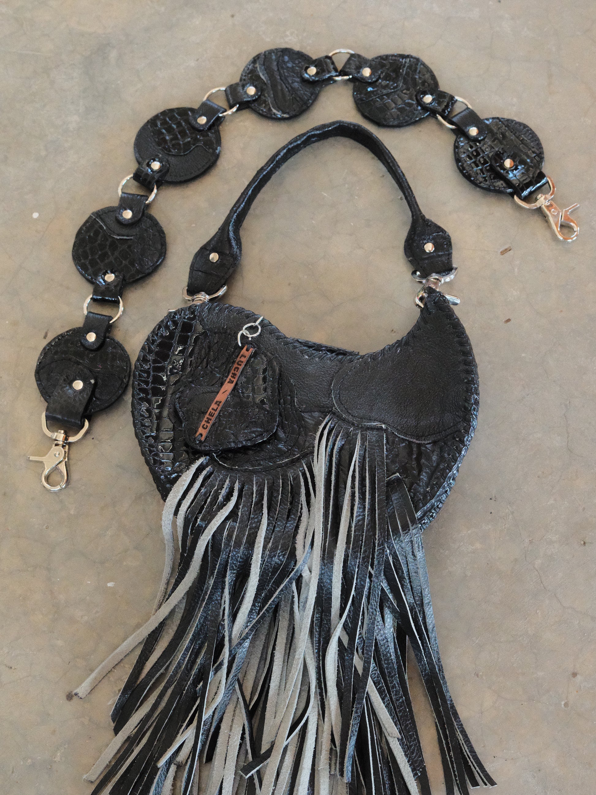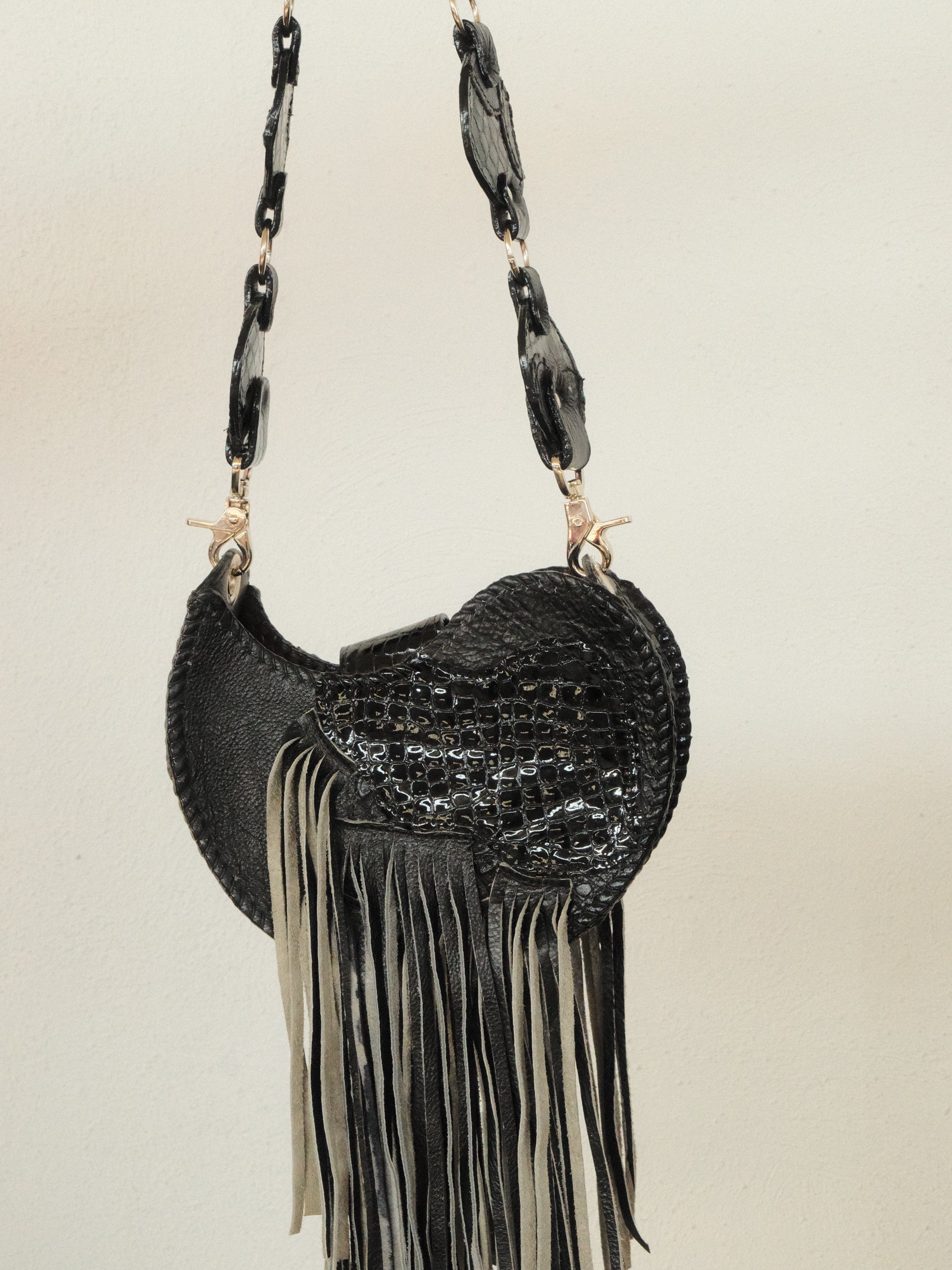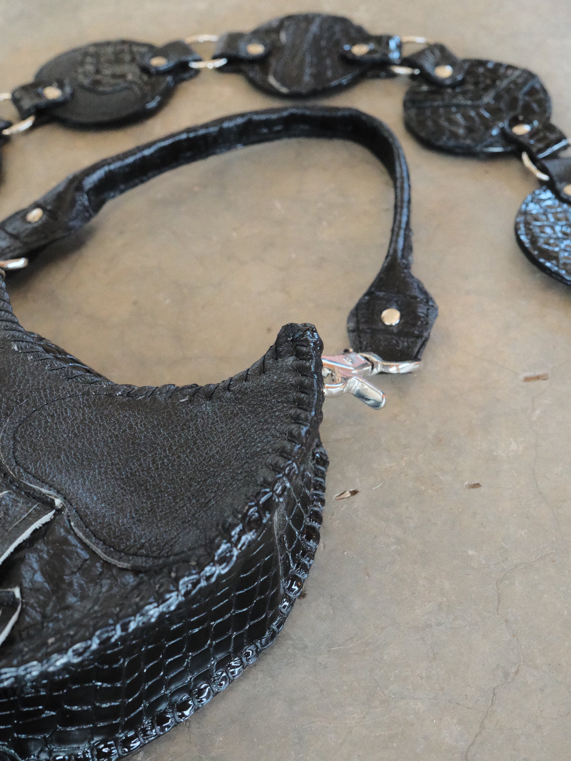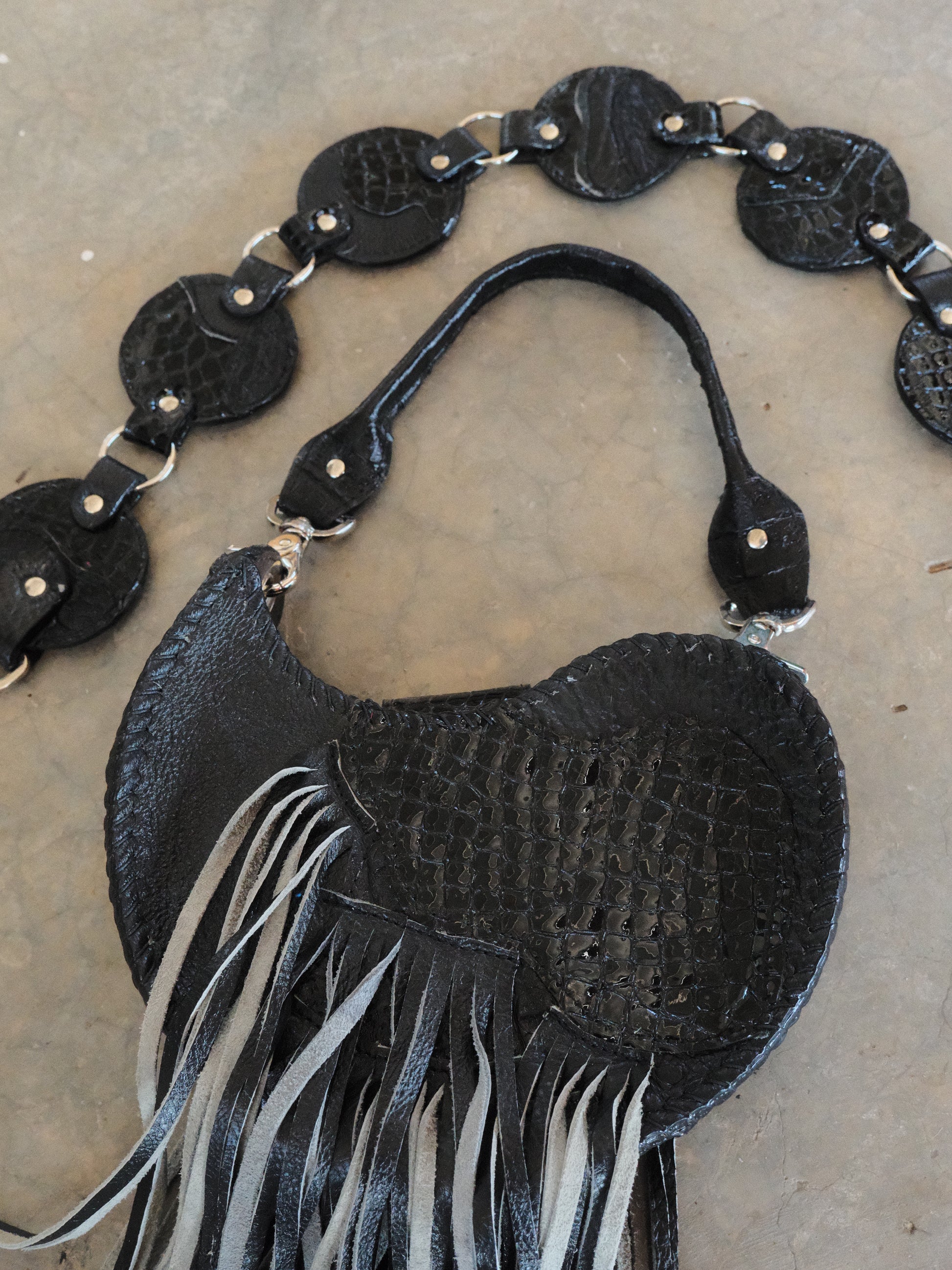 Bolsa TOÑA hecha con pedacera de piel en tonos negro.