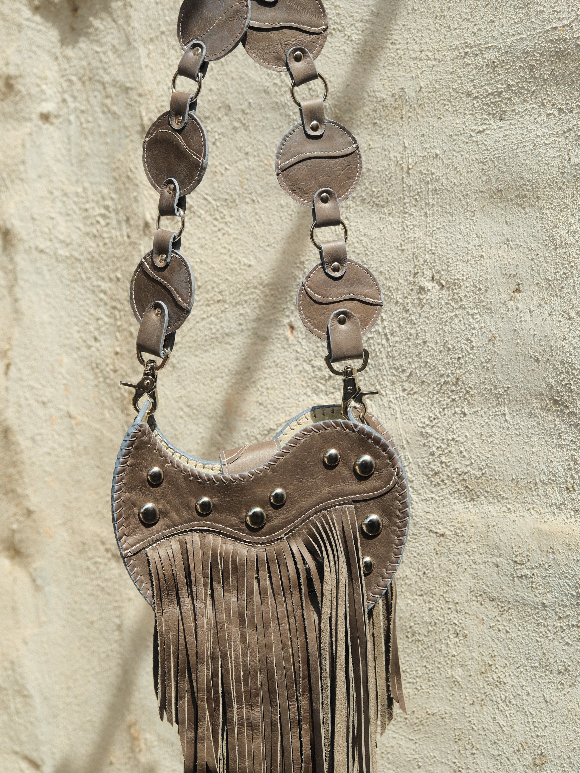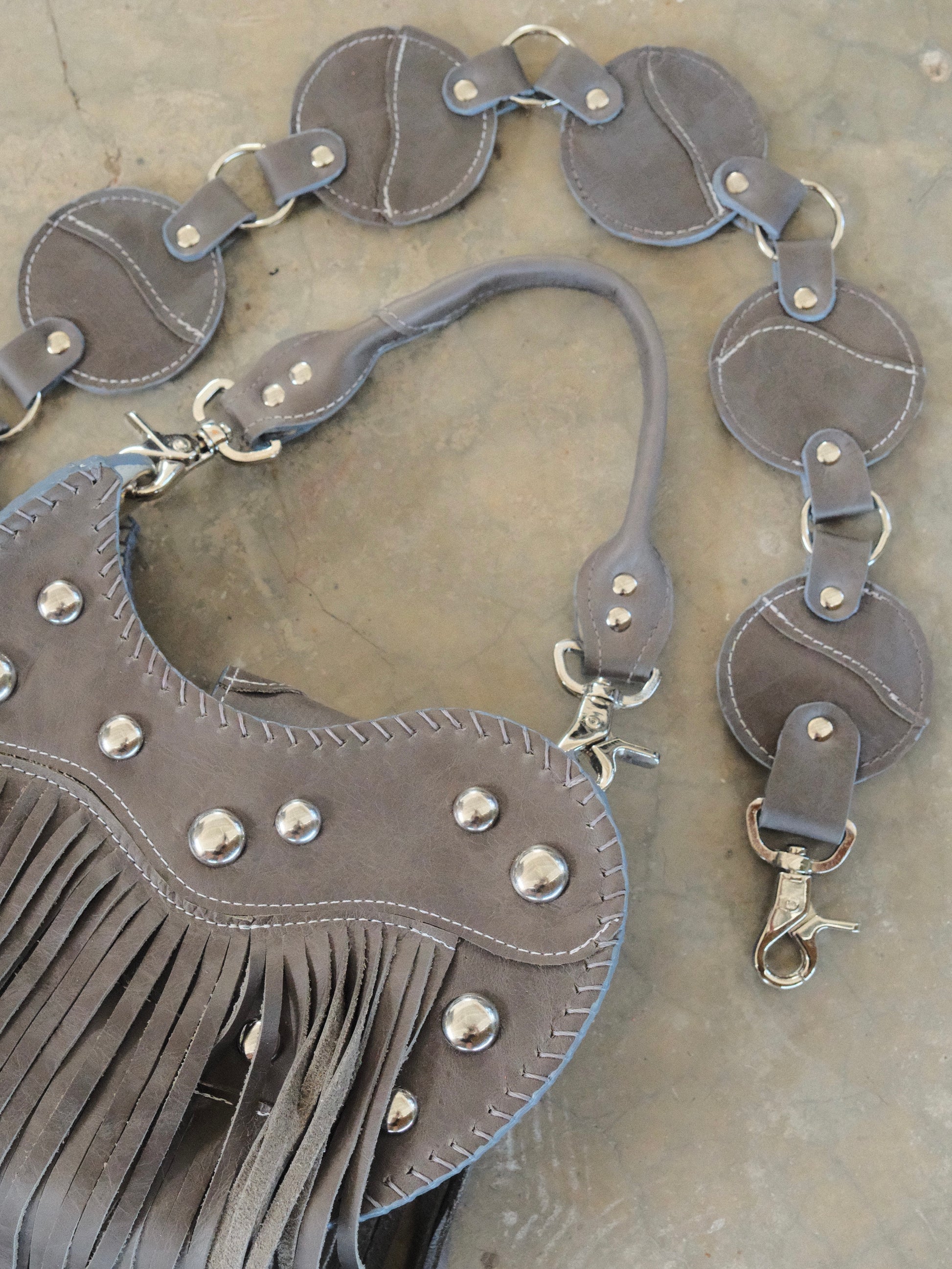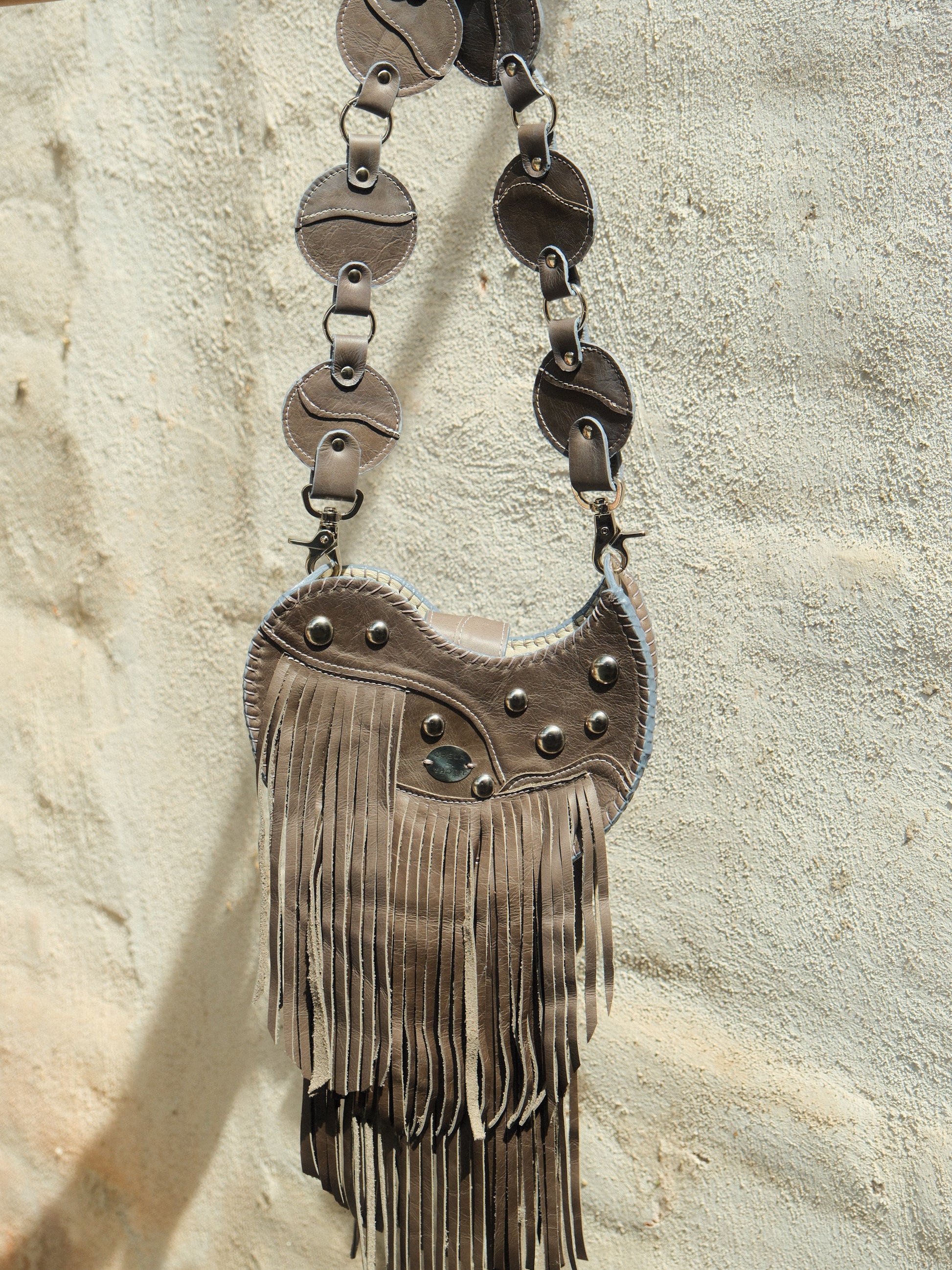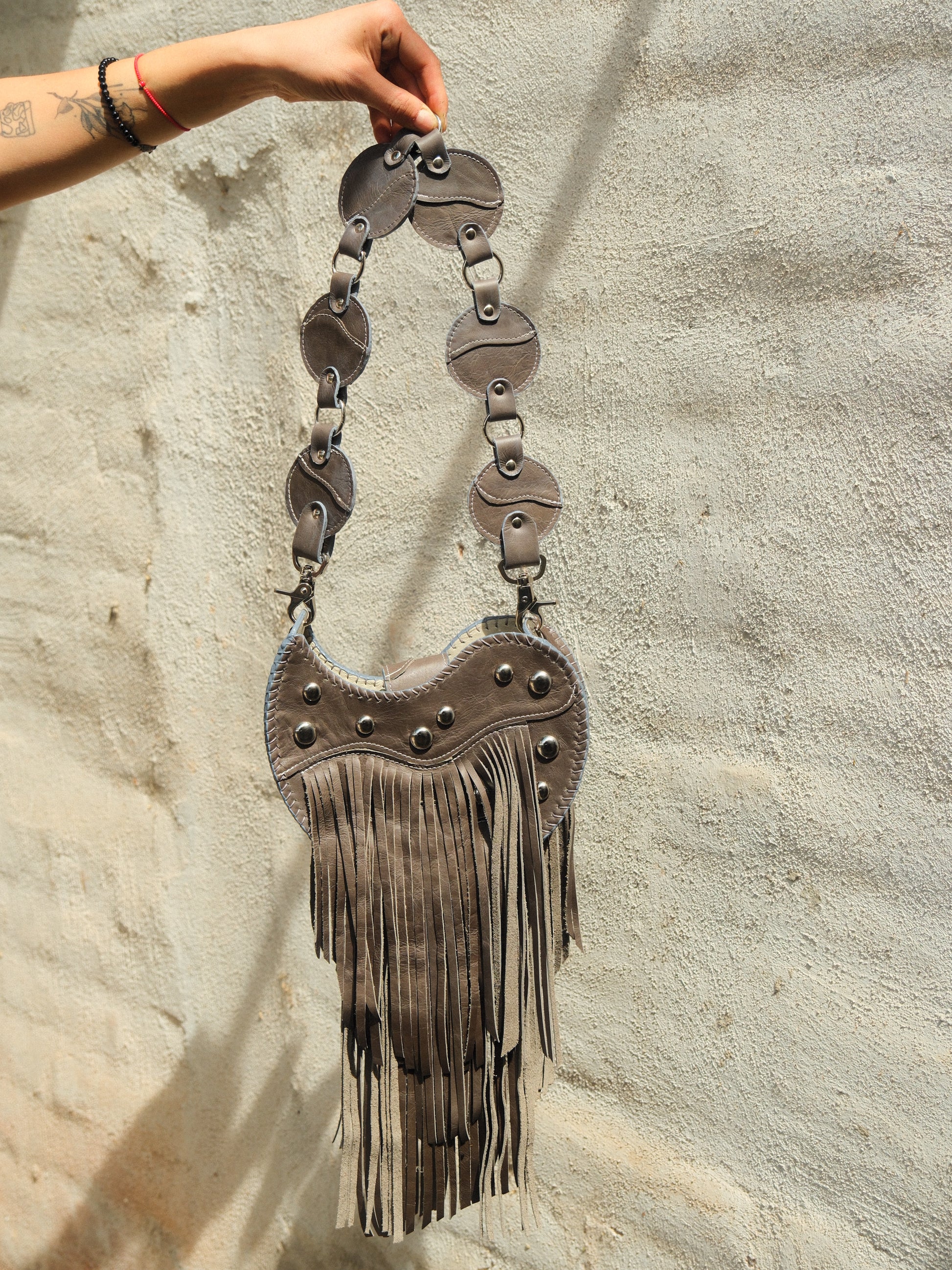 Bolsa TOÑA hecha con pedacera de piel en tono gris. Detalles de estoperoles en tono plateado.