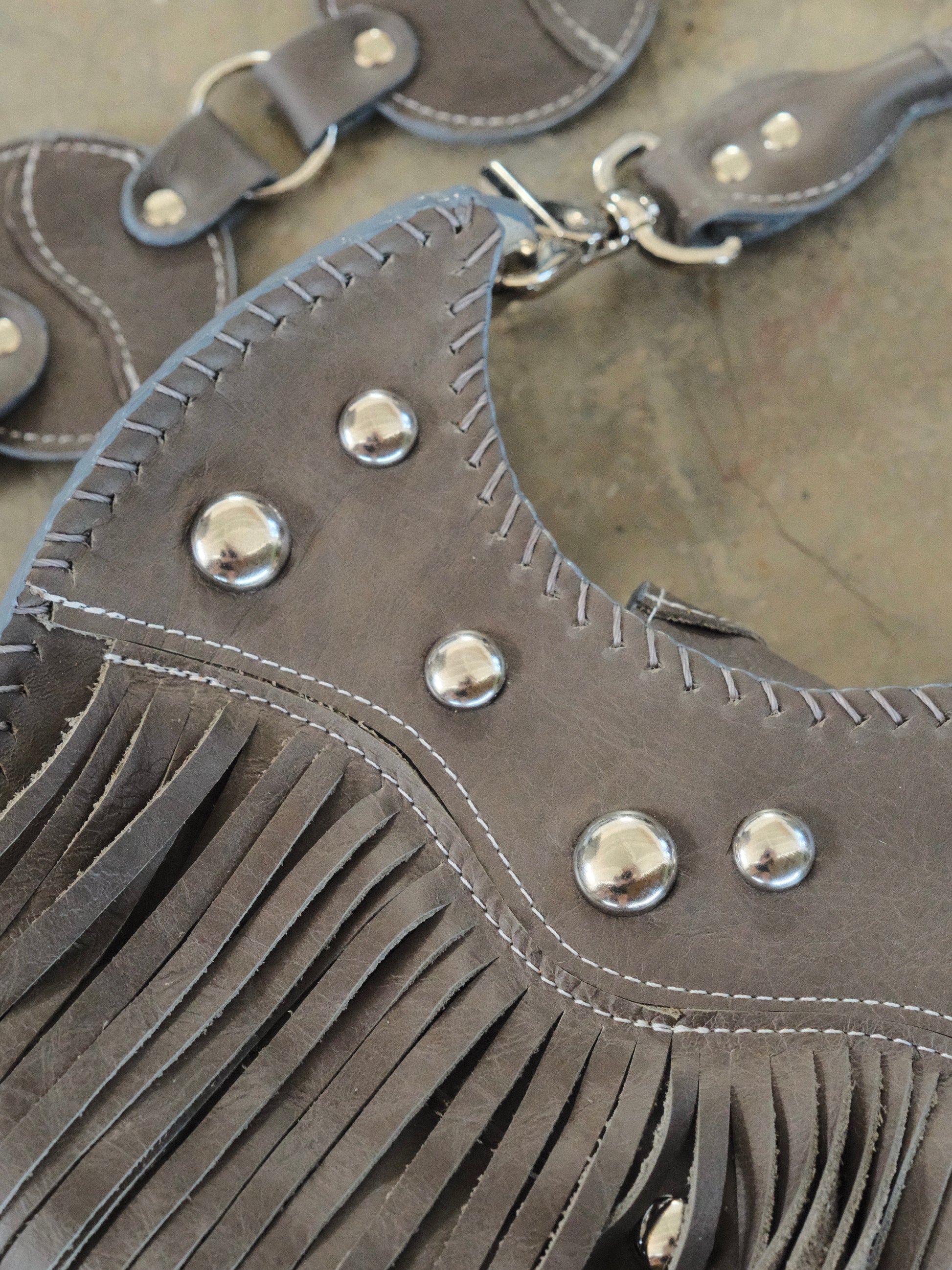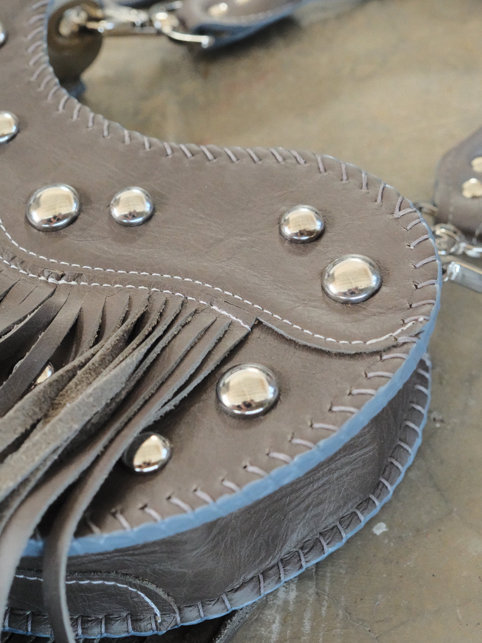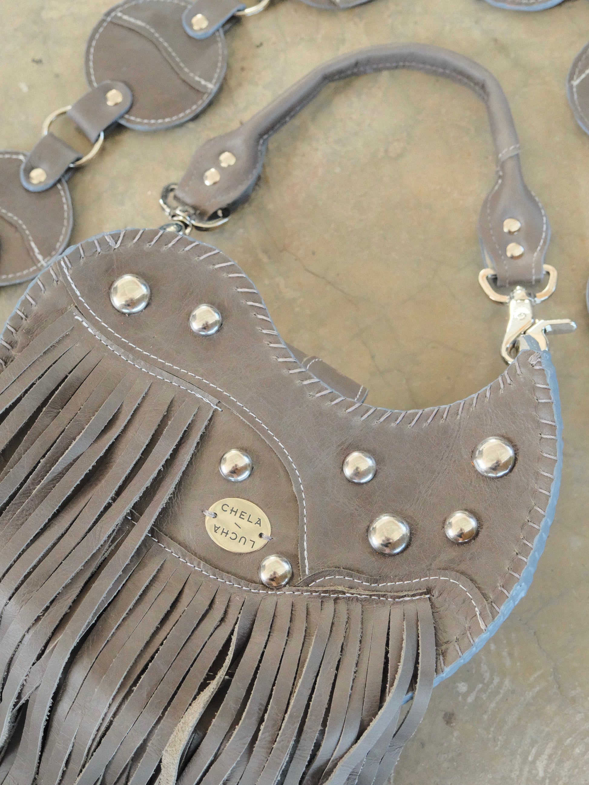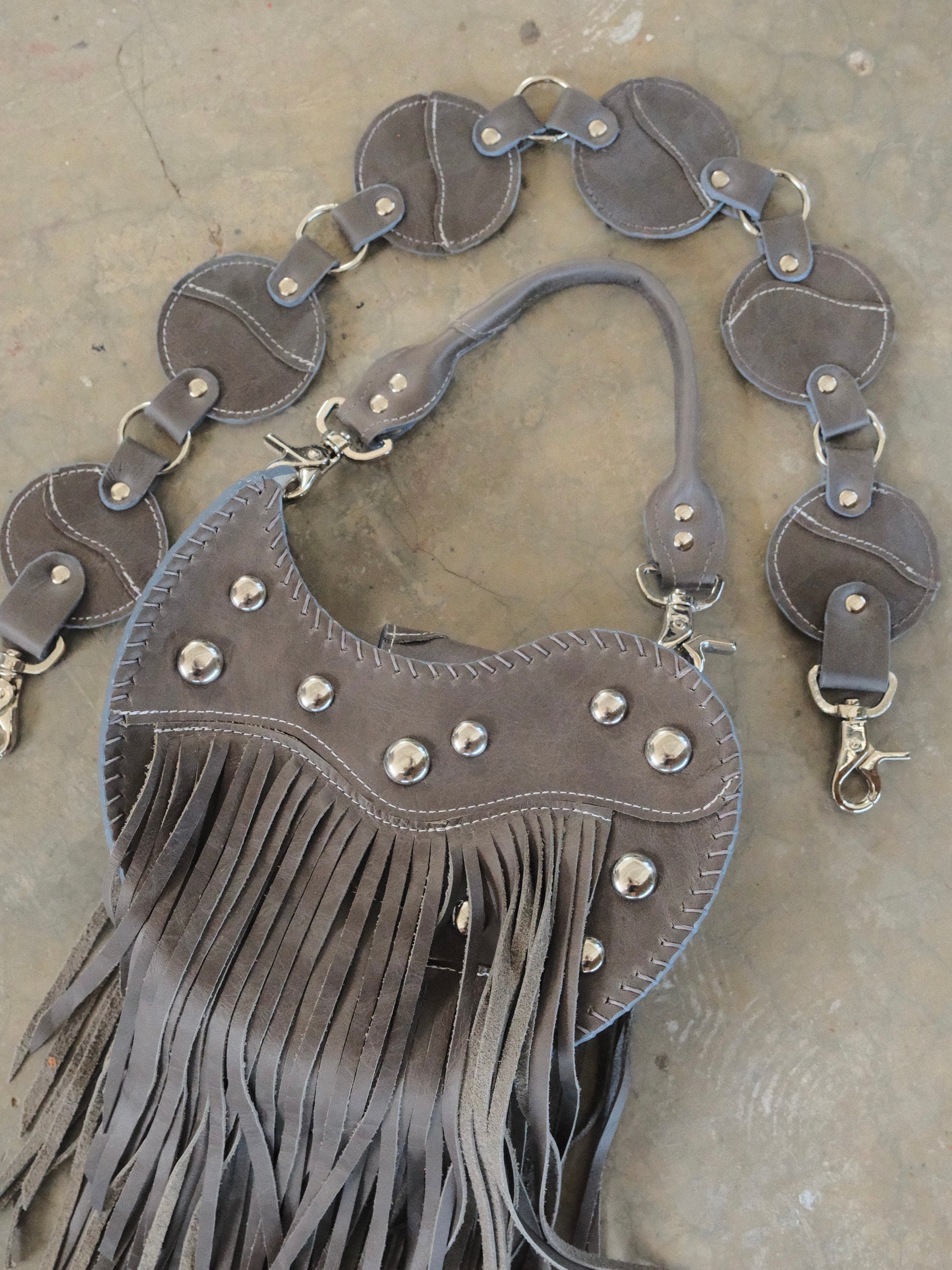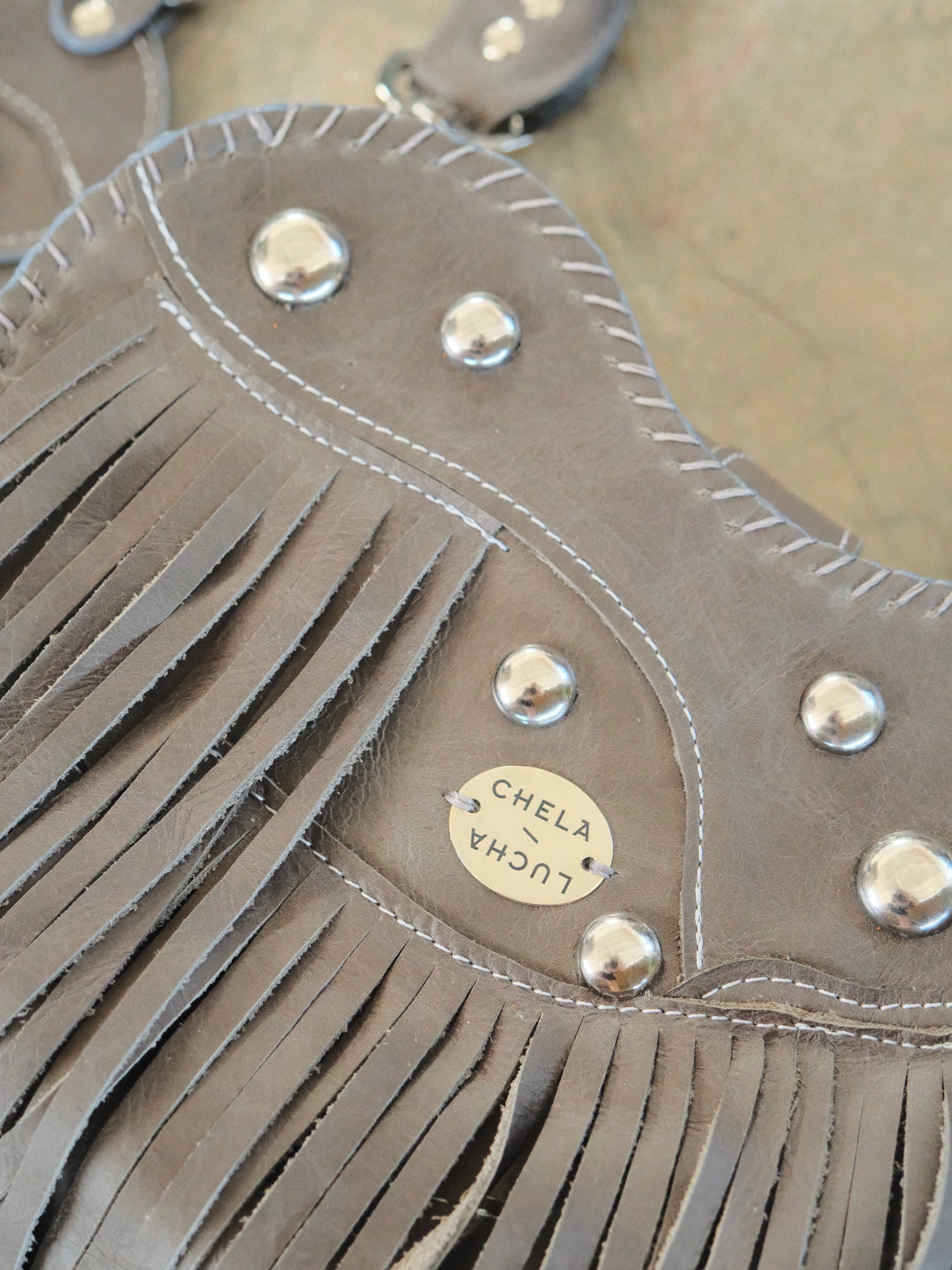 Bolsa TOÑA hecha con pedacera de piel en tono gris. Detalles de estoperoles en tono plateado.