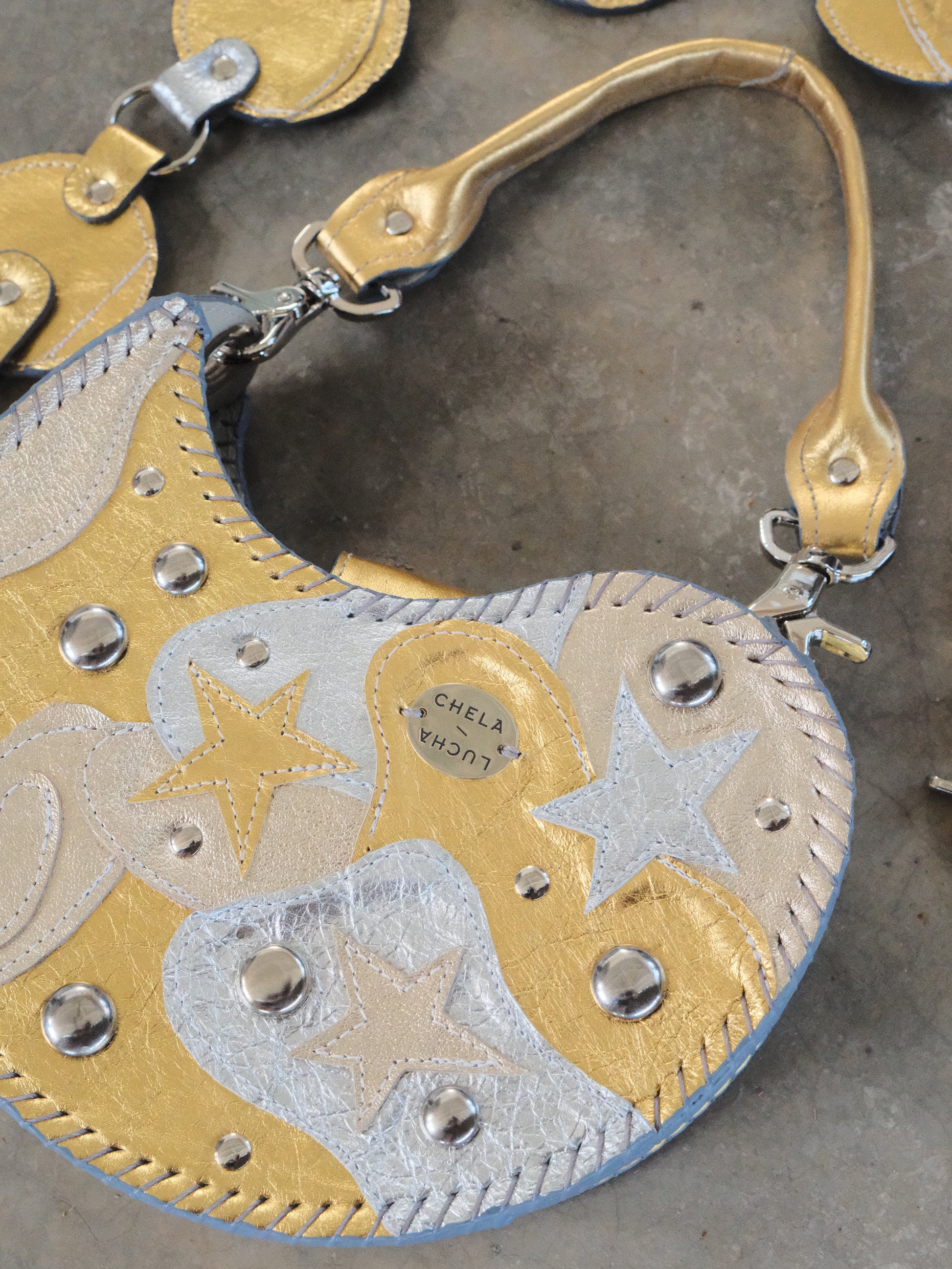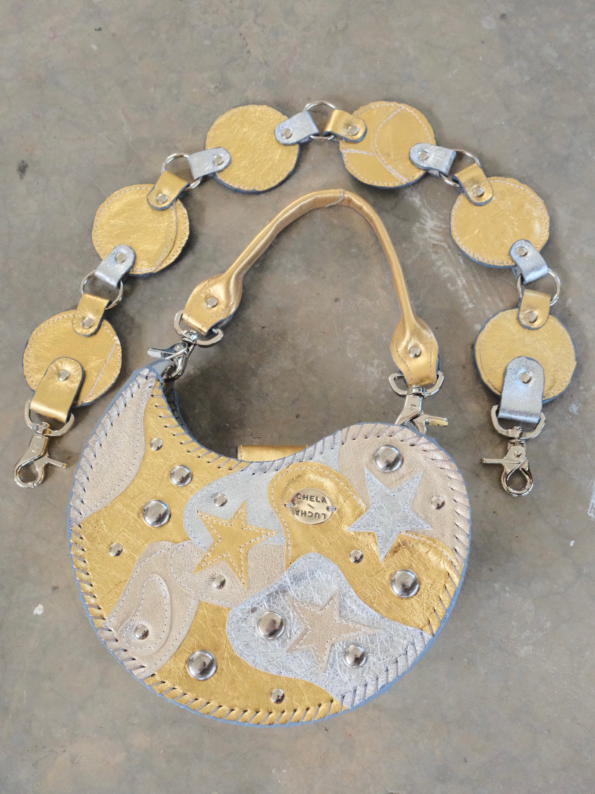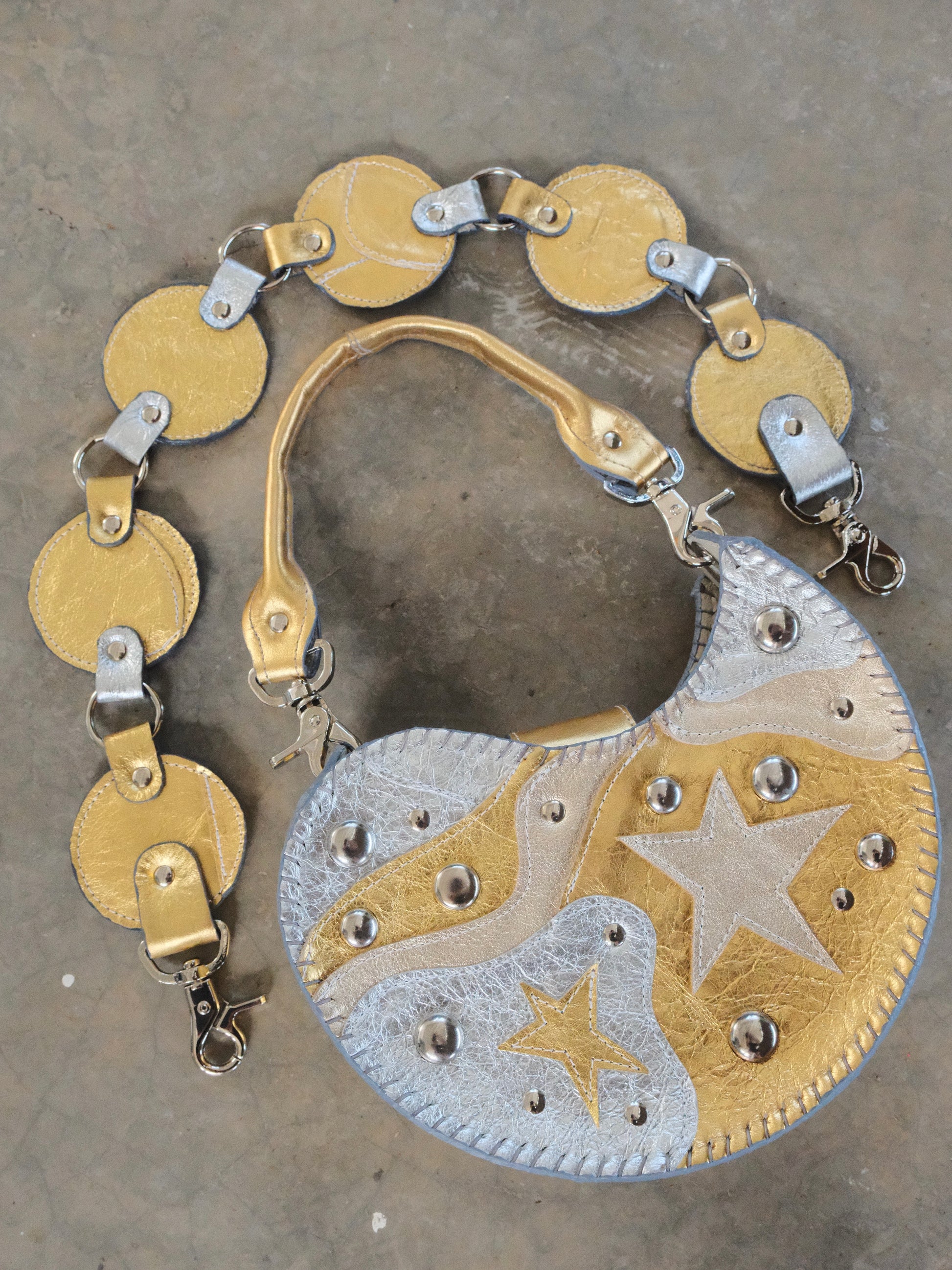 Bolsa TOÑA hecha con pedacera de piel en tonos plateado y dorado. Detalles de estoperoles en tono plateado.