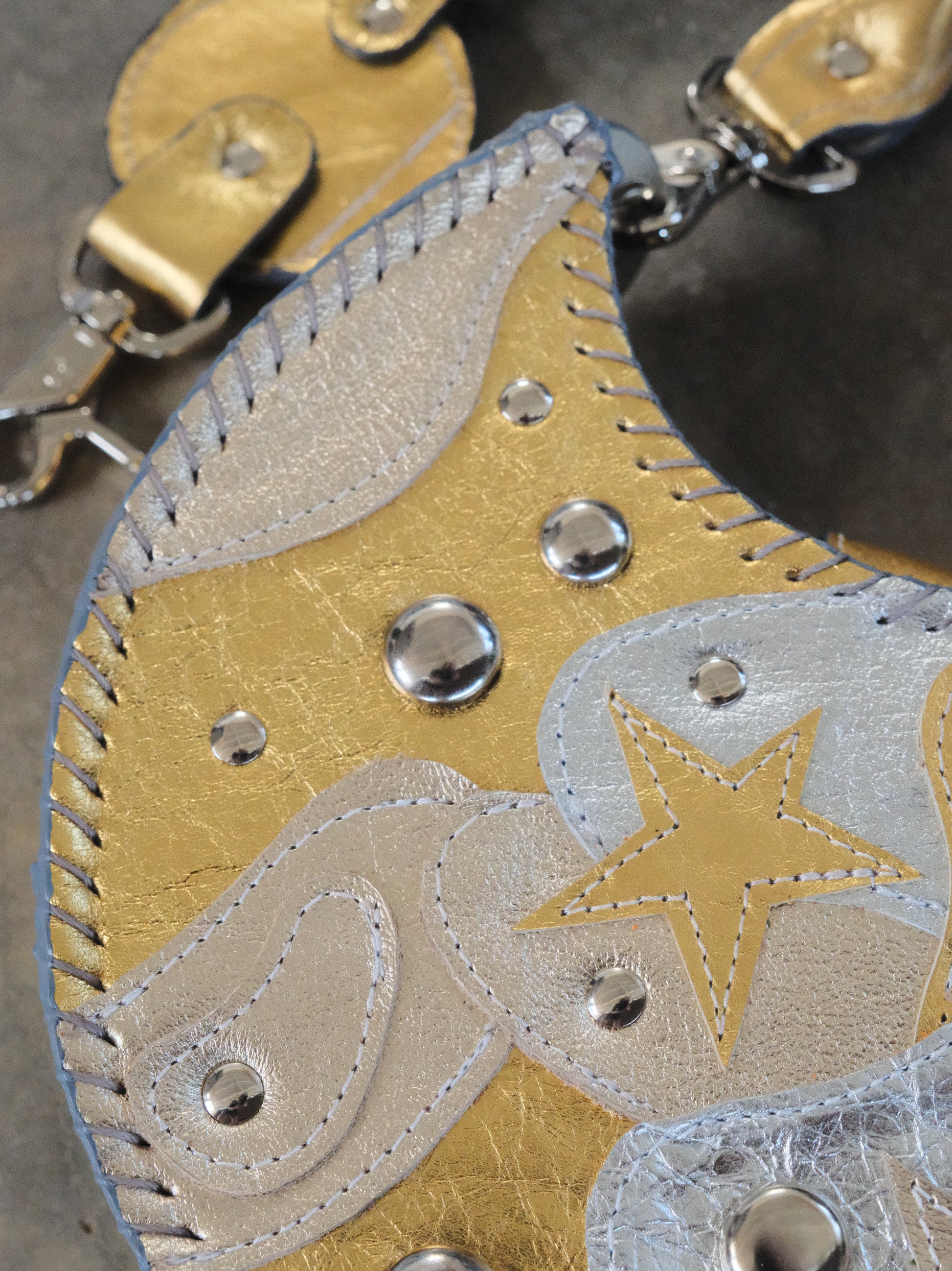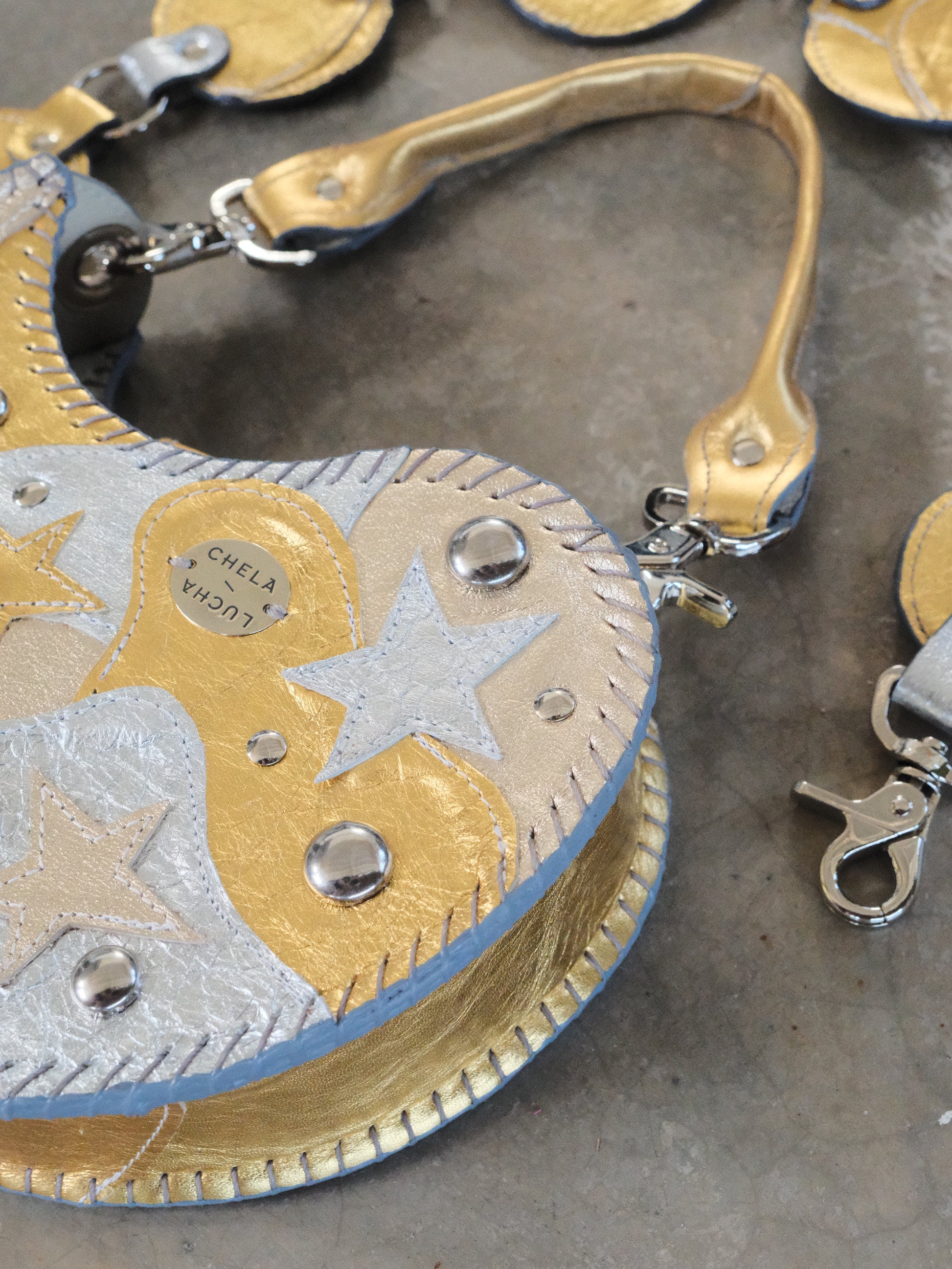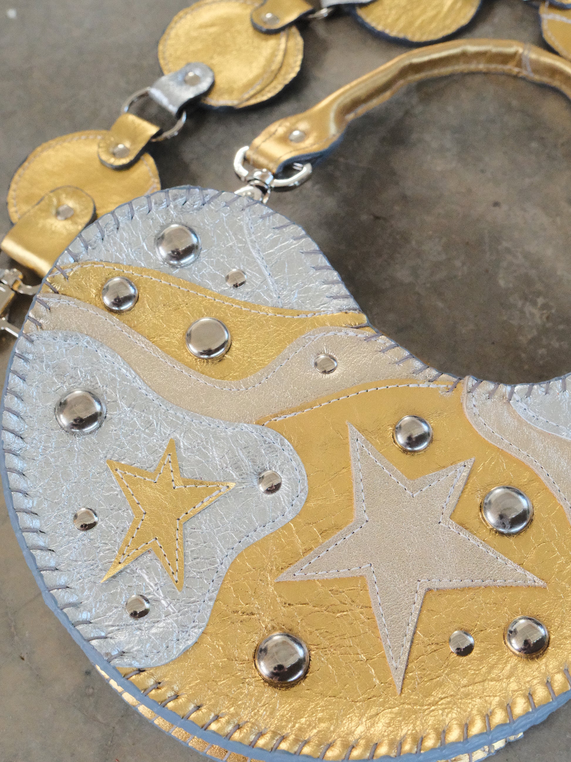 Bolsa TOÑA hecha con pedacera de piel en tonos plateado y dorado. Detalles de estoperoles en tono plateado.