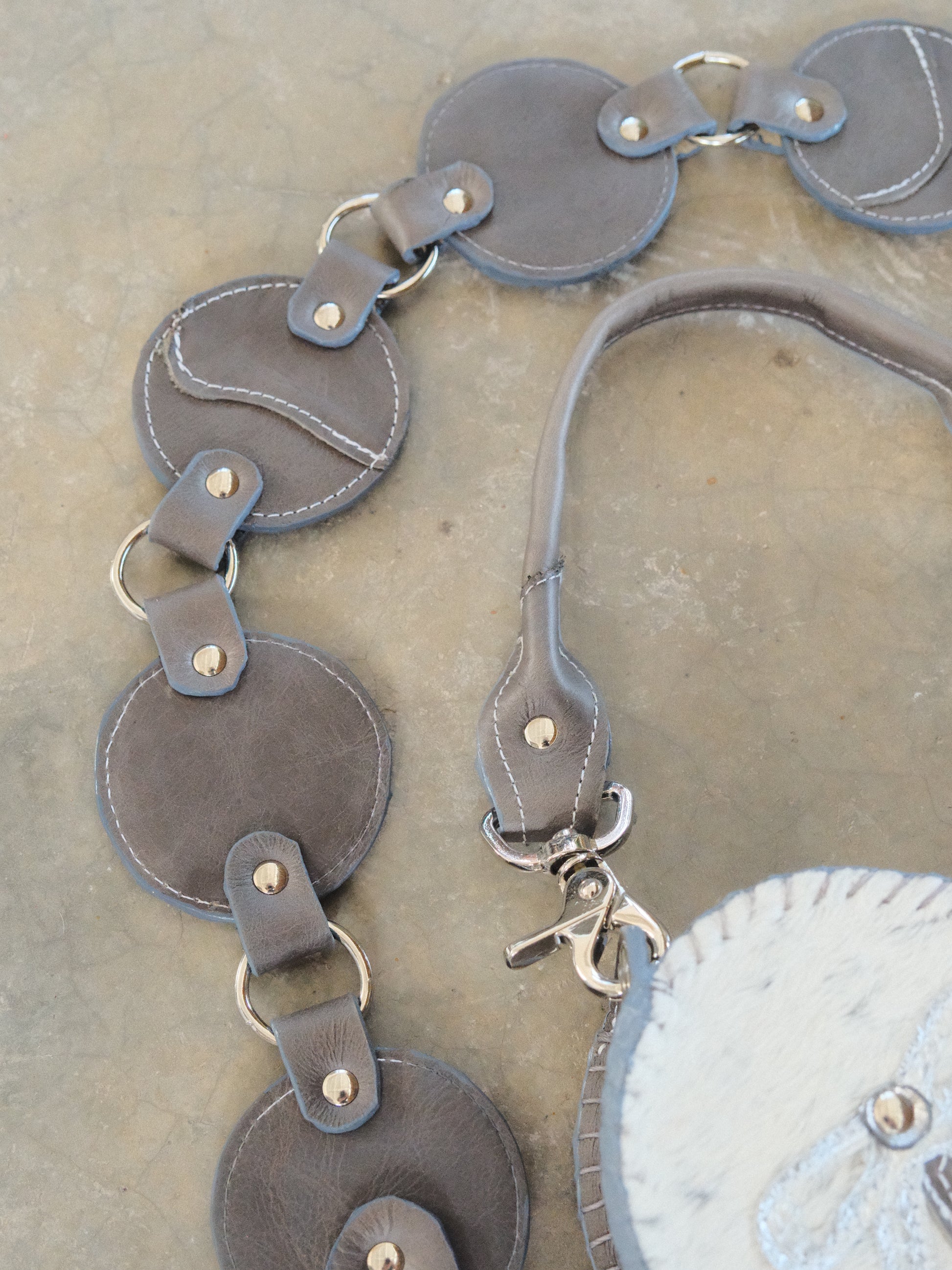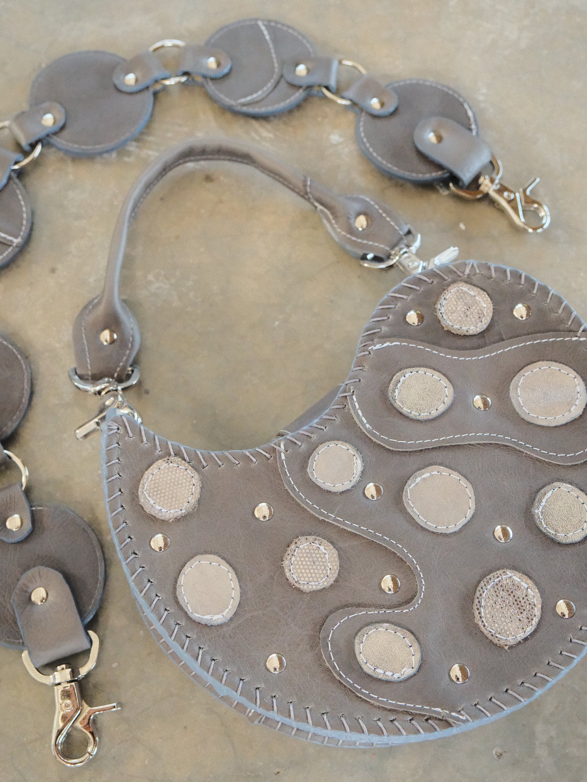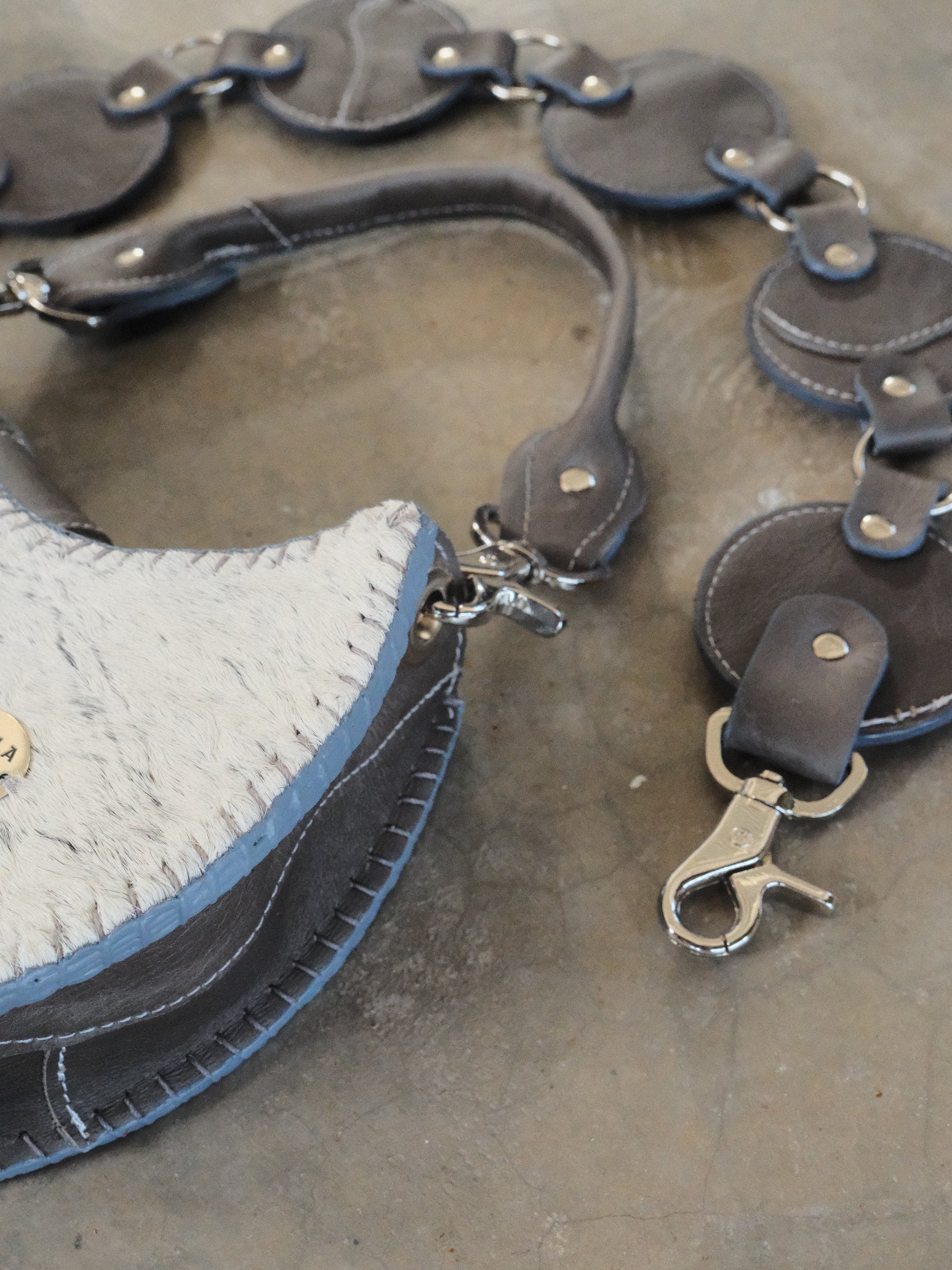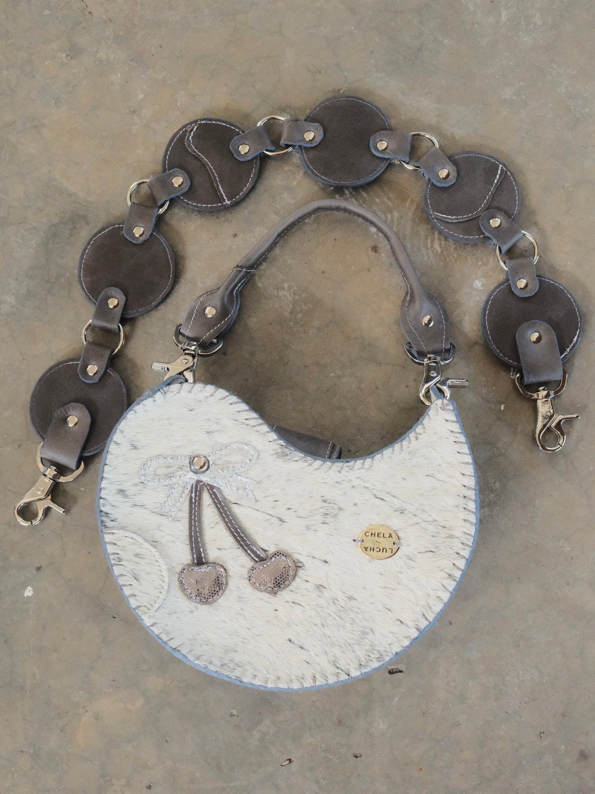 Bolsa TOÑA hecha con pedacera de piel en tonos gris, plateado y textura de pelito. Detalles de remaches en tono plateado.