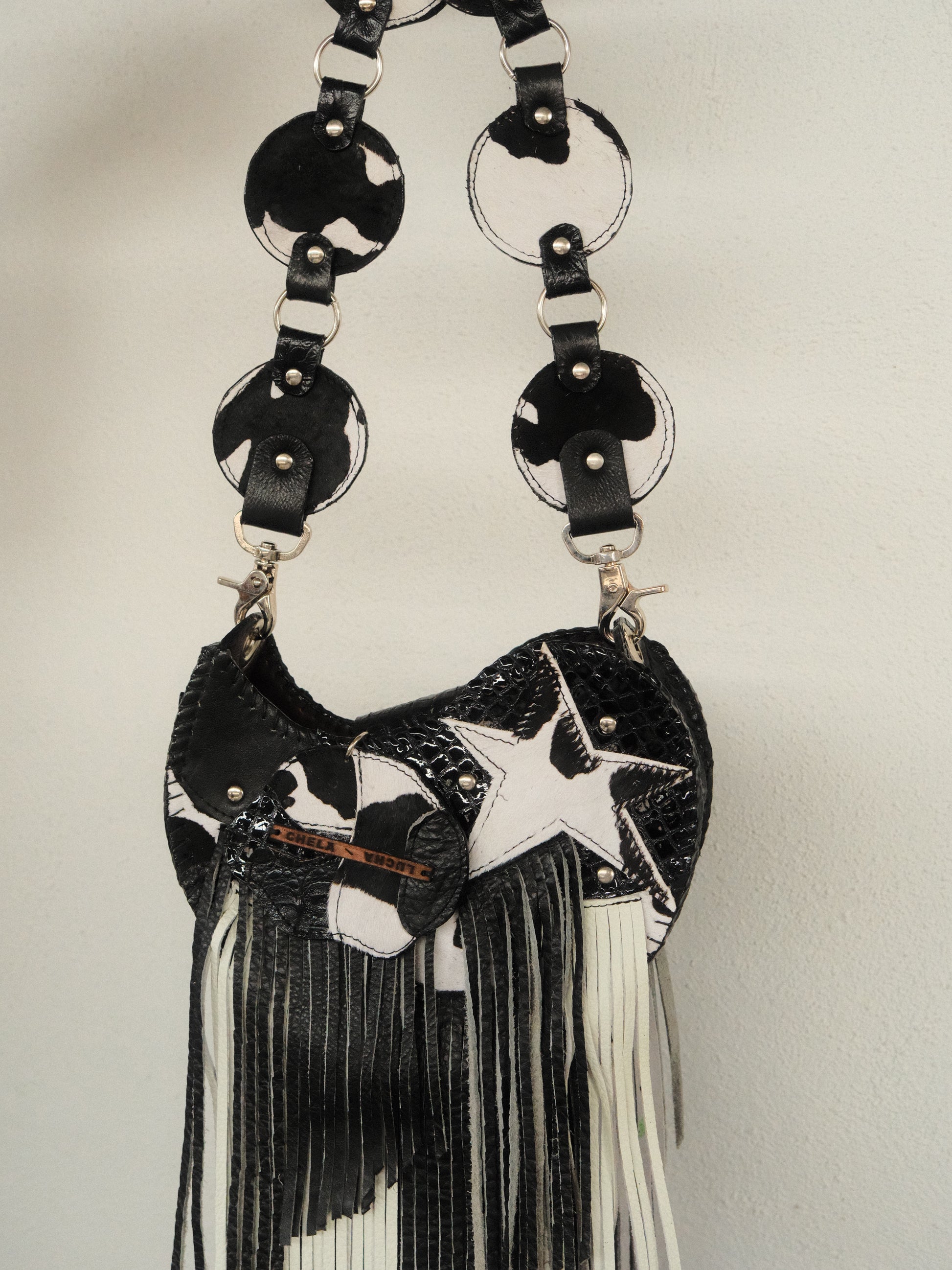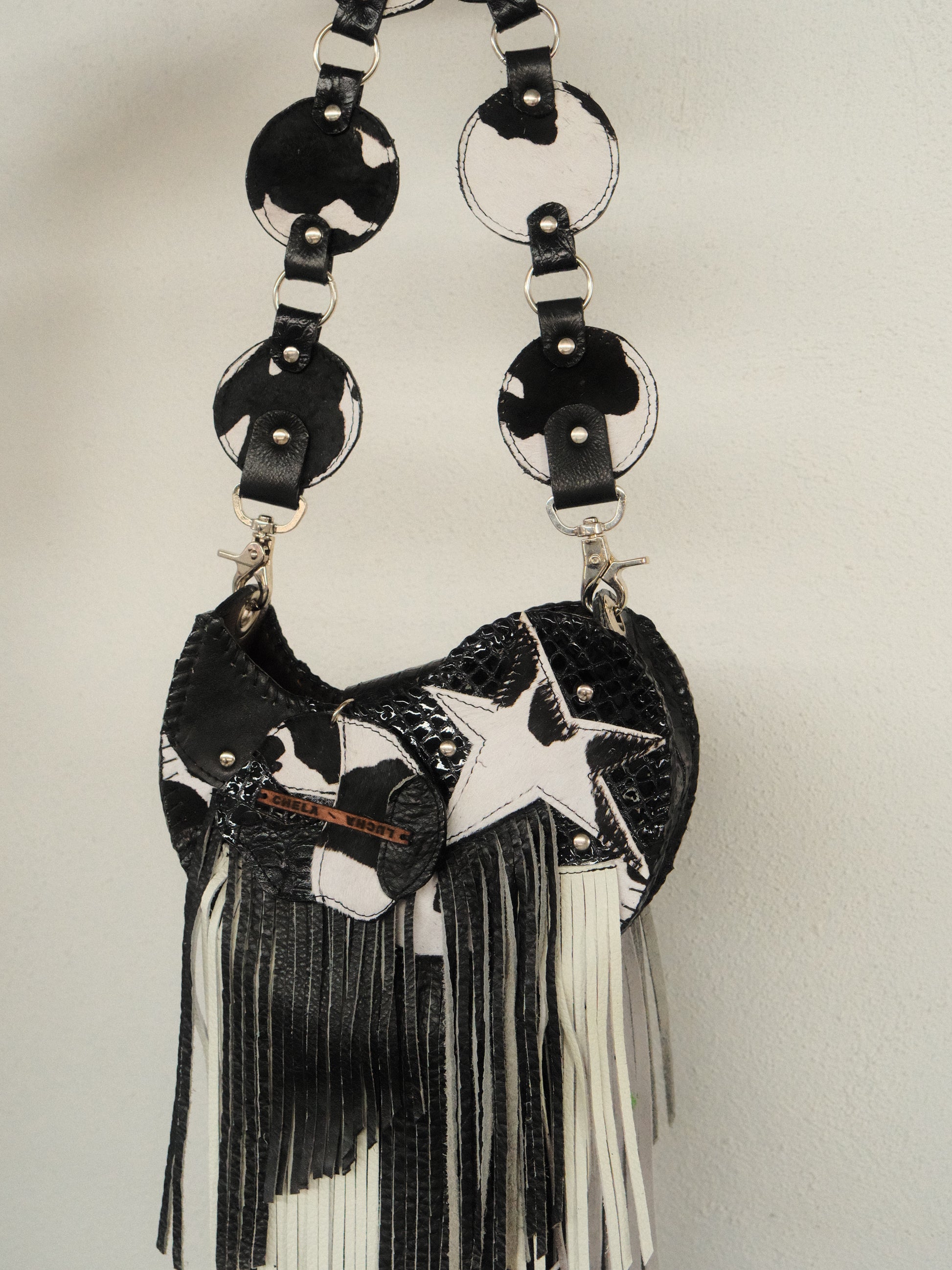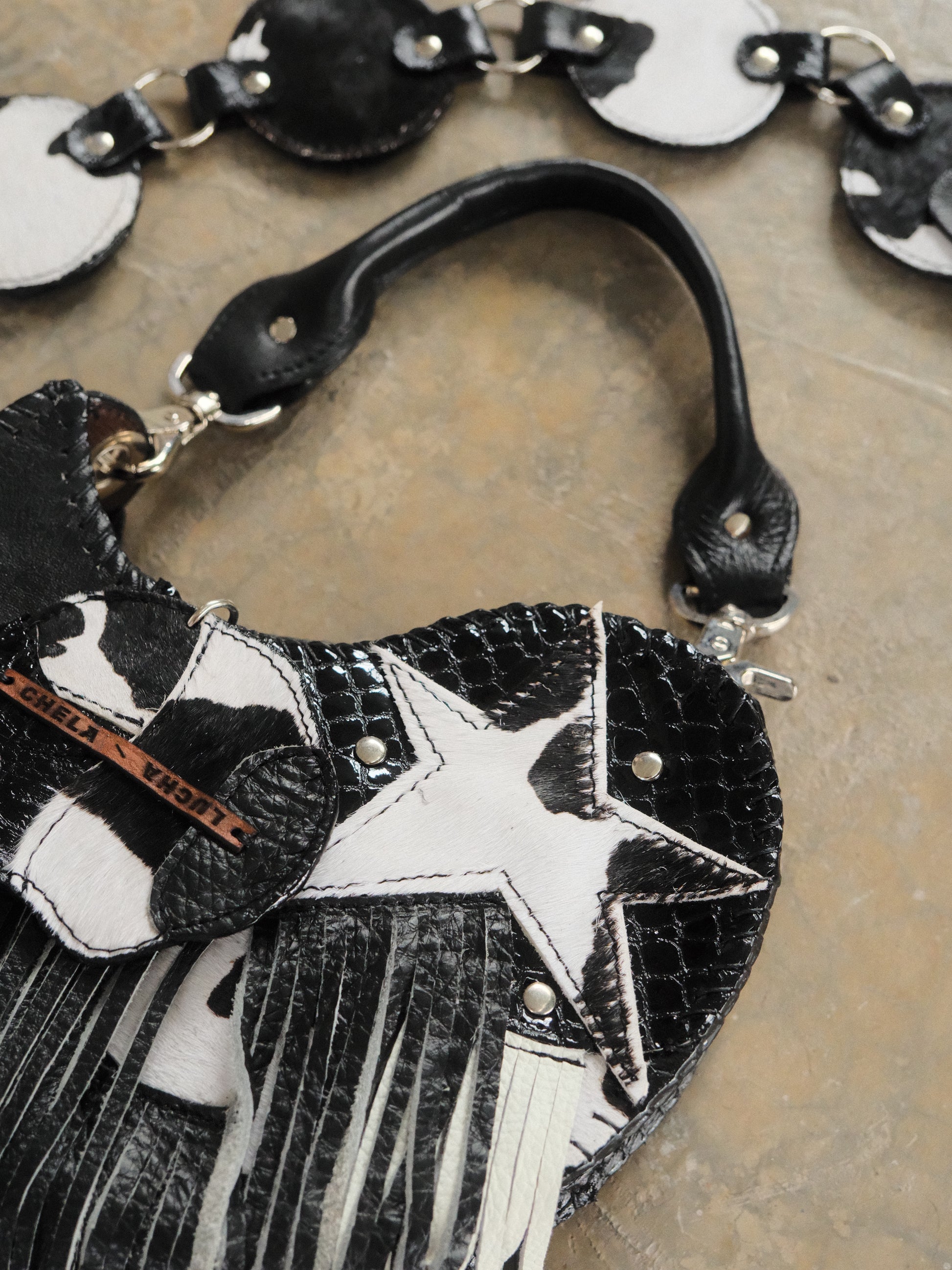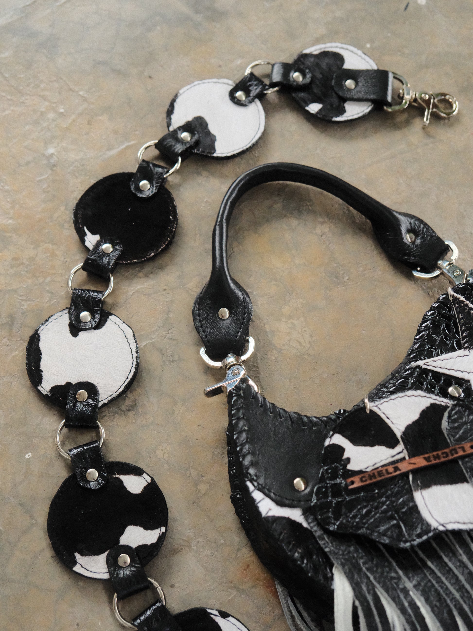 Bolsa TOÑA hecha con pedacera de piel en tonos blanco y negro.Detalles de remaches en tono plateado.