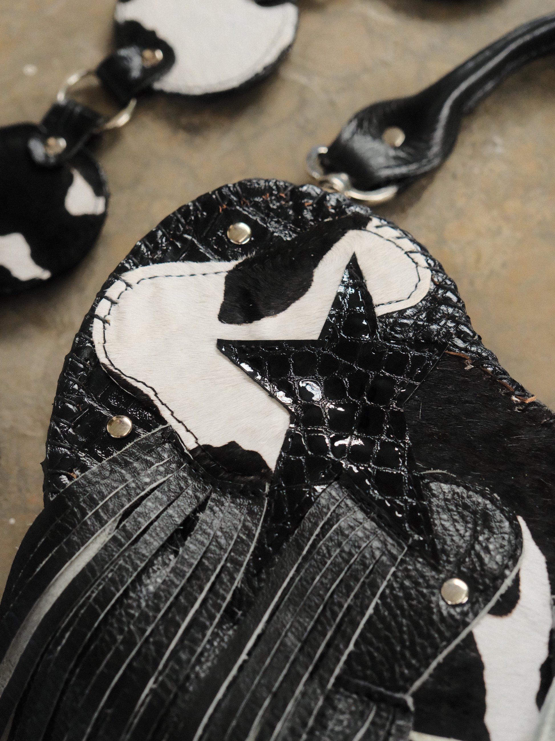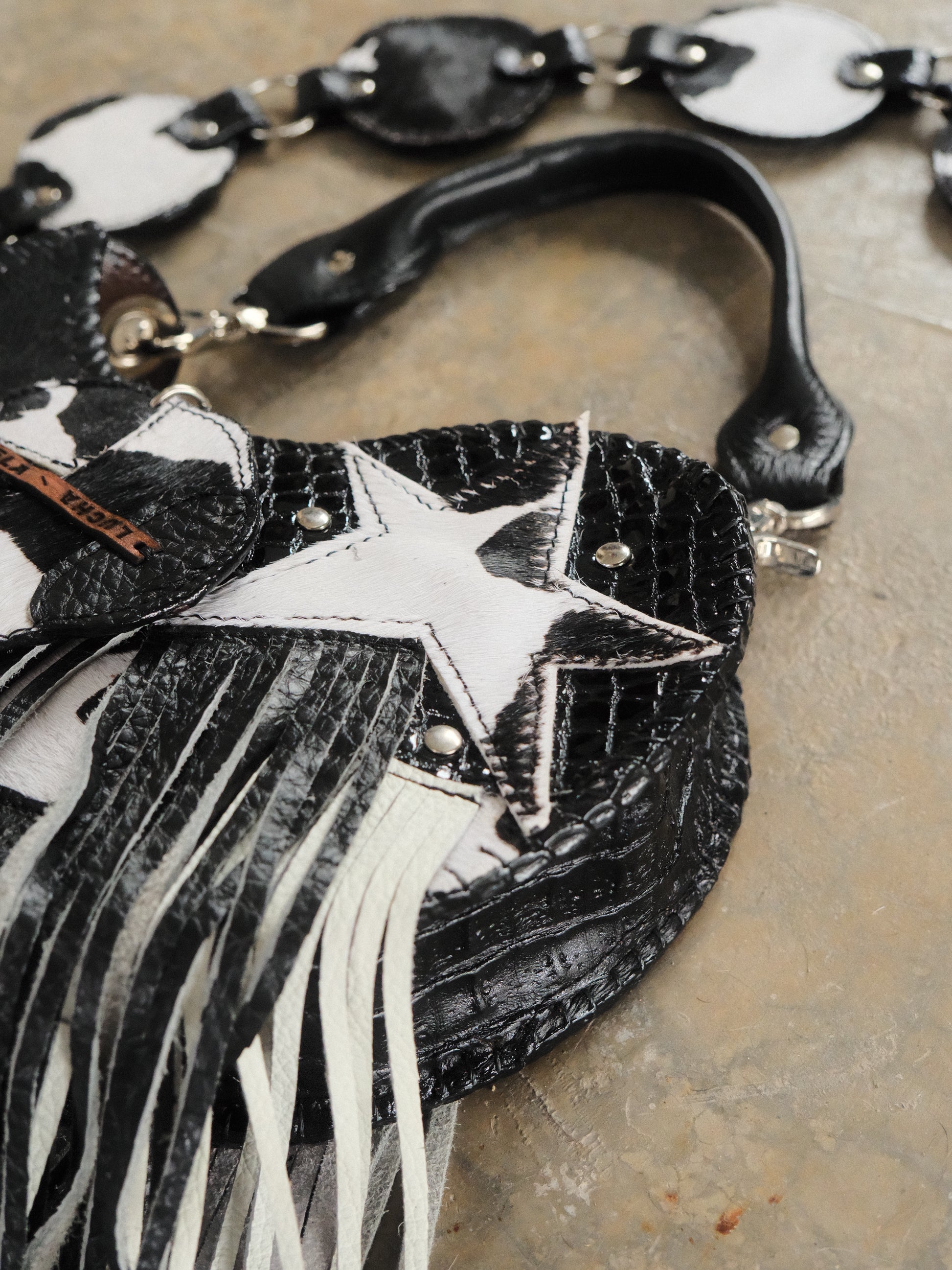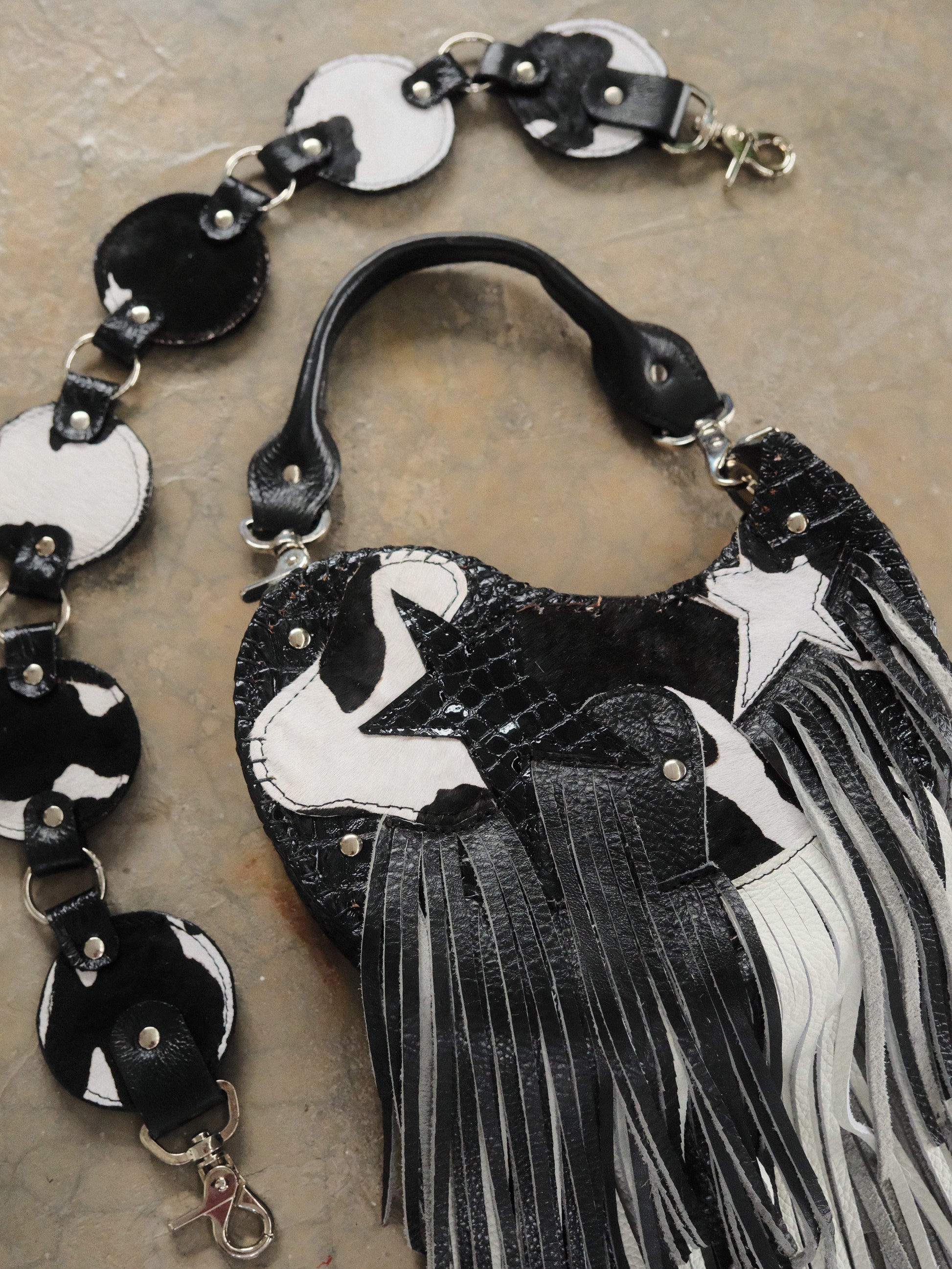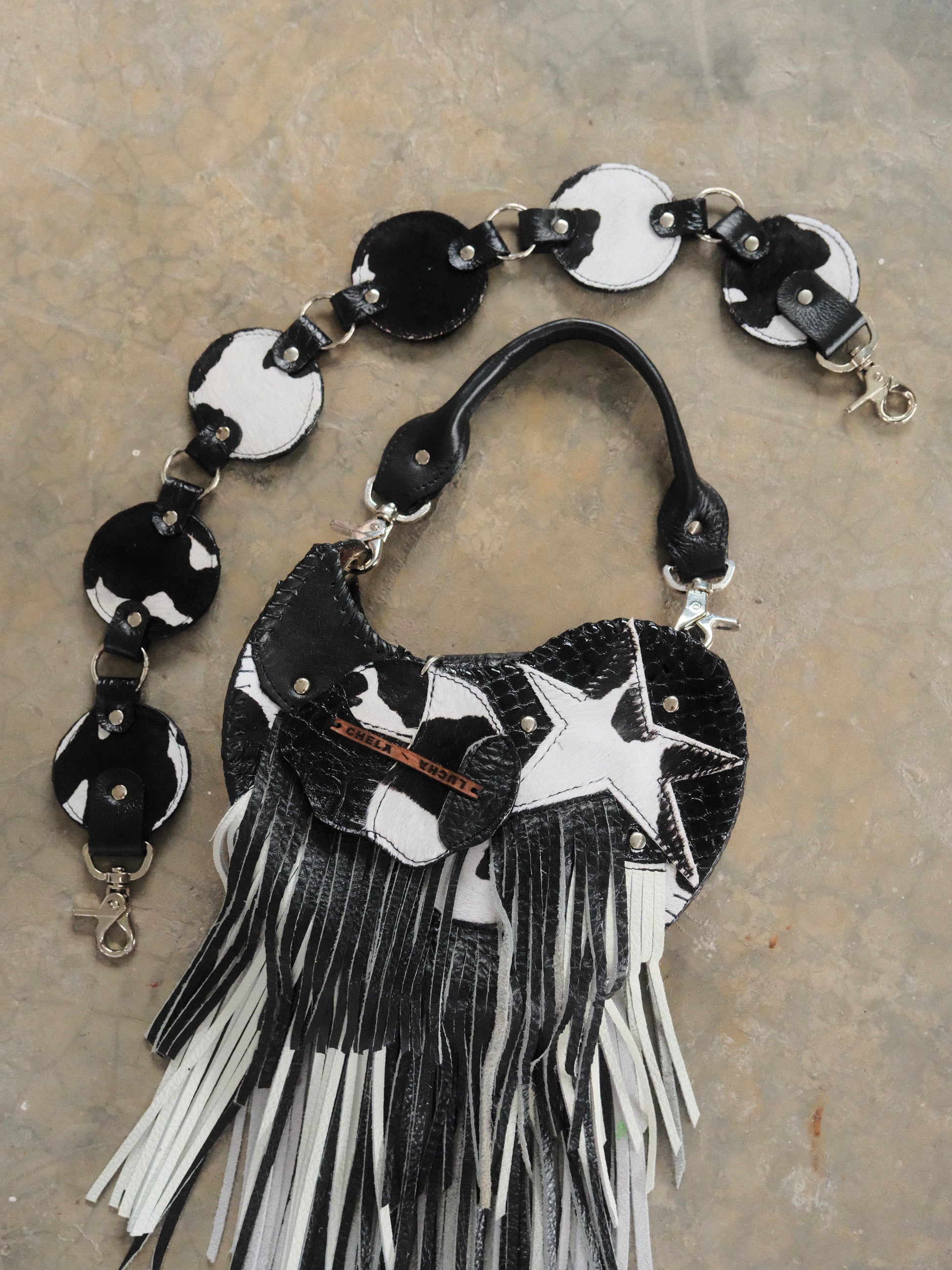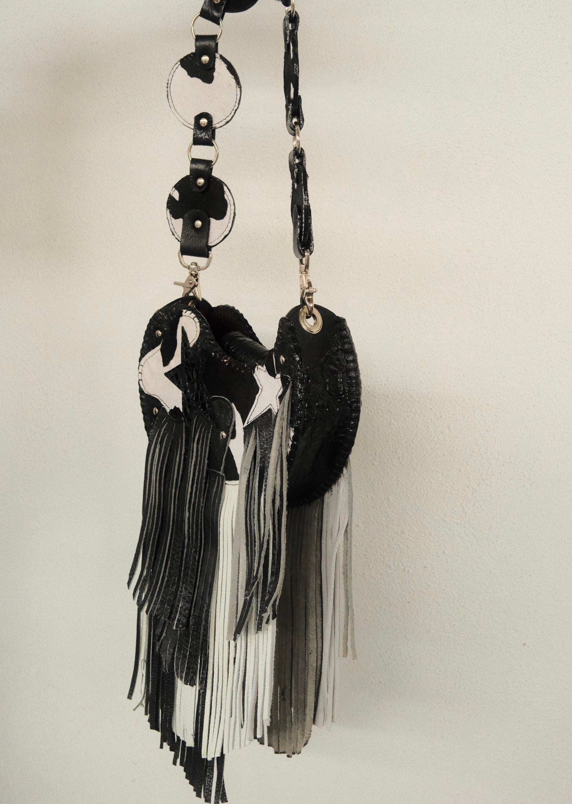 Bolsa TOÑA hecha con pedacera de piel en tonos blanco y negro.Detalles de remaches en tono plateado.