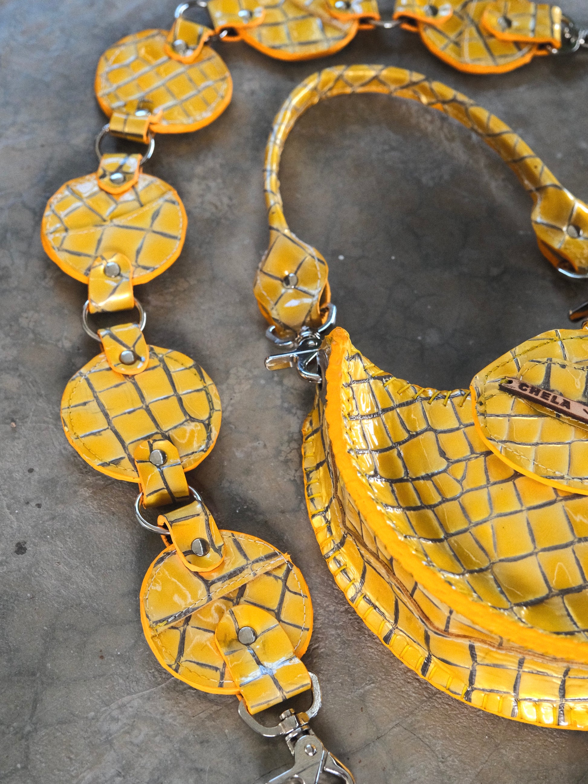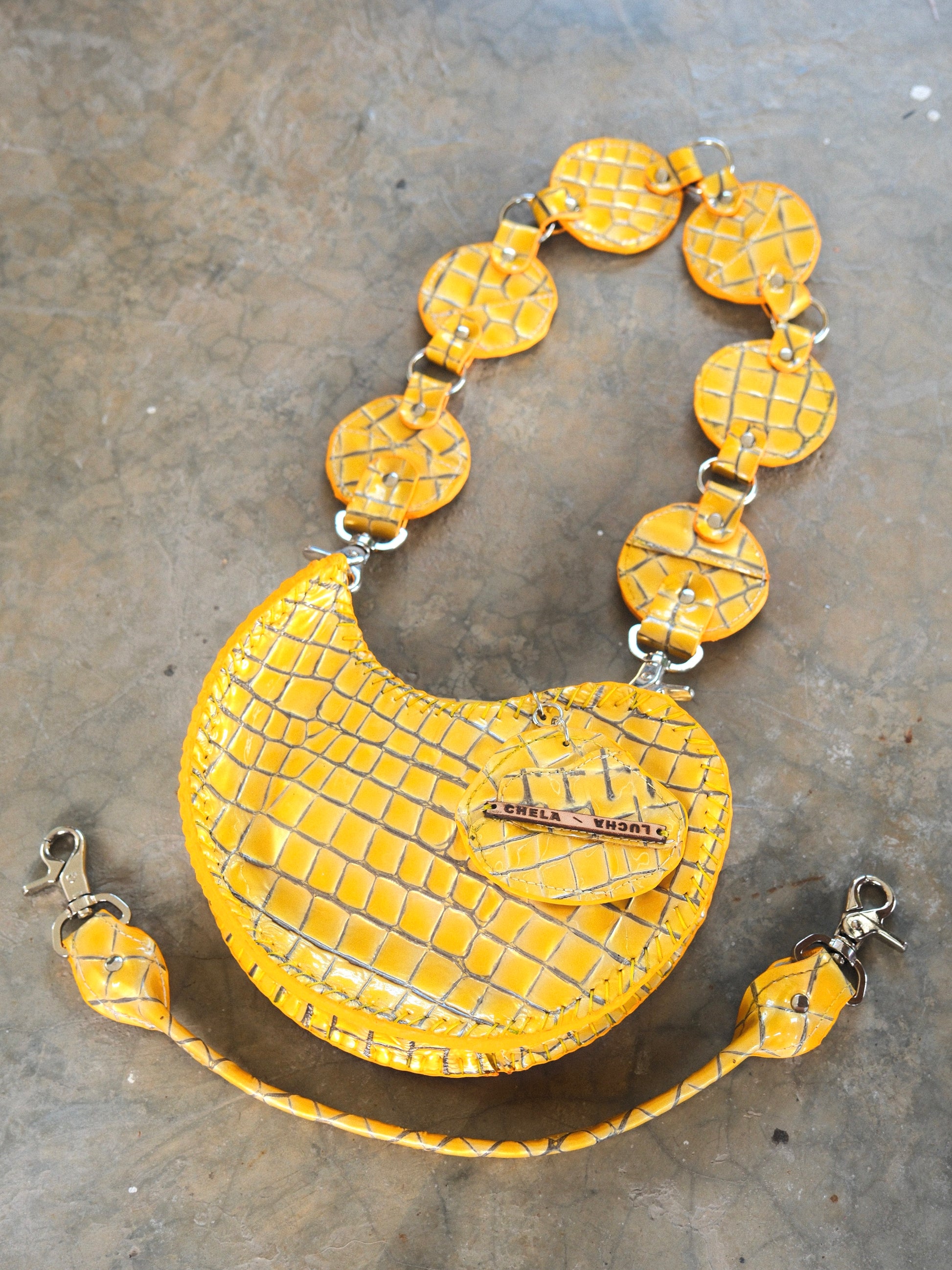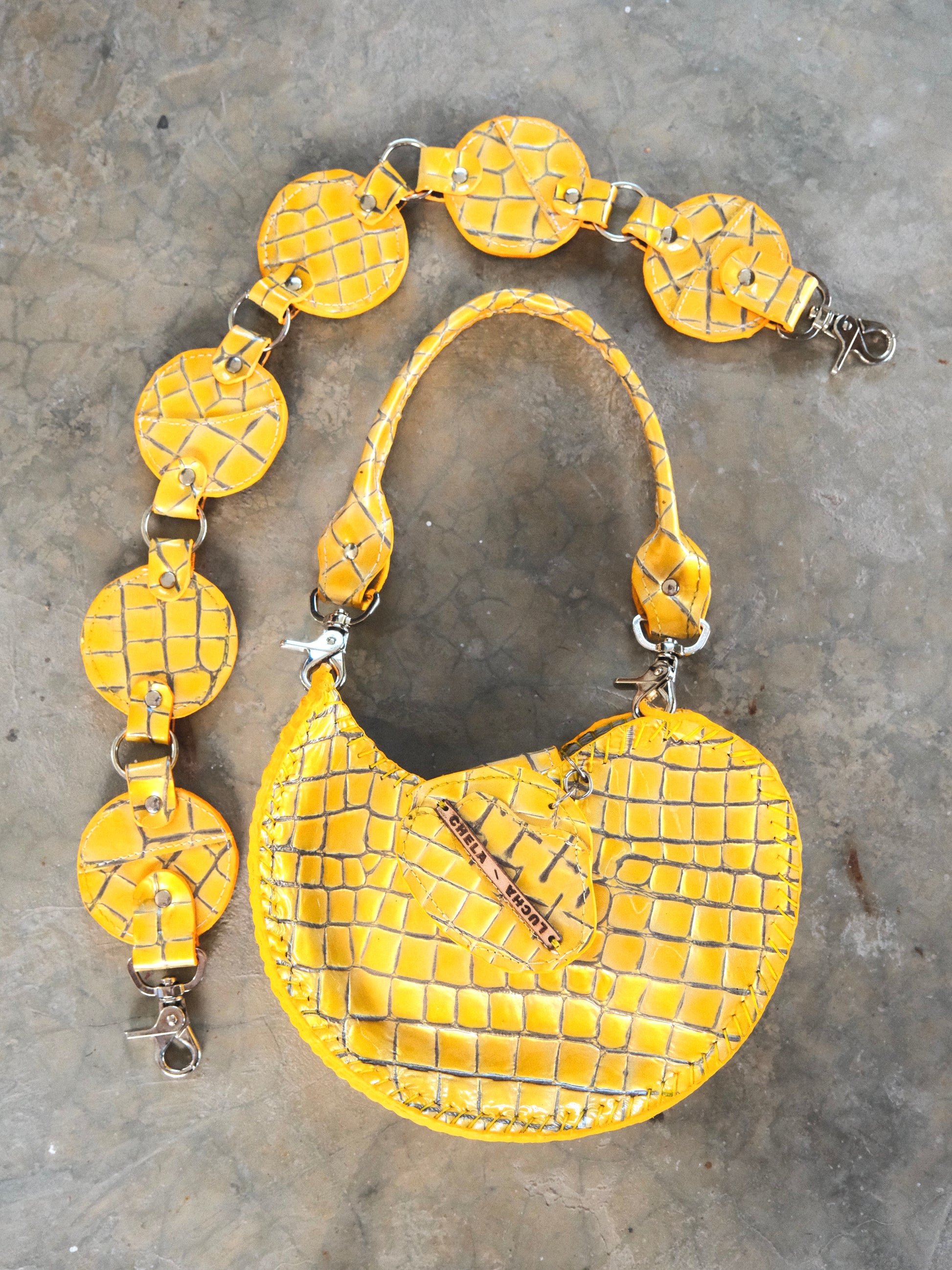 Bolsa TOÑA hecha con pedacera de piel en tono amarillo.