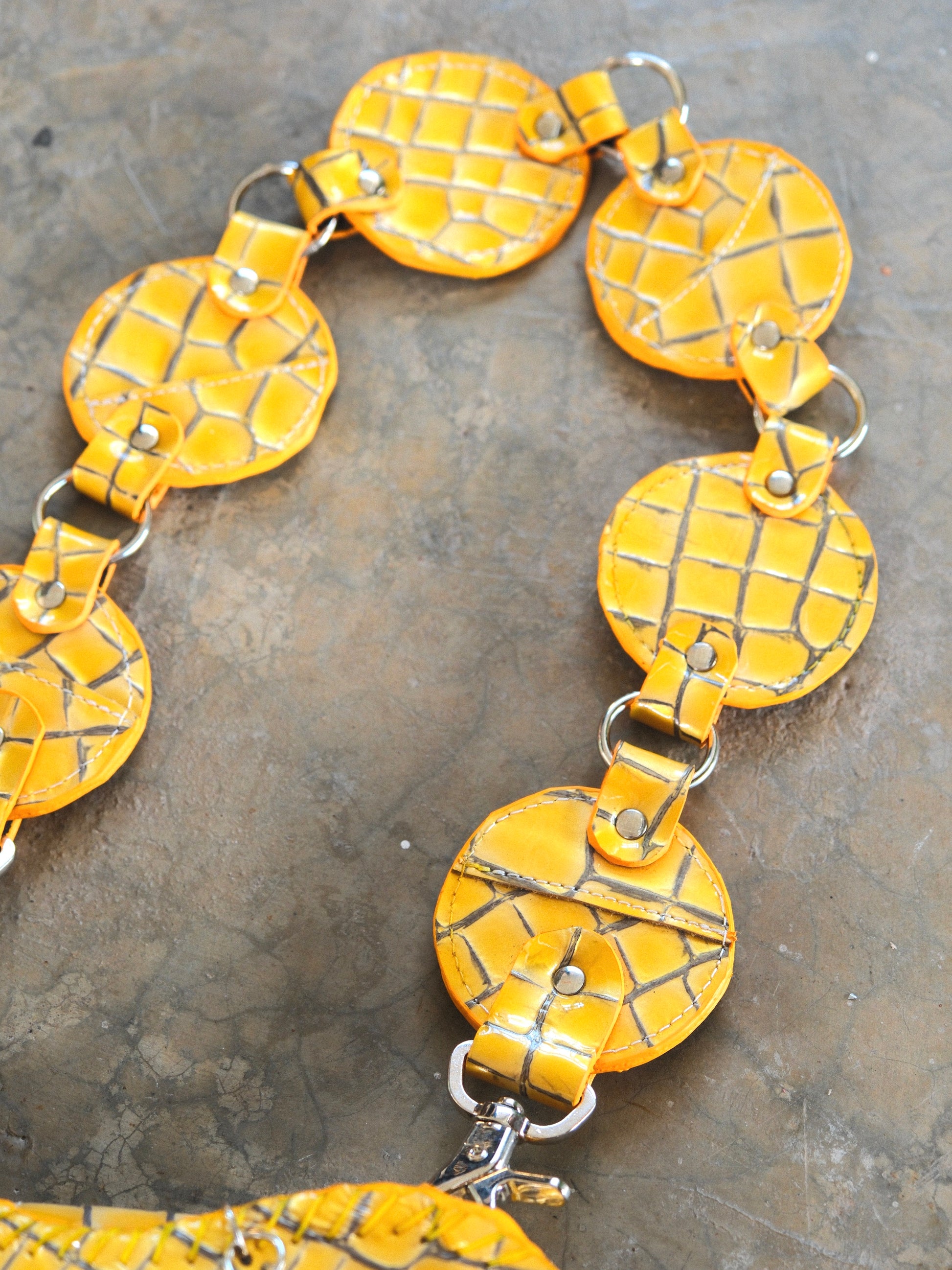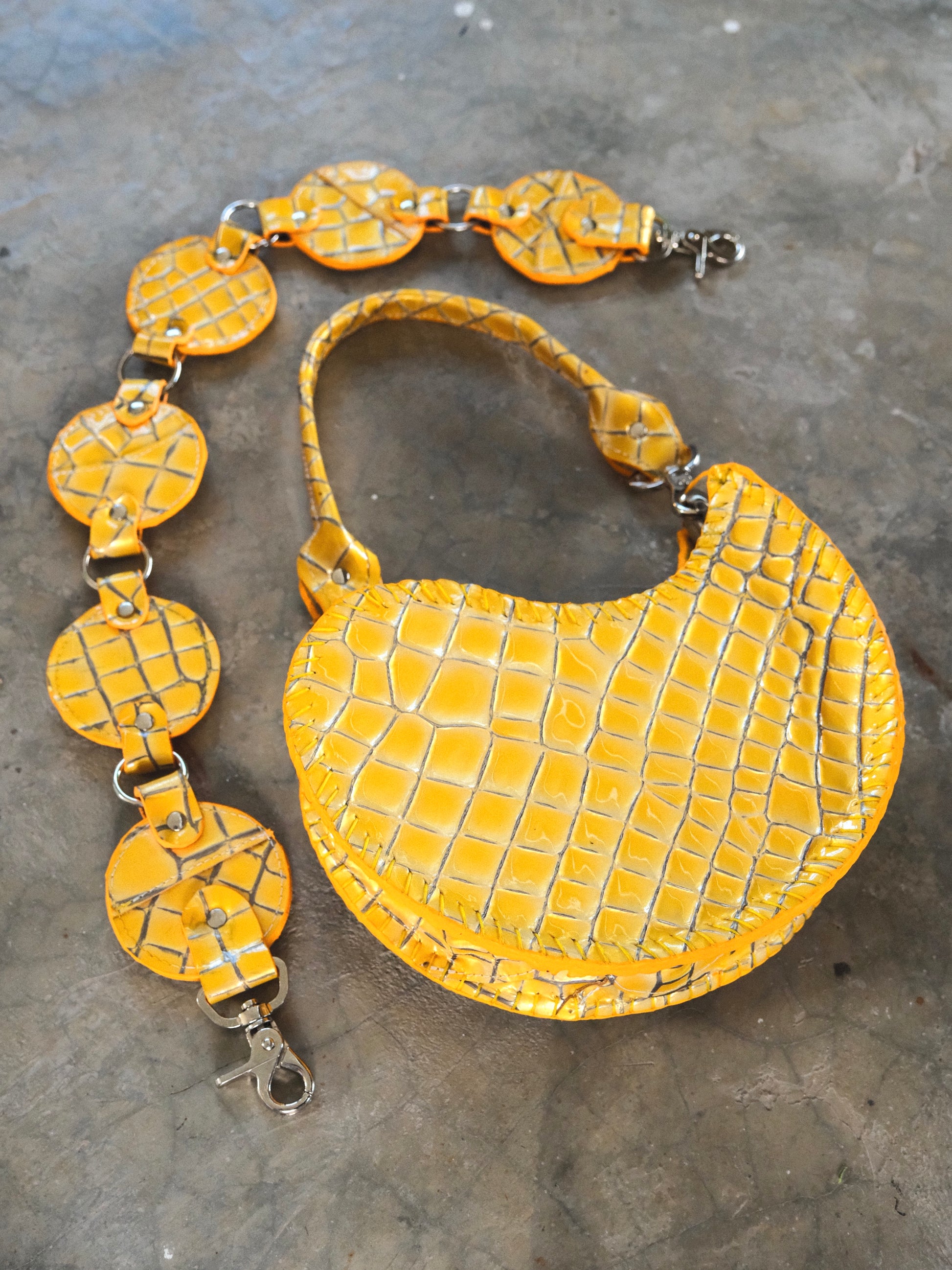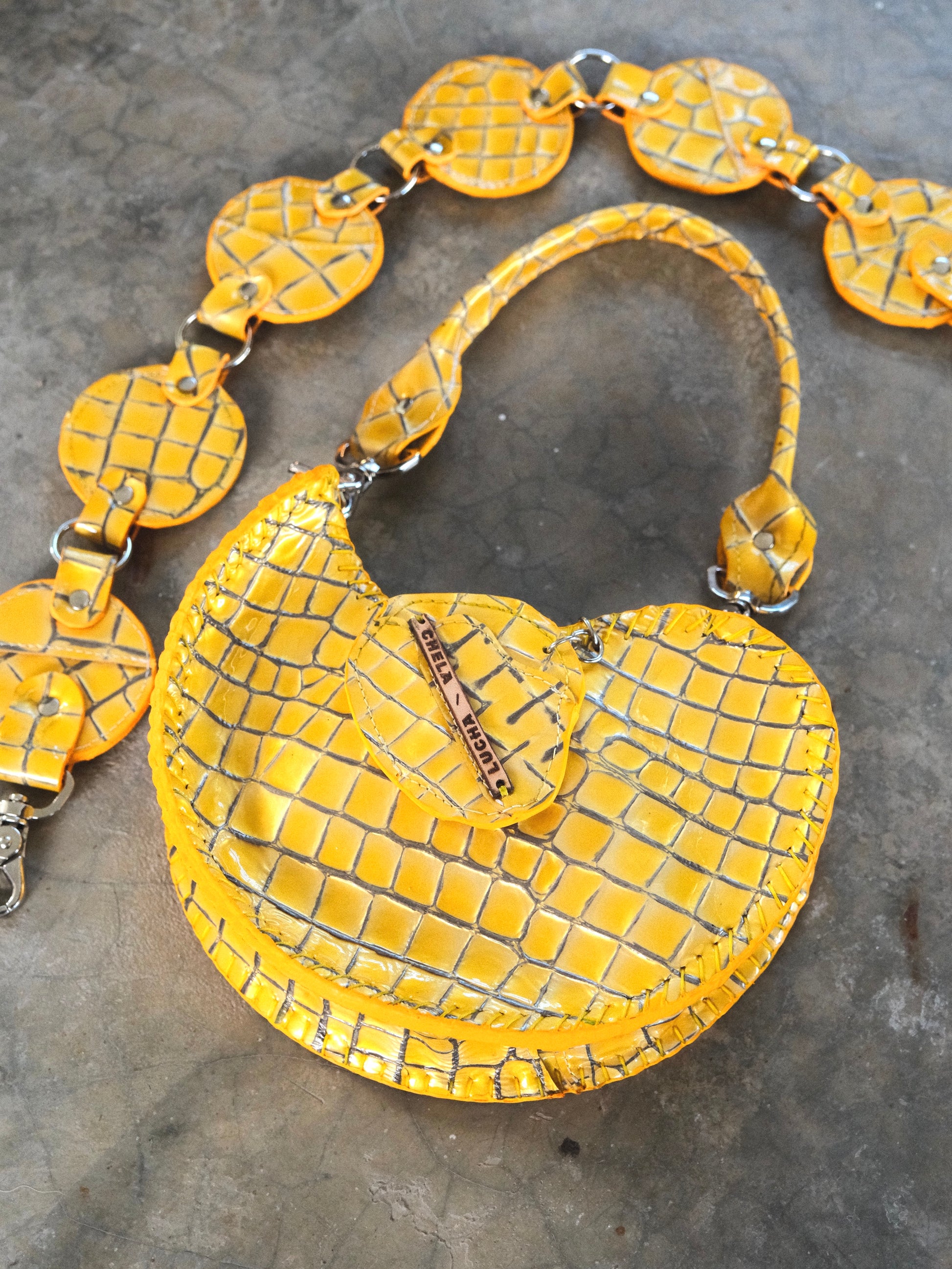 Bolsa TOÑA hecha con pedacera de piel en tono amarillo.