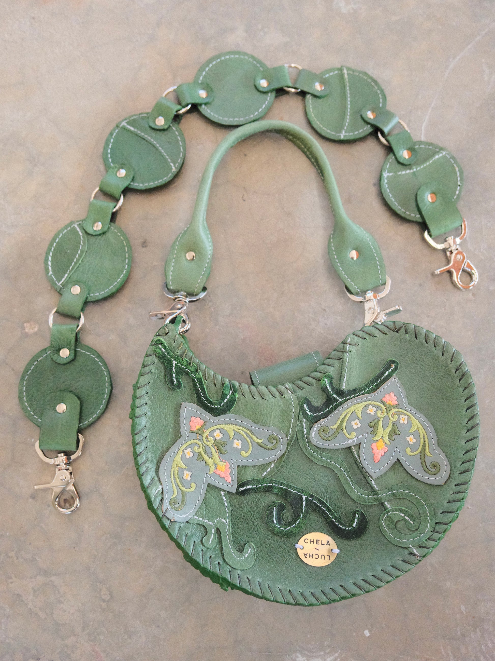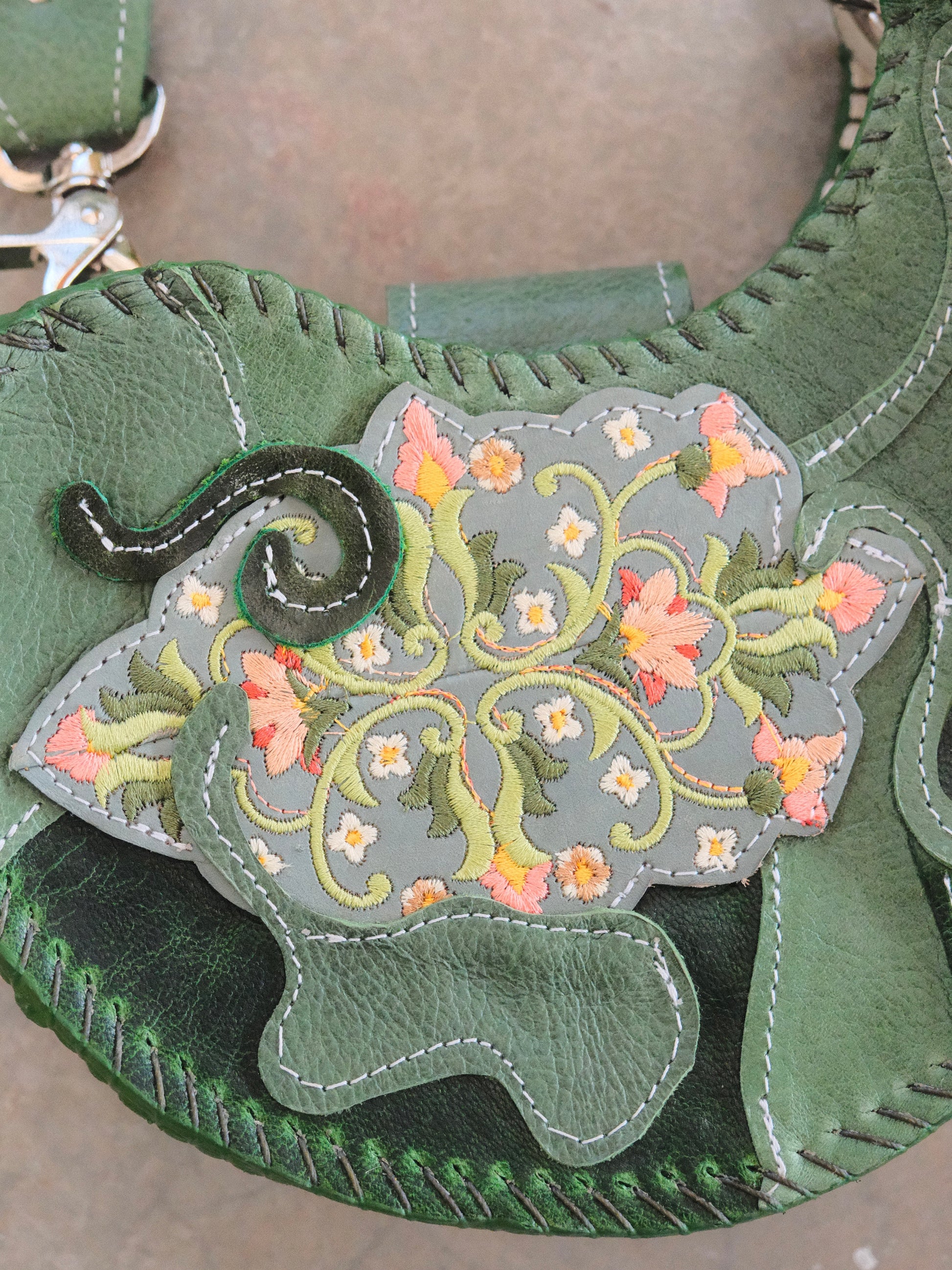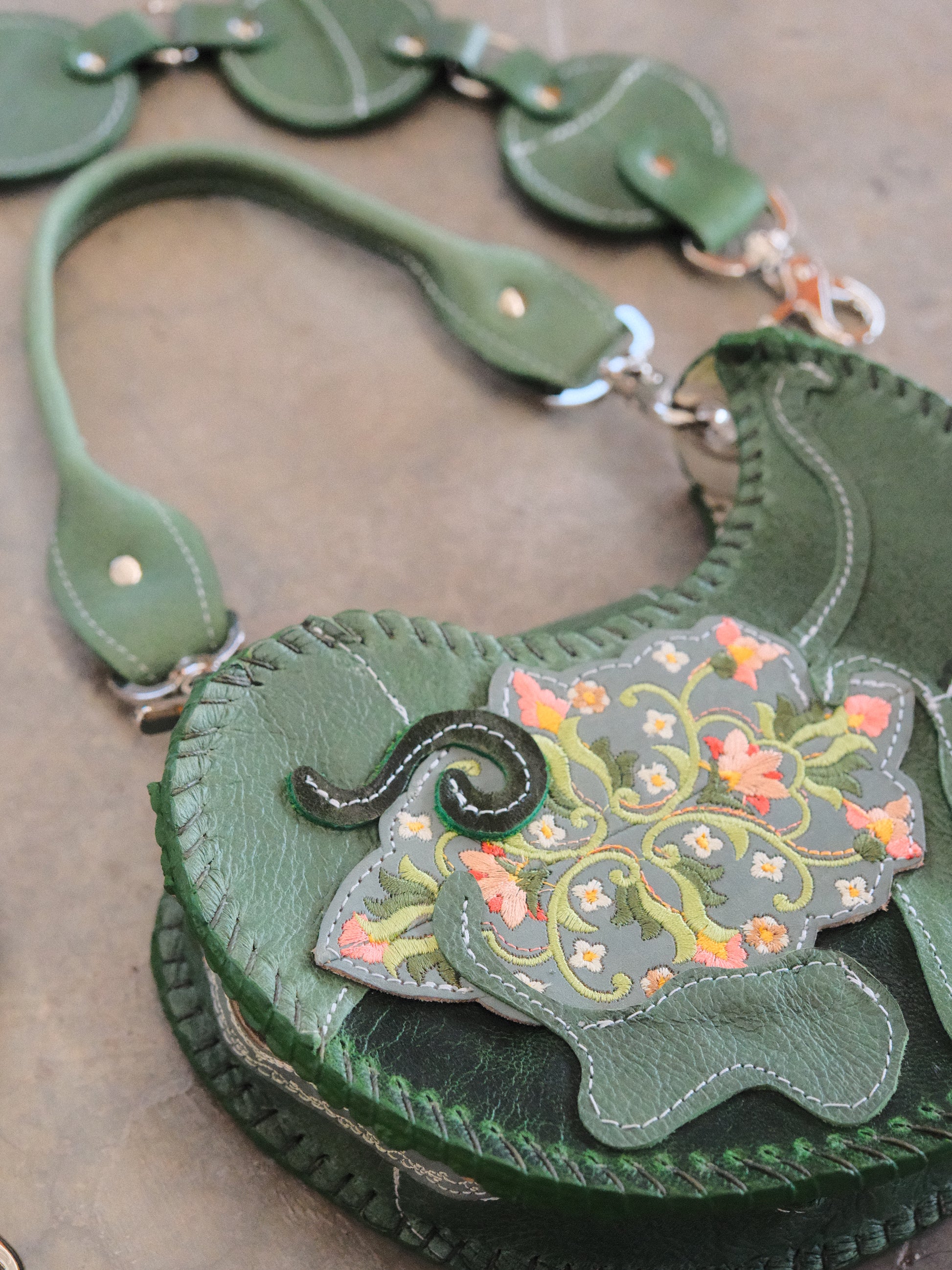 Bolsa TOÑA hecha con pedacera de piel en tono verde y retacaría d piel bordada.