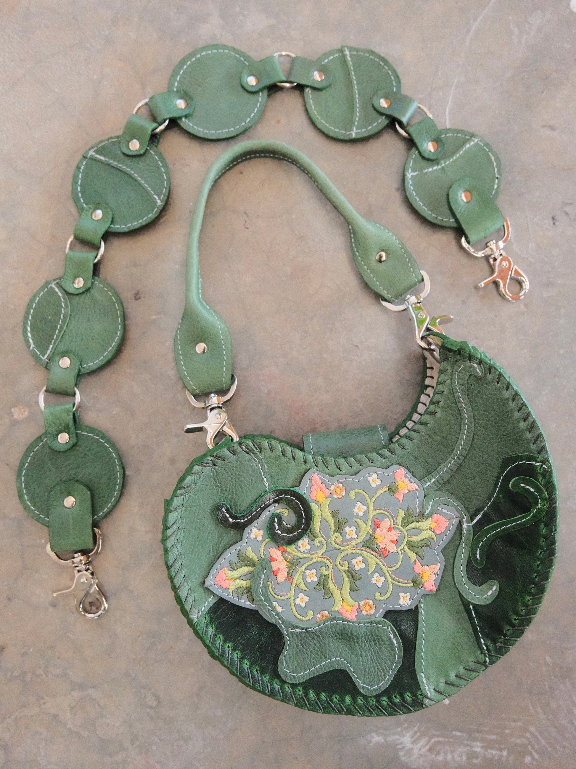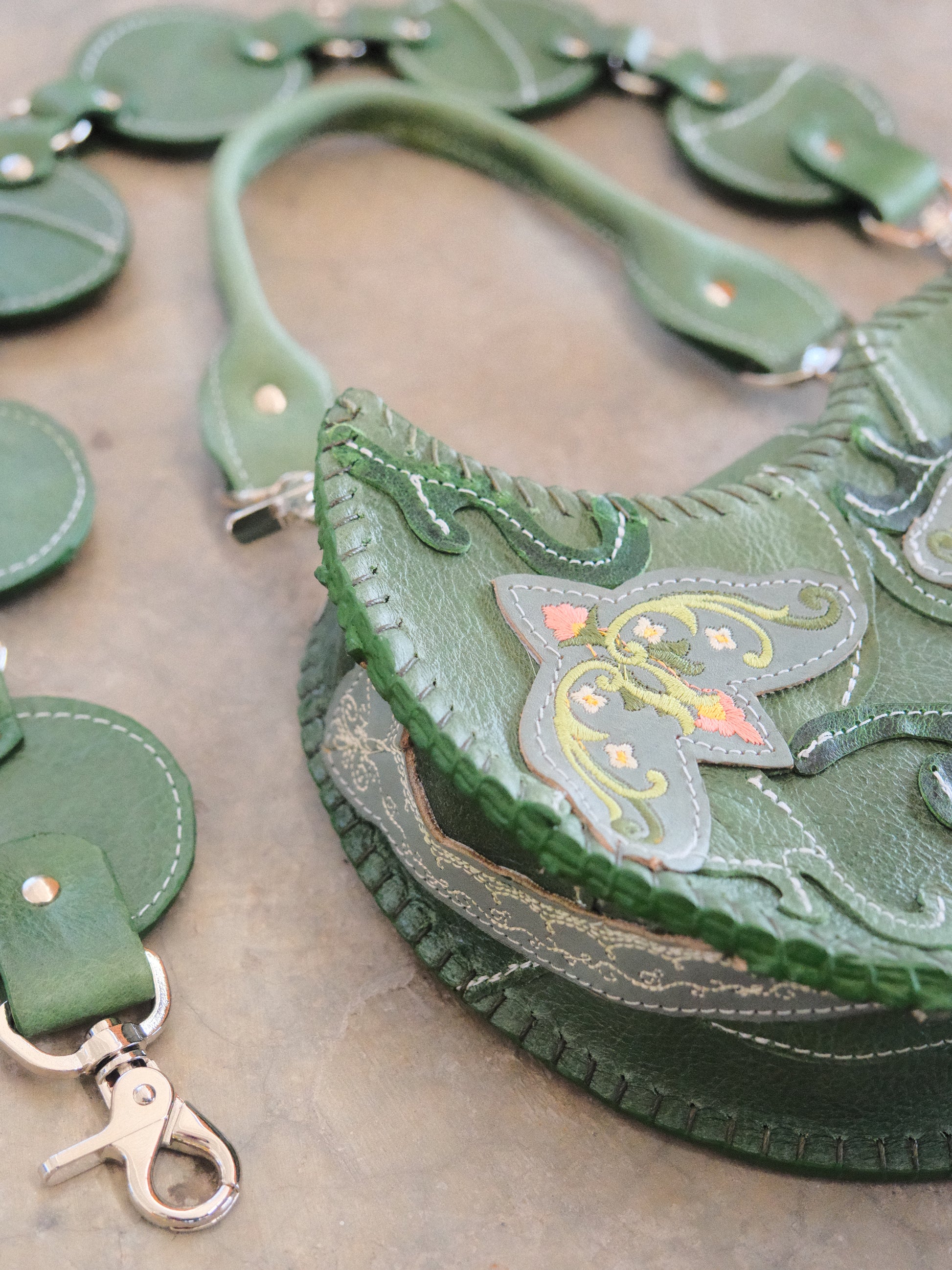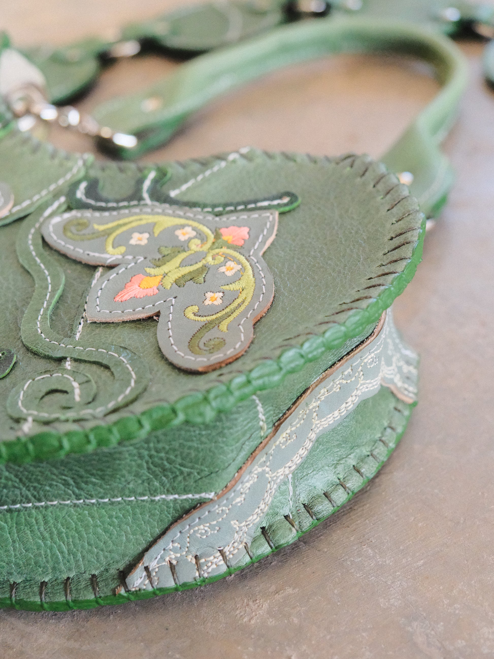 Bolsa TOÑA hecha con pedacera de piel en tono verde y retacaría d piel bordada.