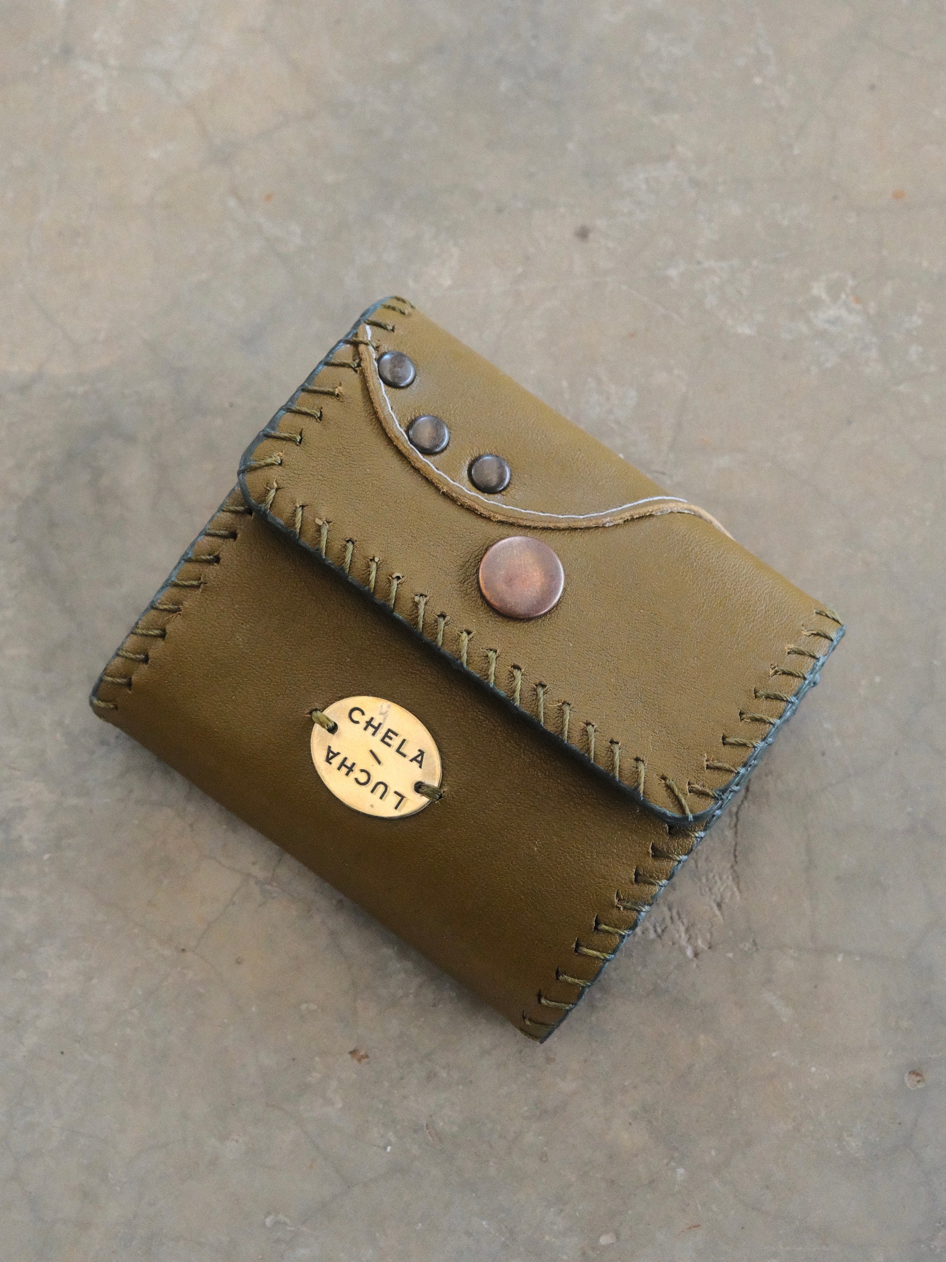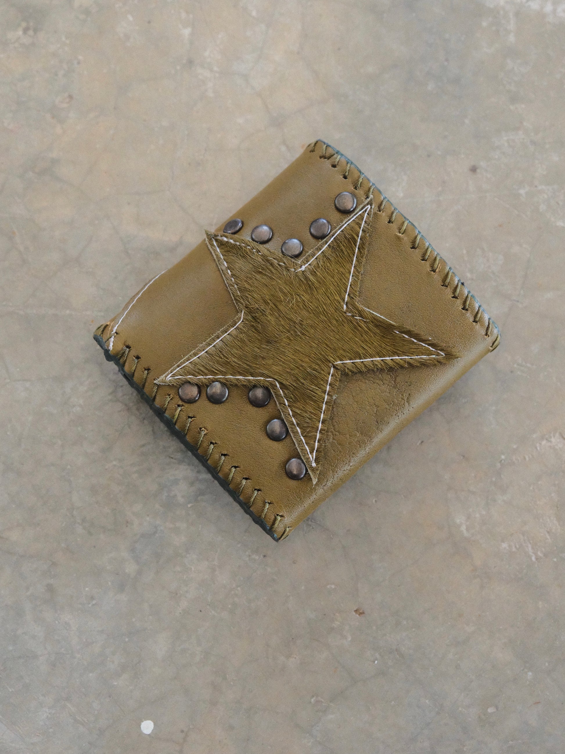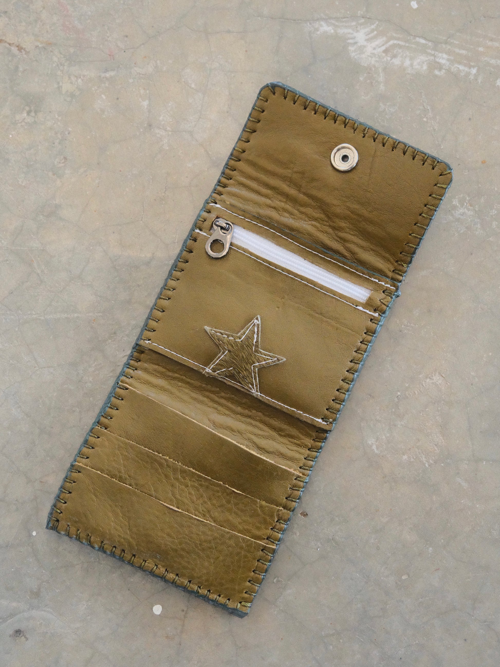 Cartera TUTI hecha con pedacera de piel en tono verde y textura de pelito verde. Detalles de remaches en tono cromado.