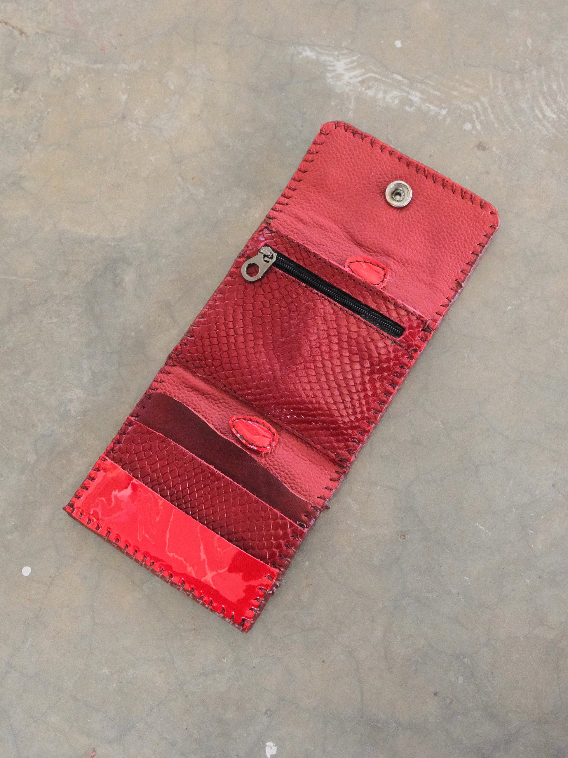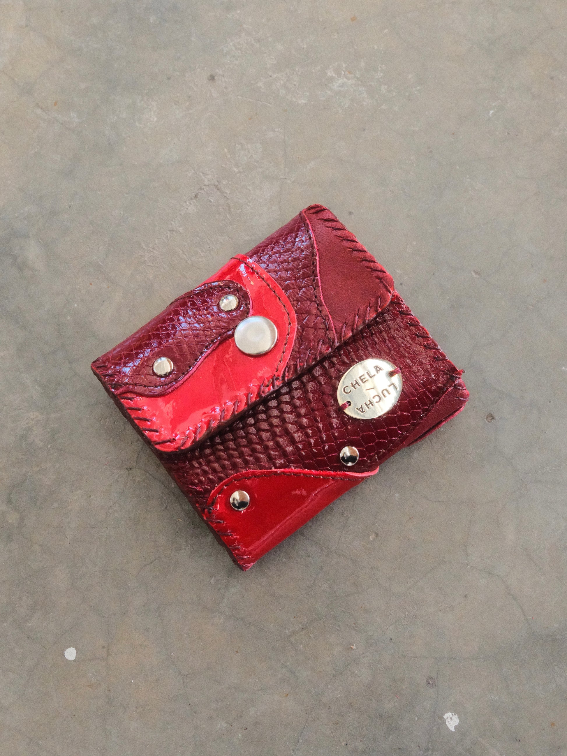 Cartera TUTI hecha con pedacera de piel en tonos rojos y tinto.