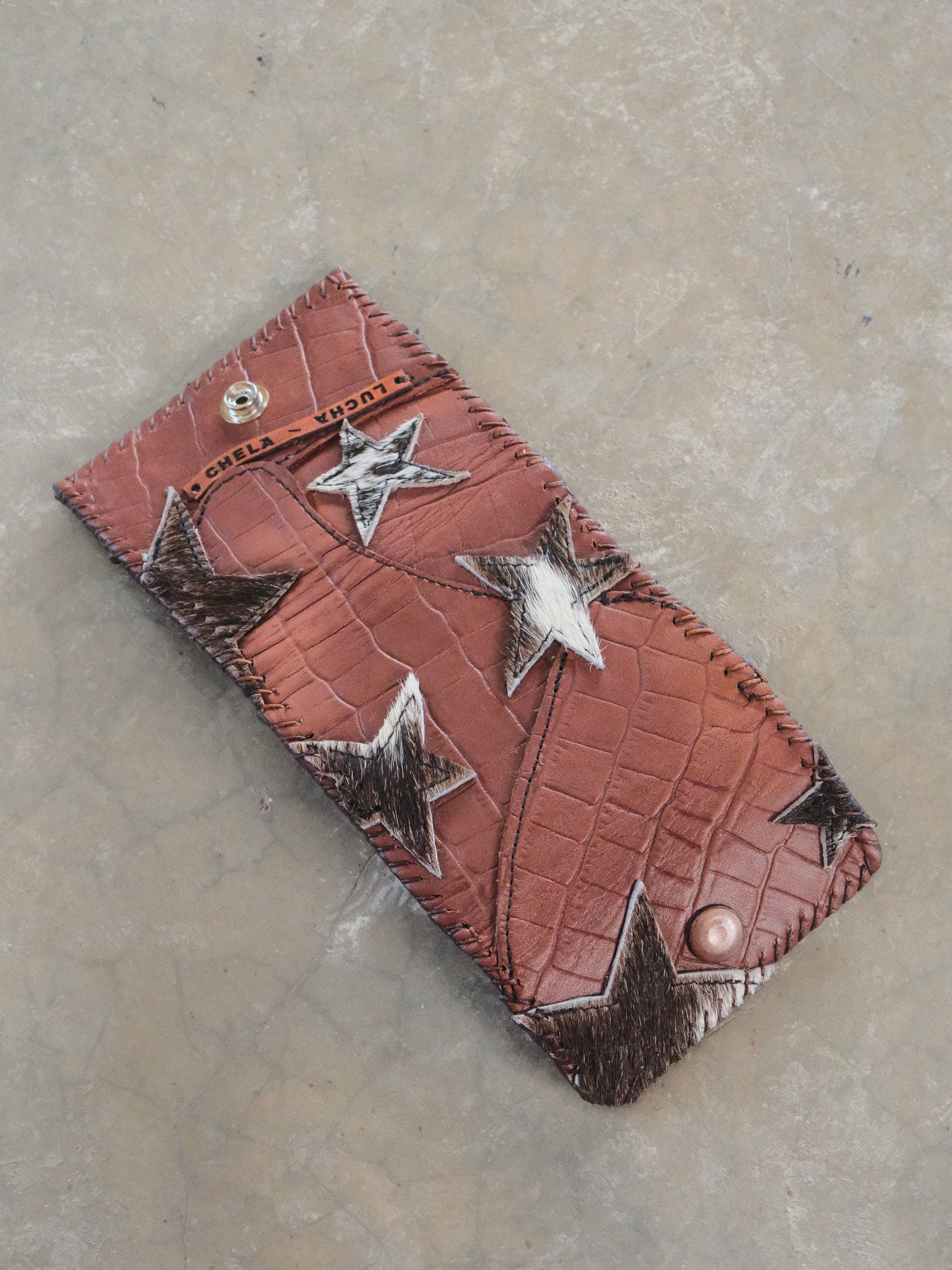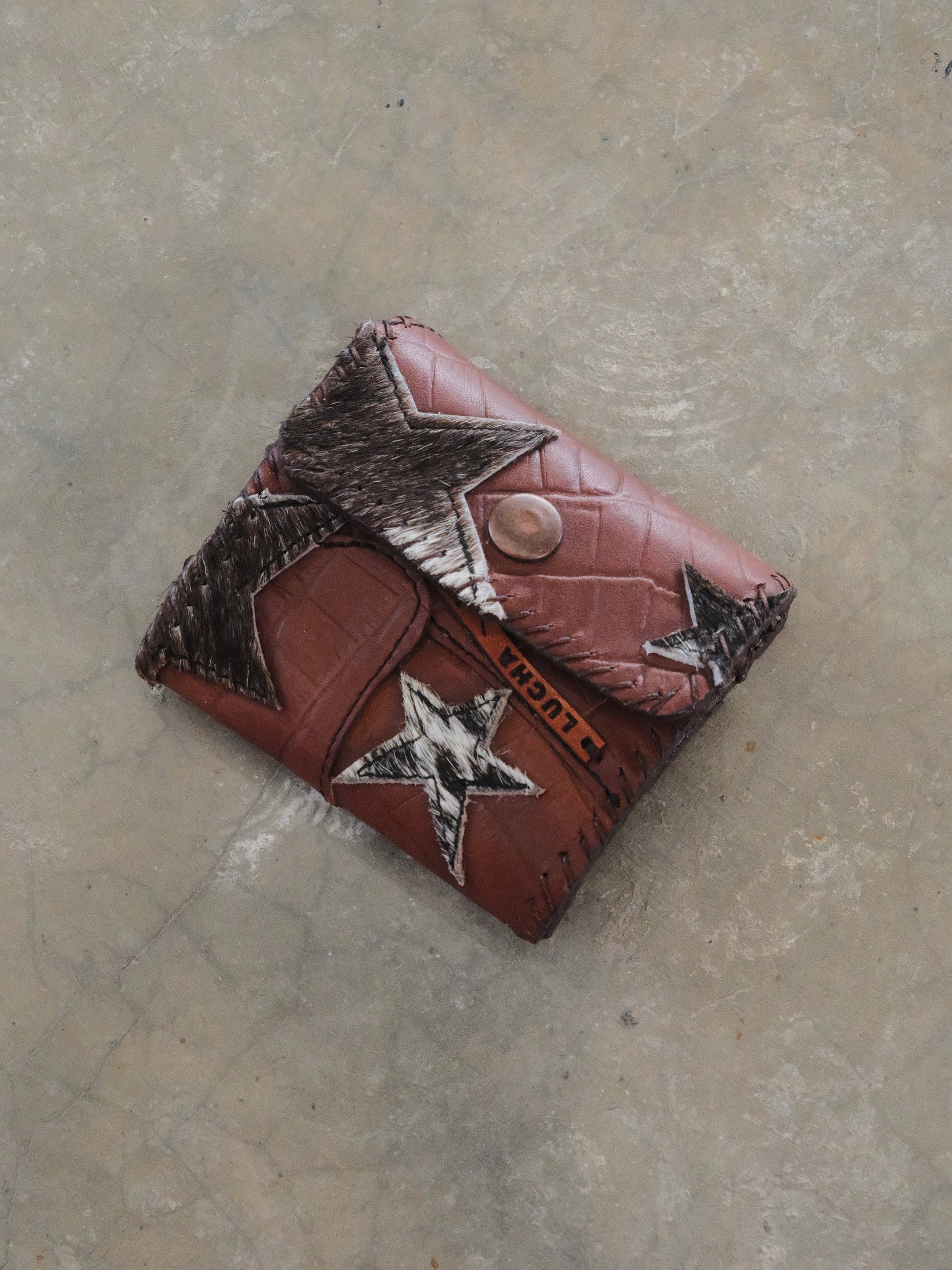 Cartera TUTI hecha con pedacera de piel en distintos tonos.