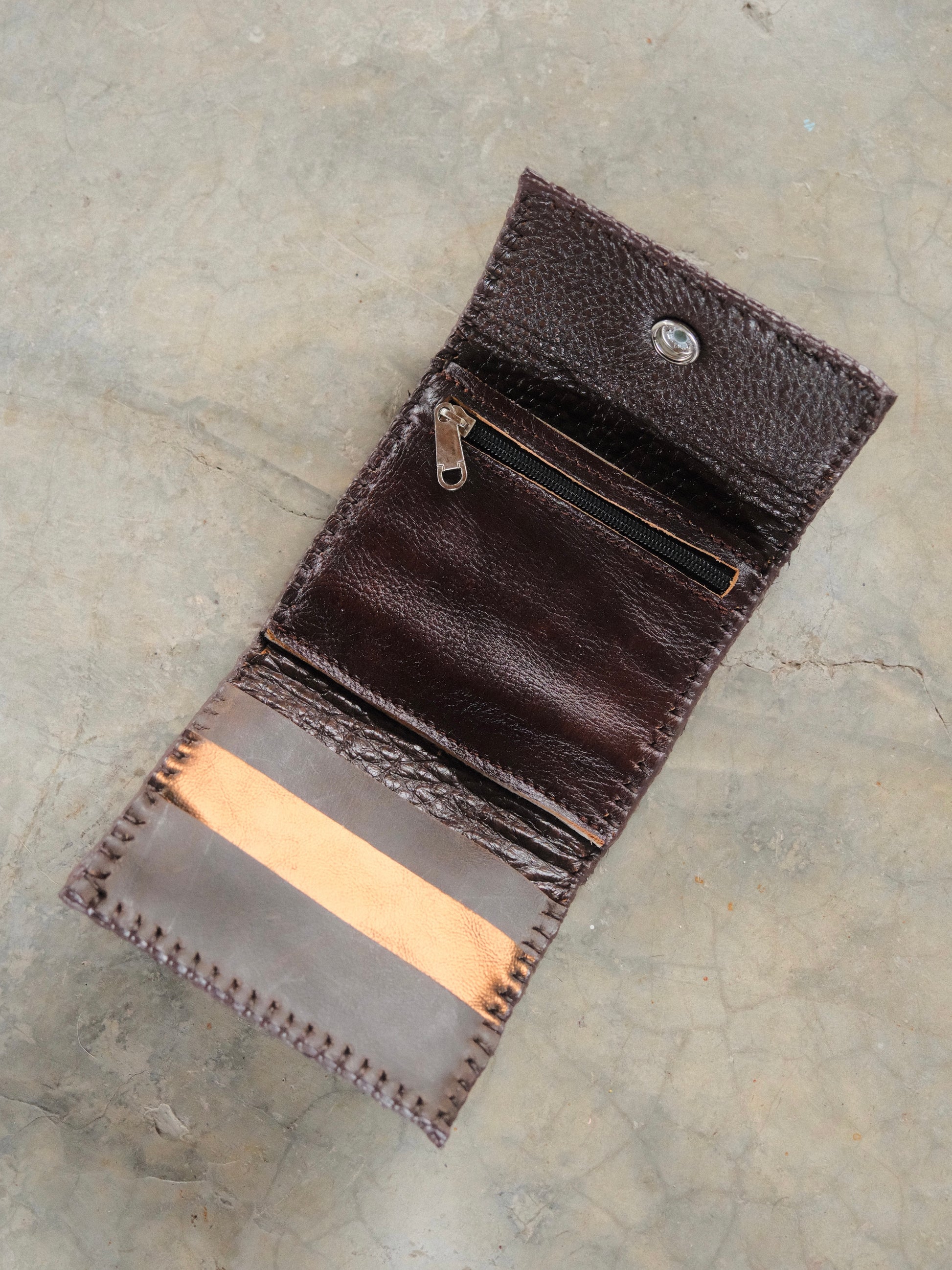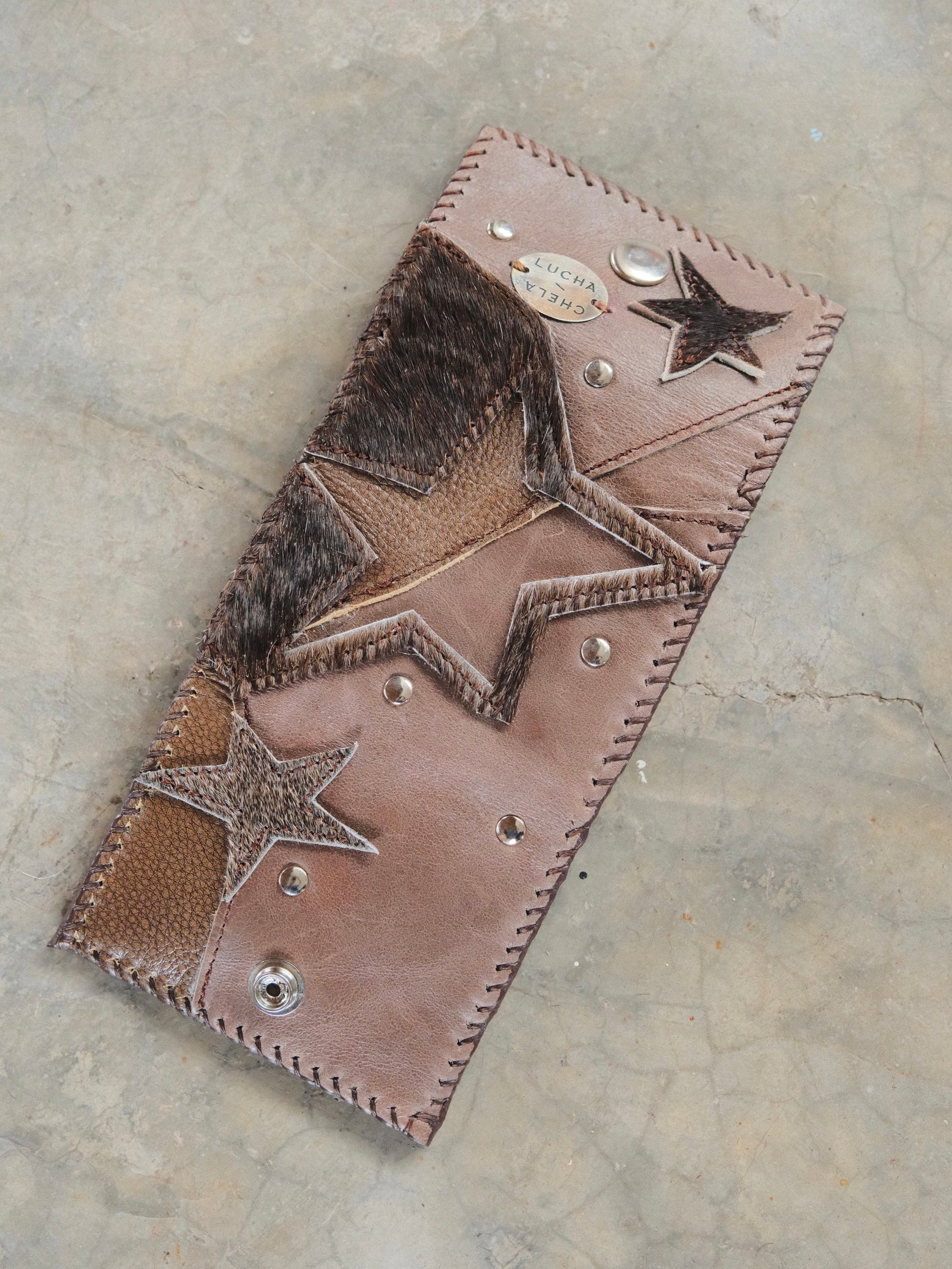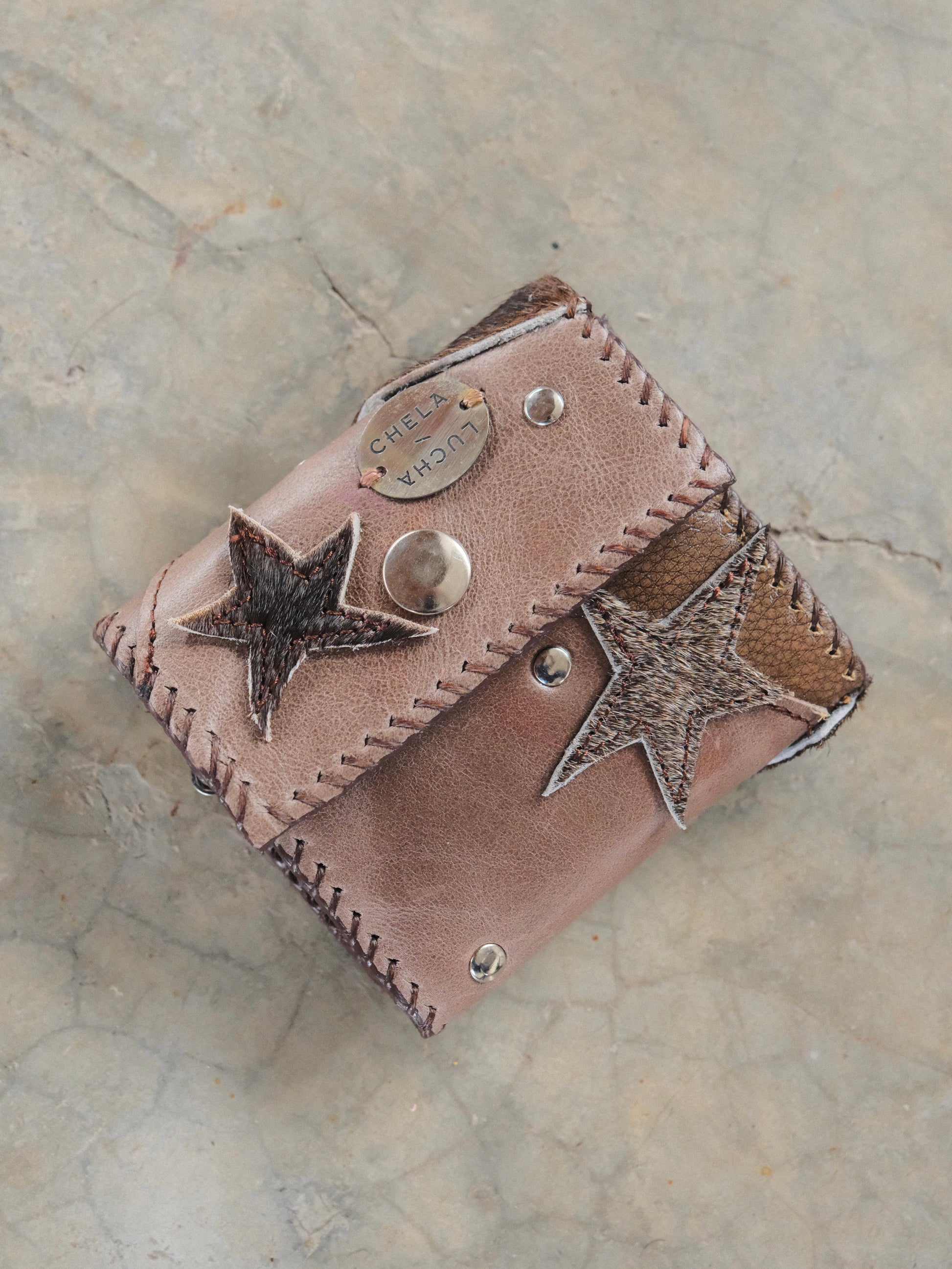 Cartera TUTI hecha con pedacera de piel en tonos variados.