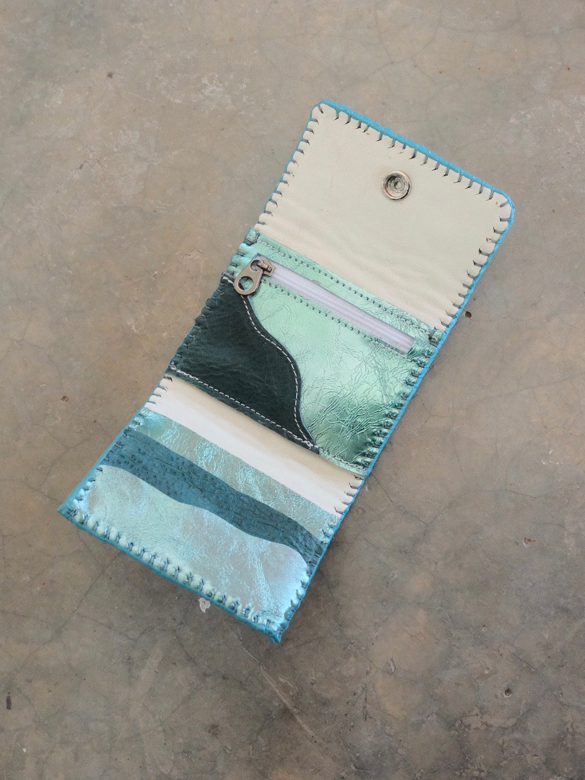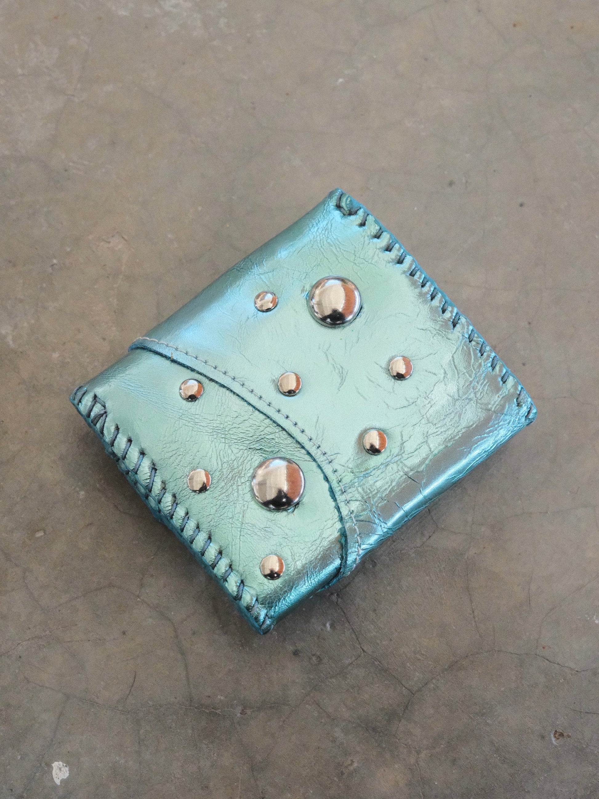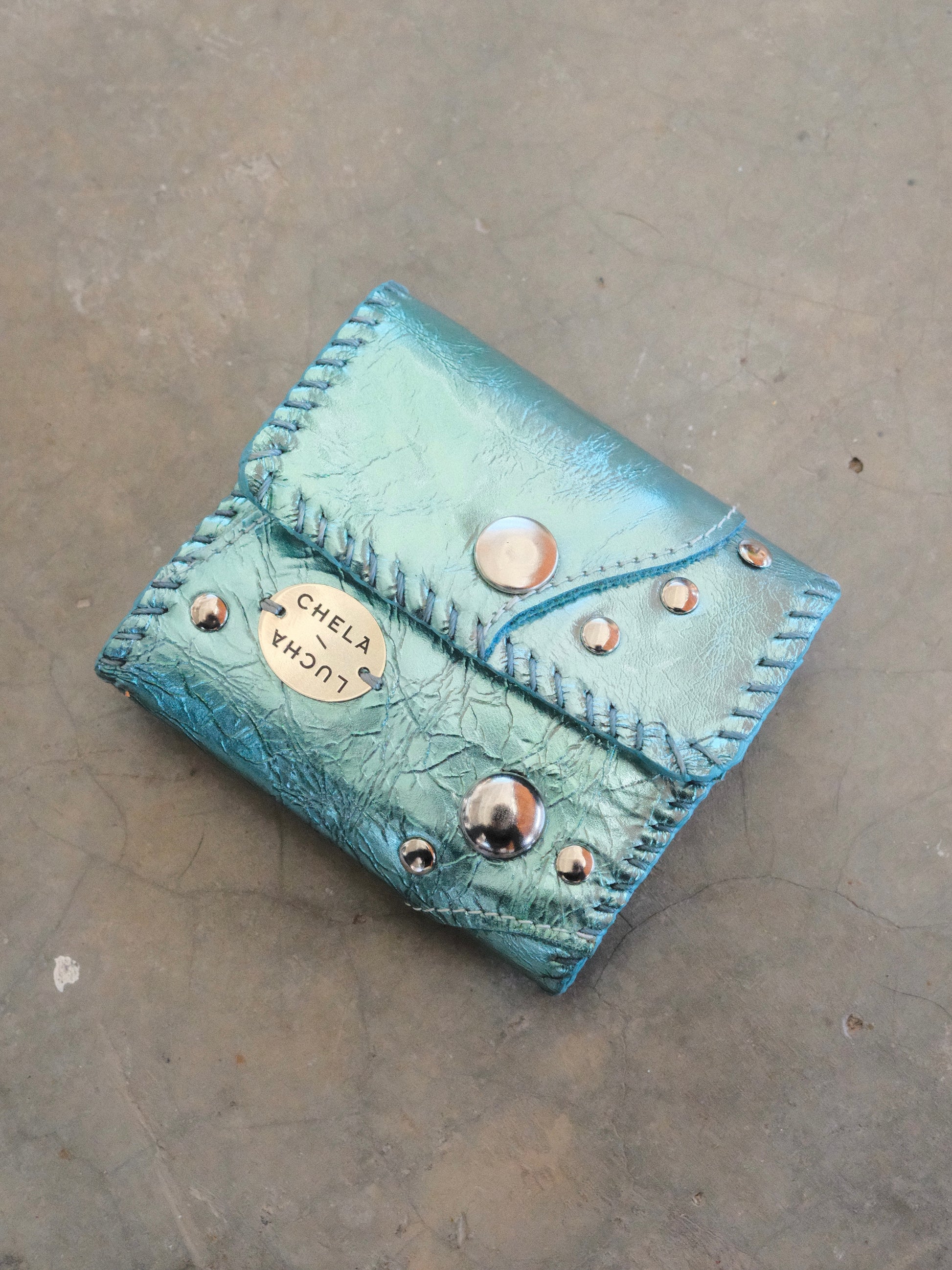 Cartera hecha con pedacera de piel en tono azul metálico. Detalles de remaches y estoperoles en tono plateado.