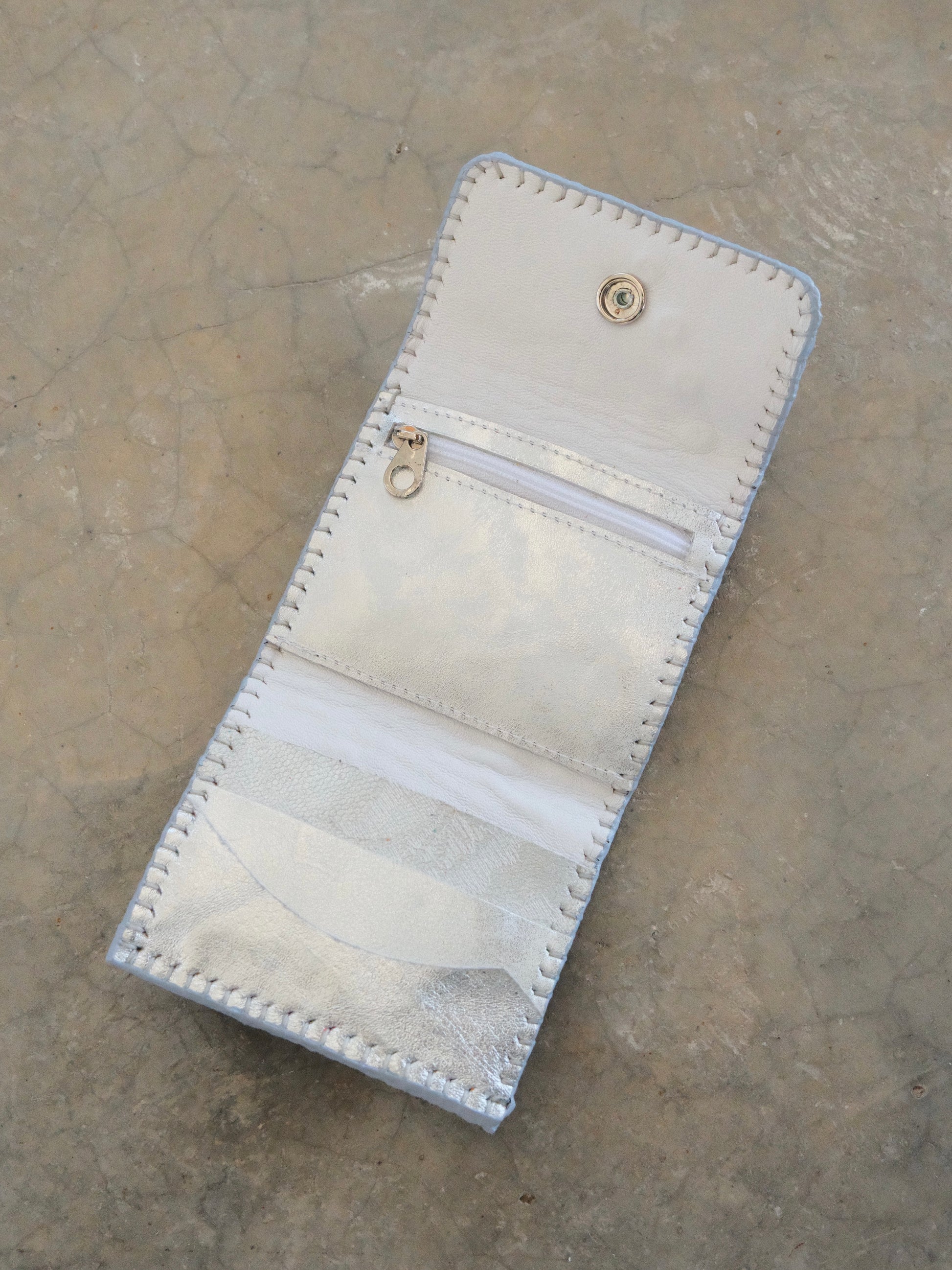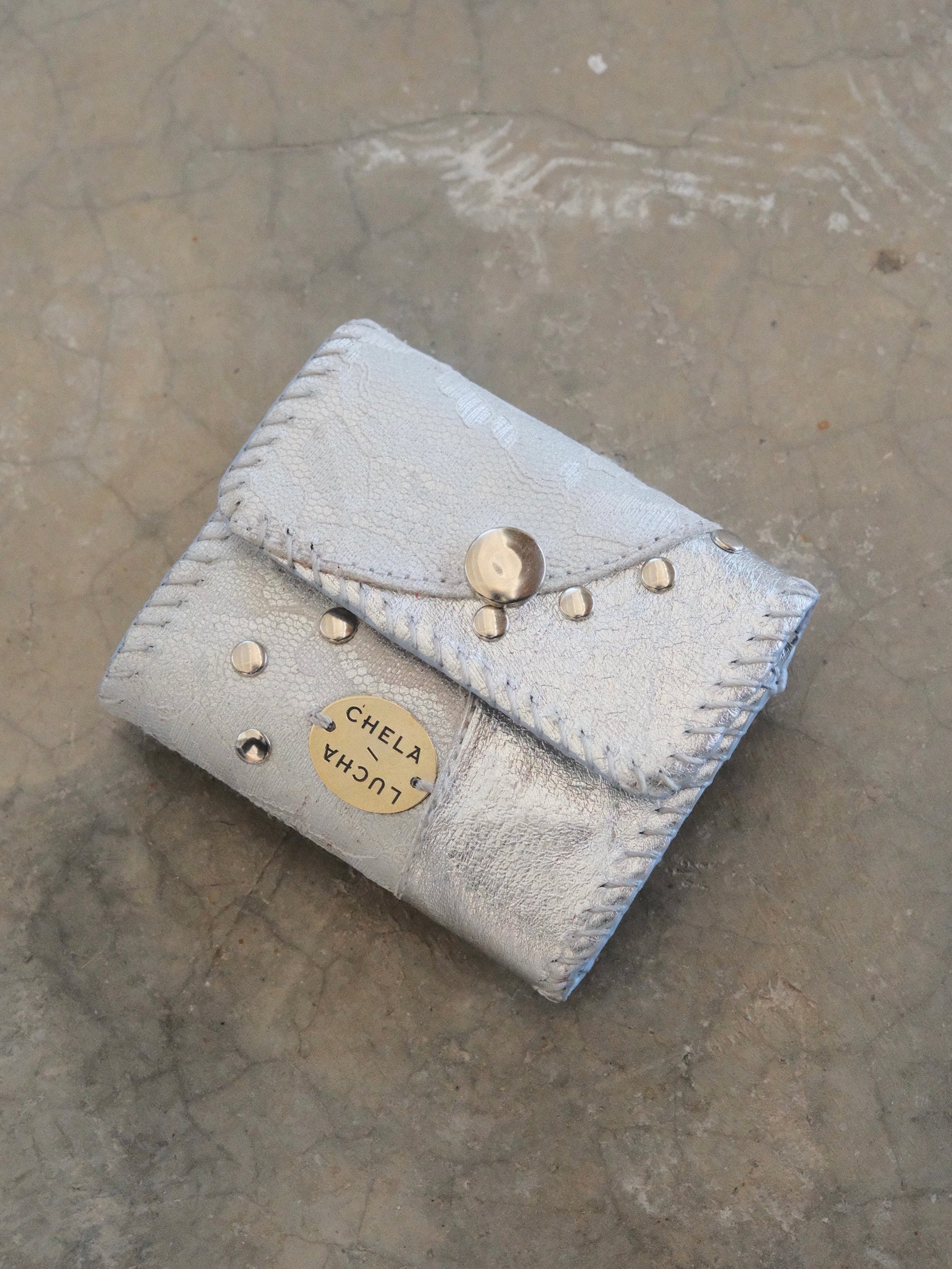 Cartera TUTI hecha con pedacera de piel en tono plateado. Detalles de estoperoles y remaches en tono plateado.